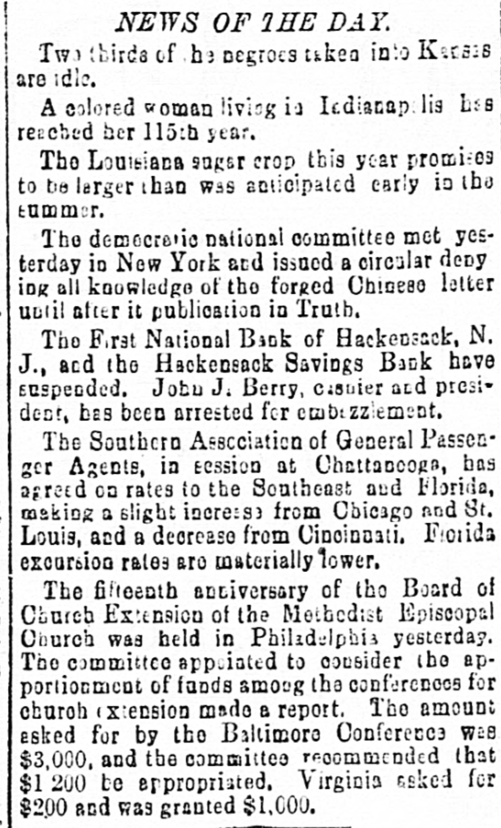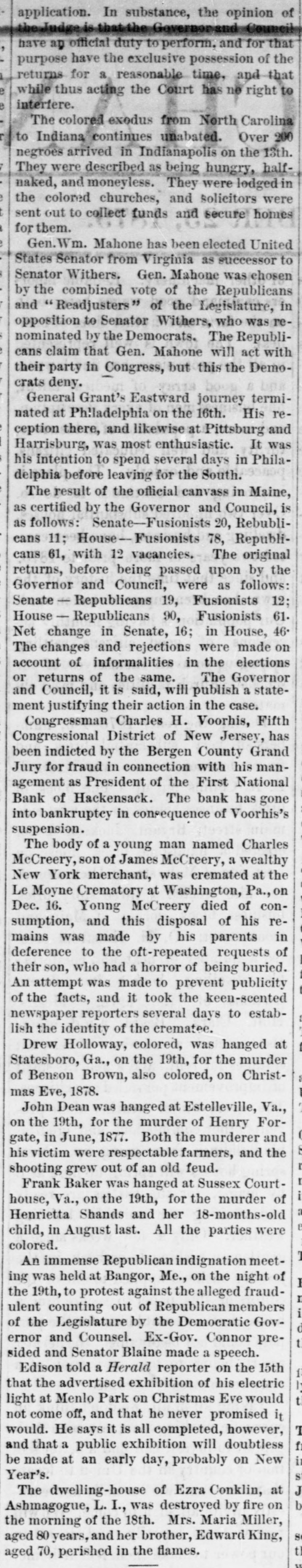 The colored exodus from North Carolina to Indiana continues unabated. Over 200 negroes arrived in Indianapolis on the 13th. They were described as being hungry, half-naked, and moneyless. They were lodged in the colored churches, and solicitors were sent out to collect funds and secure homes for them.
