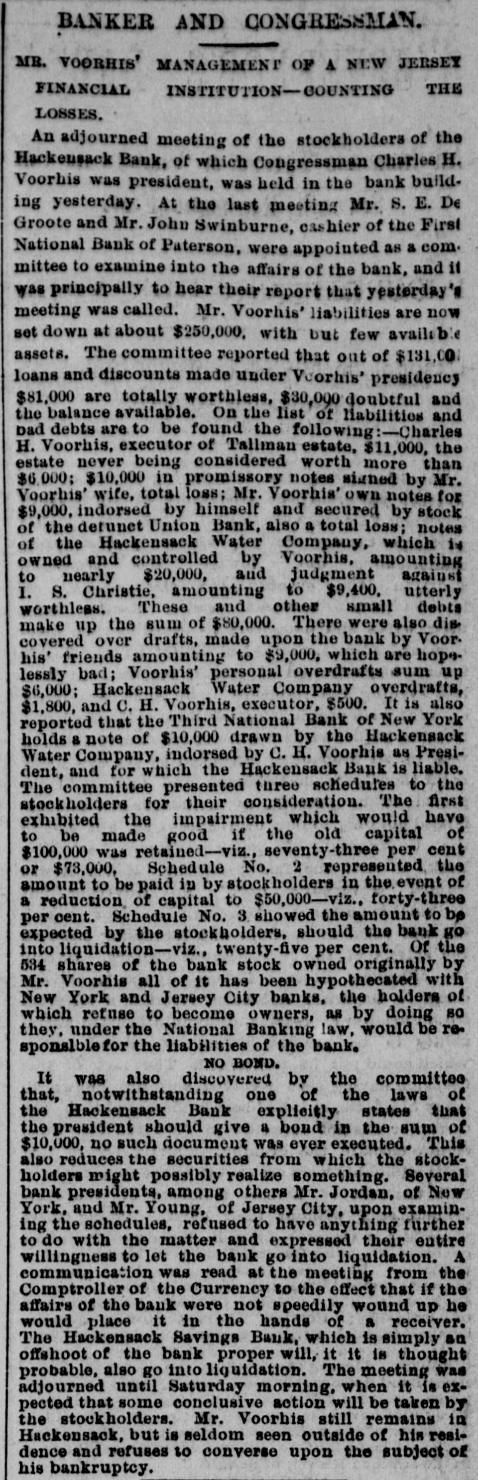 BANKER AND CONGRESSMAN. MR. VOORHIS' MANAGEMENT OF A NEW JERSEY FINANCIAL INSTITUTION-COUNTING THE LOSSES. An adjourned meeting of the stockholders of the Hackensack Bank, of which Congressman Charles H. Voorhis was president, was held in the bank building yesterday. At the last meeting Mr. S. E. De Groote and Mr. John Swinburne, cashier of the First National Bank of Paterson, were appointed as a com. mittee to examine into the affairs of the bank, and it was principally to hear their report that yesterday's meeting was called. Mr. Voorhis' liabilities are now set down at about $250,000, with but few available assets. The committee reported that out of $131,00 loans and discounts made under Voorhis' presidency $81,000 are totally worthless, $30,000 doubtful and the balance available. On the list of liabilities and pad debts are to be found the following:-Charles H. Voorhis, executor of Tallman estate, $11,000, the estate never being considered worth more than $6,000; $10,000 in promissory notes signed by Mr. Voorhis' wife, total loss; Mr. Voorhis' own notes for $9,000, indorsed by himself and secured by stock of the defunet Union Bank, also a total loss; notes of the Hackensack Water Company, which is owned and controlled by Voorhis, amounting to nearly $20,000, and judgment against I. S. Christie, amounting to $9,400. utterly worthless. These and other small debts make up the sum of $80,000. There were also discovered over drafts, made upon the bank by Voor. his' friends amounting to $9,000, which are hopelessly bad; Voorhis' personal overdrafts sum up $6,000; Hackensack Water Company overdrafts, $1,800, and C. H. Voorhis, executor, $500. It is also reported that the Third National Bank of New York holds a note of $10,000 drawn by the Hackensack Water Company, indorsed by C. H. Voorhis as President, and for which the Hackensack Bank is liable. The committee presented three schedules to the stockholders for their consideration. The first exhibited the impairment which would have to be made good if the old capital of $100,000 was retained-viz,, seventy-three per cent or $73,000, Schedule No. 2 represented the amount to be paid in by stockholders in the event of a reduction of capital to $50,000-viz., forty-three per cent. Schedule No. 3. showed the amount to be expected by the stockholders, should the bank go into liquidation-viz,, twenty-five per cent. Of the 534 shares of the bank stock owned originally by Mr. Voorhis all of it has been hypothecated with New York and Jersey City banks, the holders of which refuse to become owners, as by doing so they, under the National Banking law, would be responslble fo: the liabilities of the bank. NO BOND. It was also discovered by the committee that, notwithstanding one of the laws of the Hackensack Bank explicitly states that the president should give a bond in the sum of $10,000, no such document was ever executed. This also reduces the securities from which the stockholders might possibly realize something. Several bank presidents, among others Mr. Jordan, of New York, and Mr. Young, of Jersey City, upon examining the schedules, refused to have anything further to do with the matter and expressed their entire willingness to let the bank go into liquidation. A communication was read at the meeting from the Comptroller of the Currency to the effect that if the affairs of the bank were not speedily wound up he would place it in the hands of a receiver. The Hackensack Savings Bank, which is simply an offshoot of the bank proper will, it it is thought probable, also go into liquidation. The meeting was adjourned until Saturday morning, when it is expected that some conclusive action will be taken by the stockholders. Mr. Voorhis still remains in Hackensack, but is seldom seen outside of his residence and refuses to converse upon the subject of his bankruptcy.