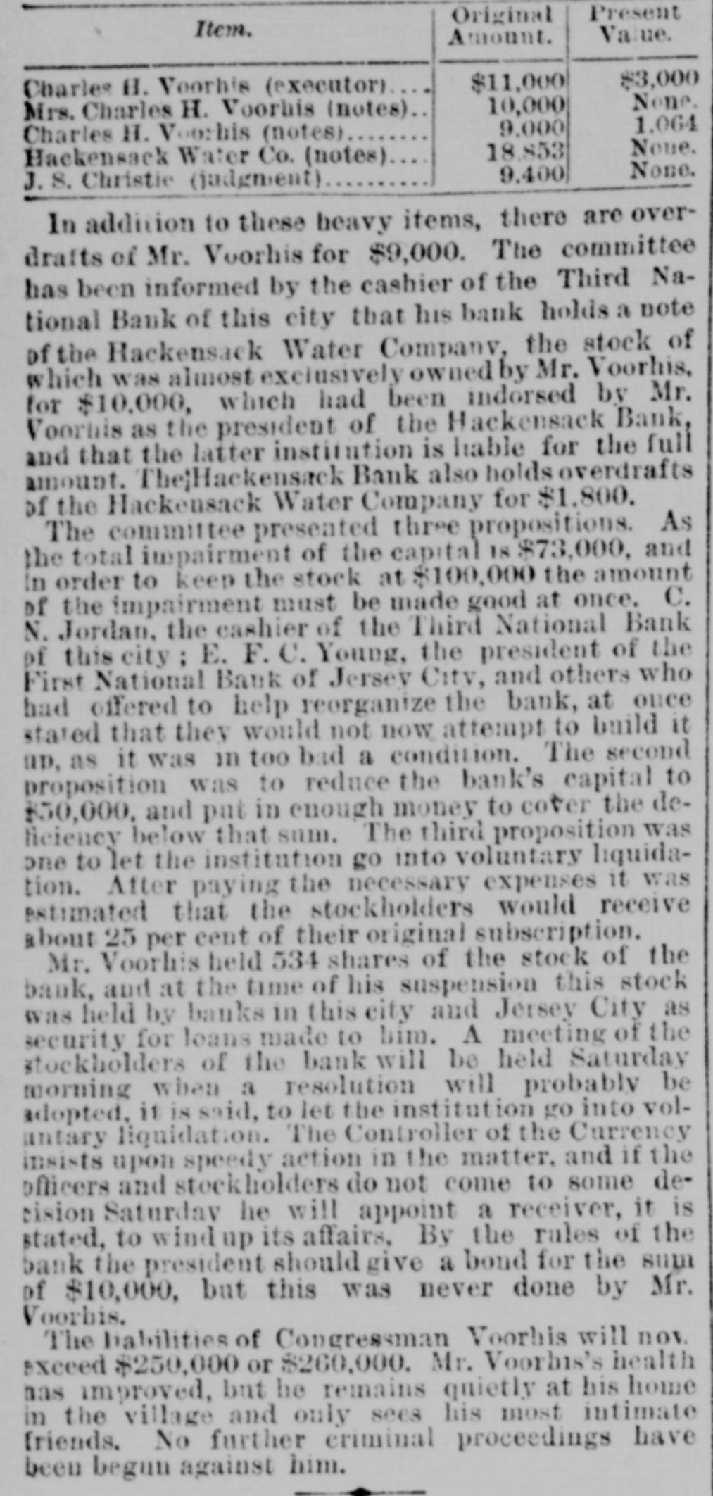 Present Original Item. Value. Amount. $3,000 $11,000 Charles H. Voorhis (executor) None. 10,000 Mrs. Charles H. Voorhis (notes) 1,064 9,000 Charles H. Voorbis (notes) None. 18,853 Hackensack Water Co. (notes) None. 9,400 J.S. Christic (judgment) In addition to these heavy items, there are overdrafts of Mr. Voorhis for $9,000. The committee has been informed by the cashier of the Third National Bank of this city that his bank holds a note of the Hackensack Water Company, the stock of which was almost exclusively owned by Mr. Voorhis, for $10,000, which had been indorsed by Mr. Voorhis as the president of the Hackensack Bank, and that the latter institution is hable for the full amount. The|Hackensack Bank also holds overdrafts of the Hackensack Water Company for $1,800. The committee presented three propositions. As the total impairment of the capital 18 $73,000, and in order to keep the stock at $100,000 the amount of the impairment must be made good at once. C. N. Jordan, the cashier of the Third National Bank of this city E. F. C. Young, the president of the First National Bank of Jersey City, and others who had offered to help reorganize the bank, at once stated that they would not now attempt to build it up, as it was in too bad a condition. The second proposition was to reduce the bank's capital to $50,000. and put in enough money to cover the deficiency below that sum. The third proposition was one to let the institution go into voluntary liquidation. After paying the necessary expenses it was estimated that the stockholders would receive about 25 per cent of their original subscription. Mr. Voorhis held 534 shares of the stock of the bank, and at the time of his suspension this stock was held by banks in this city and Jersey City as security for loans made to him. A meeting of the stockholders of the bank will be held Saturday morning when a resolution will probably be adopted, it is said, to let the institution go into volantary liquidation. The Controller of the Currency insists upon speedy action in the matter, and if the officers and stockholders do not come to some detision Saturday he will appoint a receiver, it is stated, to wind up its affairs, By the rules of the bank the president should give a bond for the sum of $10,000, but this was never done by Mr. Voorbis. The liabilities of Congressman Voorhis will nov. sxceed $250,000 or $260,000. Mr. Voorbis's health has improved, but he remains quietly at his home in the village and only sees his most intimate friends. No further criminal proceedings have been begun against him.