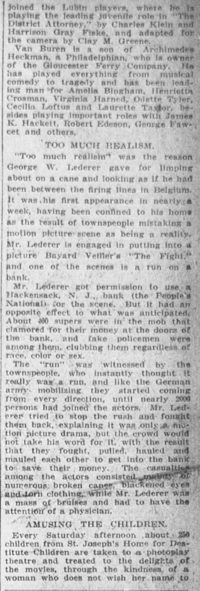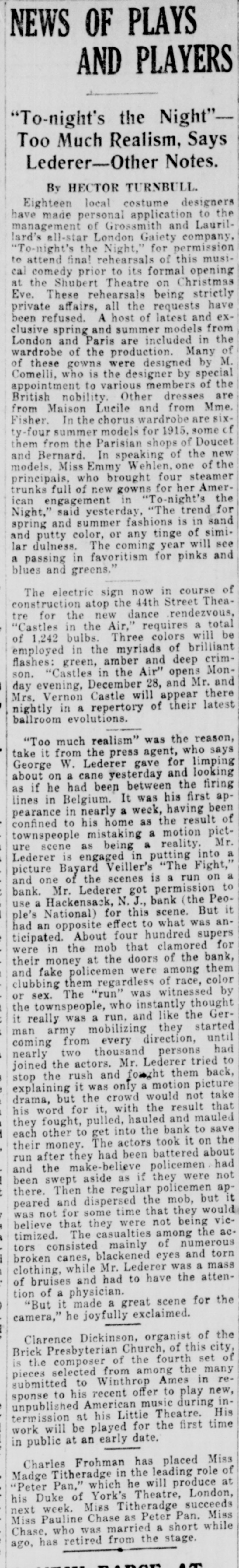 NEWS OF PLAYS AND PLAYERS "To-night's the Night"Too Much Realism, Says Lederer-Other Notes. By HECTOR TURNBULL. Eighteen local costume designers have made personal application to the management of Grossmith and Laurillard's all-star London Gaiety company, "To-night's the Night," for permission to attend final rehearsals of this musical comedy prior to its formal opening at the Shubert Theatre on Christmas Eve. These rehearsals being strictly private affairs, all the requests have been refused. A host of latest and exclusive spring and summer models from London and Paris are included in the wardrobe of the production. Many of of these gowns were designed by M. Comelli, who is the designer by special appointment to various members of the British nobility Other dresses are from Maison Lucile and from Mme. Fisher. In the chorus wardrobe are sixty-four summer models for 1915, some of them from the Parisian shops of Doucet and Bernard. In speaking of the new models, Miss Emmy Wehlen, one of the principals, who brought four steamer trunks full of new gowns for her American engagement in "To-night's the Night," said yesterday, "The trend for spring and summer fashions is in sand and putty color, or any tinge of similar dulness. The coming year will see a passing in favoritism for pinks and blues and greens." The electric sign now in course of construction atop the 44th Street Theatre for the new dance rendezvous, "Castles in the Air," requires a total of 1,242 bulbs. Three colors will be employed in the myriads of brilliant flashes: green, amber and deep crimson. "Castles in the Air" opens Monday evening, December 28, and Mr. and Mrs. Vernon Castle will appear there nightly in a repertory of their latest ballroom evolutions. "Too much realism" was the reason, take it from the press agent, who says George W. Lederer gave for limping about on a cane yesterday and looking as if he had been between the firing lines in Belgium. It was his first appearance in nearly a week, having been confined to his home as the result of townspeople mistaking a motion picture scene as being a reality. Mr. Lederer is engaged in putting into a picture Bayard Veiller's "The Fight," and one of the scenes is a run on a bank. Mr. Lederer got permission to use a Hackensack, N. J., bank (the People's National) for this scene. But it had an opposite effect to what was anticipated. About four hundred supers were in the mob that clamored for their money at the doors of the bank, and fake policemen were among them clubbing them regardless of race, color or sex. The "run" was witnessed by the townspeople, who instantly thought it really was a run, and like the German army mobilizing they started coming from every direction, until nearly two thousand persons had joined the actors. Mr. Lederer tried to stop the rush and fought them back, explaining it was only a motion picture drama, but the crowd would not take his word for it, with the result that they fought, pulled, hauled and mauled each other to get into the bank to save their money. The actors took it on the run after they had been battered about and the make-believe policemen had been swept aside as if they were not there. Then the regular policemen appeared and dispersed the mob, but it was not for some time that they would believe that they were not being victimized. The casualties among the actors consisted mainly of numerous broken canes, blackened eyes and torn clothing, while Mr. Lederer was a mass of bruises and had to have the attention of a physician. "But it made a great scene for the camera," he joyfully exclaimed. Clarence Dickinson, organist of the Brick Presbyterian Church, of this city, is the composer of the fourth set of pieces selected from among the many submitted to Winthrop Ames in response to his recent offer to play new, unpublished American music during intermission at his Little Theatre. His work will be played for the first time in public at an early date. has placed. Miss