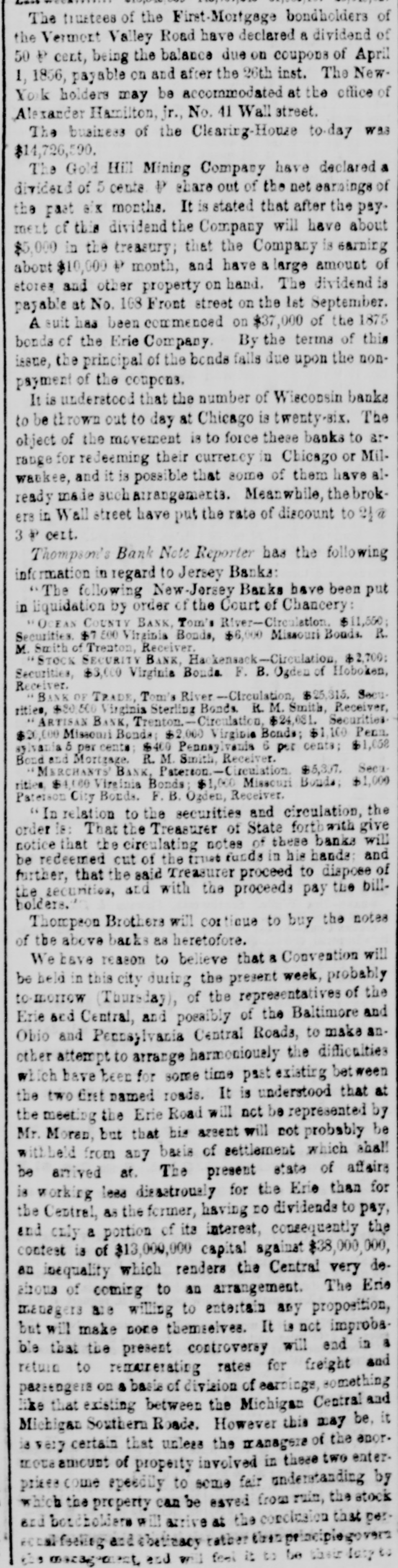The trustees of the First-Mortgage bondholders of the Vermert Valley Road have declared 8 dividend of 50 P cent, being the balance due on coupons of April 1, 1856, payable on and after the 26th inst. The New York holders may be accommodated at the office of Alexander Hamilton, jr., No. 41 Wall street. The business of the Clearing-House to-day was $14,726,590. The Gold Hill Mining Company have declared a divided of 5 cente ₽ share out of the net earnings of the past six months. It is stated that after the payment of this dividend the Company will have about $5,000 in the treasury; that the Company is earning about $10,000 P month, and have a large amount of stores and other property on hand. The dividend is payable at No. 108 Front street on the 1st September. A suit has been commenced on $37,000 of the 1875 bonds of the Erie Company By the terms of this issue, the principal of the bends falls due upon the nonpayment of the coupons. It is understood that the number of Wieconsin banks to be thrown out to day at Chicago is twenty-six. The object of the movement is to force these banks to are range for redeeming their currency in Chicago or Milwaukee, and it is possible that some of them have already made such arrangements. Meanwhile, the brokere in Wall street have put the rate of discount to 21/a 3 ₽ cell. Thompson's Bank Note Reporter has the following information in regard to Jersey Banks: The following -Jersey Banks have been put in liquidation by order of the Court of Chancery: OCEAN COUNTY BANK, Tom's River-Circulation $11,550; Securities $7.500 Virginia Bonds, $6,000 Missouri Bonds. R. M. Smith of Treaton, Receiver. STOCK SECURITY BANK Ha kensack-Circulation $2,700: Securities, $3,000 Virginia Bonda F. B. Ogden of Hoboken, Receiver. BANK OF TRADE Tom's River-Circulation $25,315. Sec rities, $80,500 Virginia Sterling Bonds. R. M. Smith, Receiver, ARTISAN BANK Trenton.- Circulation, $24,081. Securities $20,000 Missouri Bonds: $2,000 Virgibia Bonds: $1,100 Peon sylvania per cents $400 Pennsylvania 6 per cents; $1,058 Bond and Mortgage. R. M. Smith Receiver. MERCHANTS BANK, sterson.-Circulation $5,397. Secu rities, $4.00 Vireinia Bonds $1,000 Missouri Bond, $1,000 Pateison City Bonds. Ogden, Receiver. In relation to the securities and circulation, the order is: That the Treasurer of State fortbwith give notice that the circulating notes of these banks will be redeemed cut of the truet funds in his hands: and further, that the said Treasurer proceed to dispose of the securities, and with the proceeds pay the billholders. Thorpson Brothers will cortique to buy the notes of the above backs 88 heretofore. We have reason to believe that & Convention will be held in this city during the present week, probably to-monrow (Thursday), of the representatives of the Erie and Central, and poeably of the Baltimore and Obio and Pennsylvania Central Roads, to make another attempt to arrange harmoniously the difficulties which have been for some time past existing bet ween the two Gret named roads. It is understood that at the meeting the Erie Road will nct be represented by Mr. Moran, but that bis agent will not probably be withbeld from any basis of settlement which shall be arrived ar. The present state of affairs is working less disastrously for the Erie than for the Central, as the former, having DO dividends to pay, and only a portion of its interest, consequently the contest is of $13,000,000 capital against $38,000,000, an inequality which renders the Central very de. alious of coming to an arrangement. The Erie managers are willing to entertain any proposition, but will make none themselves. It is not improbaa ble that the present controversy will end in return to removerating rates for freight and pareengers on & basis of division of earnings, something ke that existing between the Michigan Central and Michigan Southern Roade. However this may be, it is very certain that unless the managere of the enor. more amount of property involved in these two enterprices come speedily to some fair understanding by which the property can be eaved from ruin, the stock betcheldere . III arrive at the conclusion that per and ebeticacy rather tiremprinciplegovern is, manager and will feel it to be their Hotpito