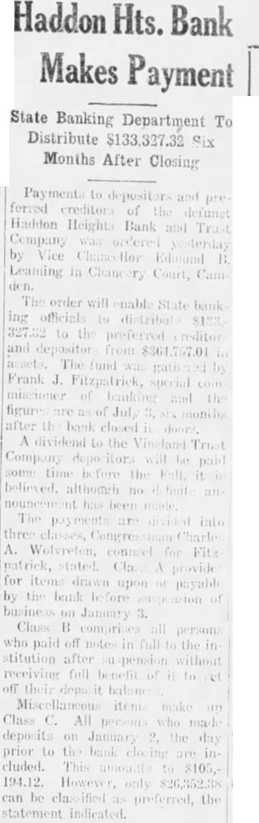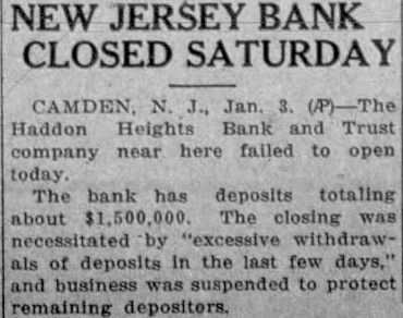 Bank In New Jersey Suspends Business Haddon Heights Firm Officials Say "Excessive Necessitated Move Camden. Haddon Heights Bank Trust Company. Haddon near failed today. deposits totaling about The closing was tated missal the last few days, and business suspended remaining depositors. The directors be able ceeded organize the bank's affairs and they did not know how would take. Edward Deibert, an officer Reading Railway, president Jarratt (Va.) Bank Closes State Banking Department was formed today Bank In Jarratt, Sussex failed today. Close Days State Bank suspended period five The had deposits approximately and profits about