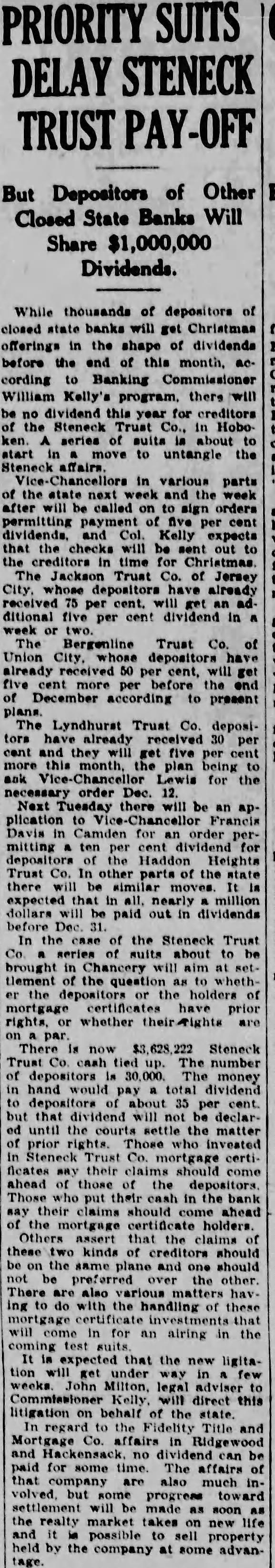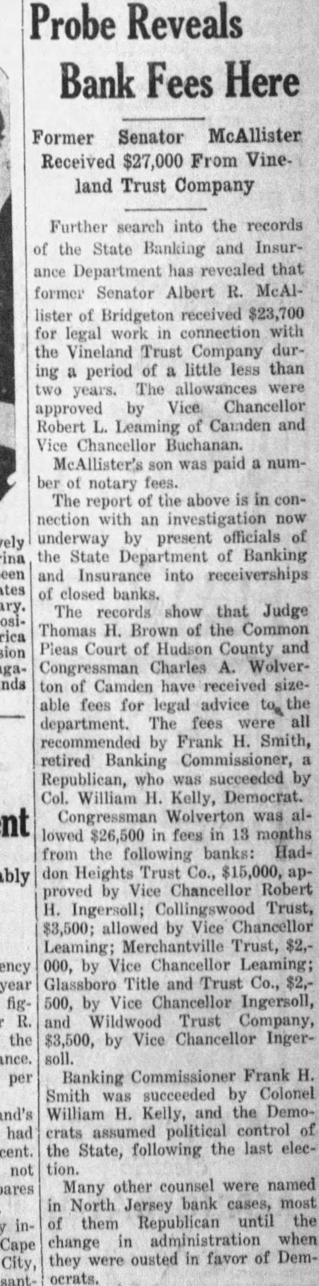 Reveals Bank Fees Former Senator McAllister Received From land Trust Company Further search into the records the State Banking and InsurDepartment has revealed that former Senator Albert R. McAllister of Bridgeton received for legal work in connection with the Vineland Trust Company durof little less than period a The allowances were years. by Vice Chancellor approved Robert Leaming of Camden and Chancellor Buchanan. McAllister's son was paid a numnotary fees. The report of the above nection with an investigation now by officials of underway present the State Department of Banking been and Insurance into receiverships of closed banks. The records show that Judge Thomas H. Brown of the Common Pleas Court of Hudson County and Charles Wolverof Camden have received sizefees for legal advice the The fees all department. recommended by Frank H. Smith, retired Banking Commissioner, Republican, who was succeeded by William H. Kelly, Democrat. Congressman Wolverton was lowed $26,500 in fees in 13 months from the following banks: Haddon Heights Trust Co., proved by Vice Chancellor Robert Ingersoll; Collingswood Trust, $3,500; allowed by Vice Chancellor Leaming; Merchantville Trust, $2,000, by Vice Chancellor Leaming; Glassboro Title and Trust 500, by Vice Chancellor Ingersoll, and Trust Company, $3,500, by Vice Chancellor Ingersoll. Banking Commissioner Frank Smith succeeded by Colonel was William and the DemoKelly, crats political control of the following the last elecState, tion. Many other counsel were named North Jersey bank cases, most of them Republican until the in administration when change they were ousted in favor of Democrats.