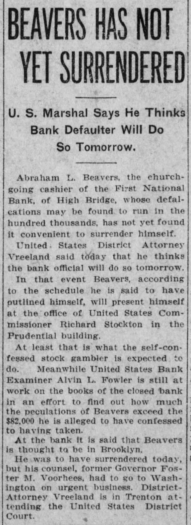 BEAVERS HAS NOT YET SURRENDERED U. S. Marshal Says He Thinks Bank Defaulter Will Do So Tomorrow. Abraham L. Beavers, the churchgoing cashier of the First National Bank, of High Bridge, whose defalcations may be found to run in the hundred thousands, has not yet found it convenient to surrender himself. United States District Attorney Vreeland said today that he thinks the bank official will do so tomorrow. In that event Beavers, according to the schedule he is said to have putlined himself, will present himself at the office of United States Commissioner Richard Stockton in the Prudential building. At least that is what the self-confessed stock gambler is expected to do. Meanwhile United States Bank Examiner Alvin L. Fowler is still at work on the books of the closed bank in an effort to find out how much the peculations of Beavers exceed the $82,000 he is alleged to have confessed to having taken. At the bank it is said that Beavers is thought to be in Brooklyn. He was to have surrendered today, but his counsel, former Governor Foster M. Voorhees, had to go to Washington on urgent business. DistrictAttorney Vreeland is in Trenton attending the United States District Court.
