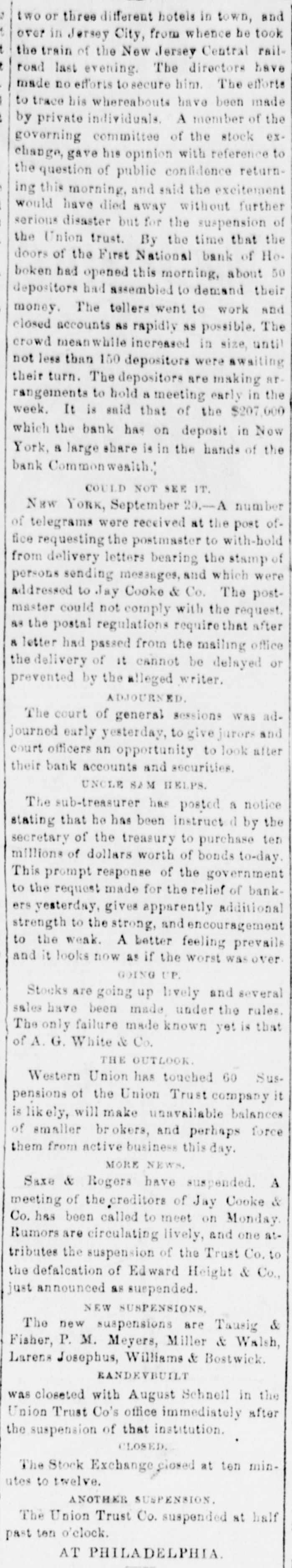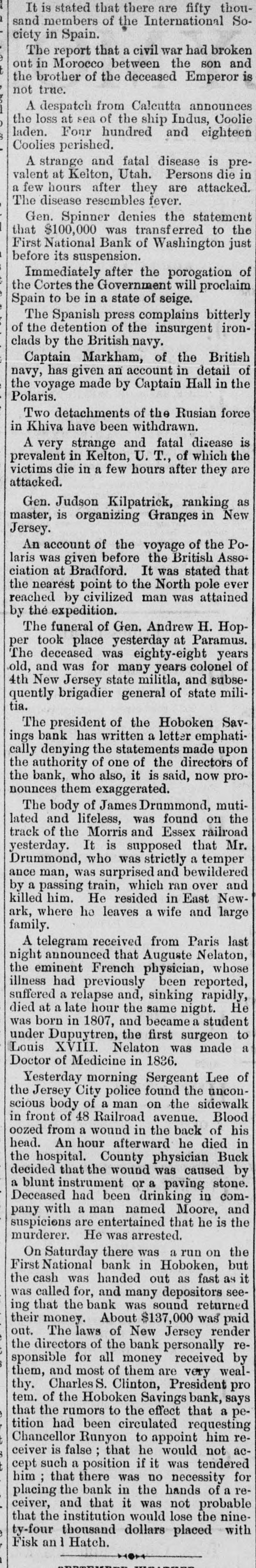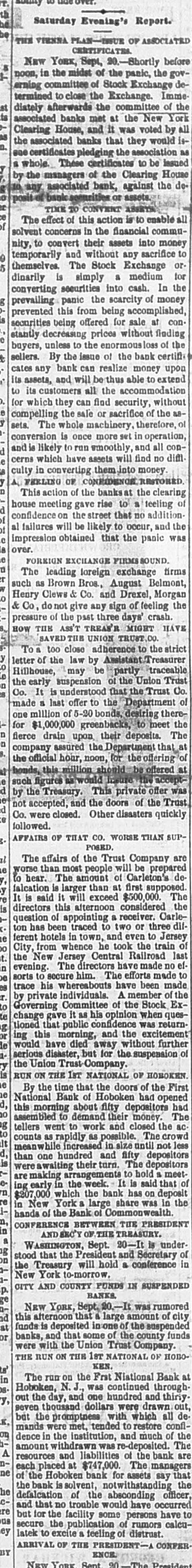 Monday was carried through with a ritsh Government had purchased $10,000,000 in bonds, but this had not relieved the street. Everybody had bonds, and everybody wanted the cash for them. A run had been made on the First National Bank of Hoboken, but up to the hour of closing it had paid all demands. One reason for therun was the fact that it had $207,0 of its funds locked up in the Bank of the Commonwealth, which had suspended. The President had reached New York and had arranged for conference with the Secretary of the Treasury and leading New York financiers on the following day. The President had expressed full determination to use the power of the Treasury to the etc. tent of $16,000,000 balance and $44,000,000 reserves. Among others the following addid tional firms had failed Ketchum & Belknap E. C. Brodhead; Saxe & Rogers; Taussig & Fisher; P. M. Meyers; Miller & Walsh Lorenz Josephs; Fearing & Dillinger; Wil liams & Bostwick. The extent of the shrinkage in stock values for the week ending the 20th had been, on some of the leading lines, as follows: Harlem, 393 per cent.; Western Union, 35; Panama, 32: Wa bash, 23; Northwestern 19: Rock Island, 191/2 total shrinkage, according to the best authorities, of over $100,000,000. Telegrams from Philadelphia, of the 20th, state that since the preceding day a better feeling had prevailed in financial circles. It was thought that the crisis had been passed. The run upon the Fidelity Deposit had continued up to the time of closing the institution on the 20th, and every claim had been met. Dur ing the day over $950,000 had been paid out over the paying teller's desk. The Union Banking Company had suspended. The failure was said to have been bad one, and that it would not be able to settle up at over 50 cents on the dollar. San Francisco dispatches of the 20th say that, so far, the Pacific coast interests had not been compromised by the embarrassments in the East. No trouble was apprehenped to general business, except the increased degree of caution Incident to such state of things. A St. Louis dispatch of the 20th announced that the banking firm of Taussig, Gemp & Co. had suspended, in consequence of the suspension of Taussig, Fisher & Co. of New York, of which house it was branch. According to a dispatch from San Francisco of the 20th, fire had broken out in the Yellow Jacket Mine, In Nevada, In the 1,300 foot level. Six lives had been lost. At last accounts the fire had been got under control. A Memphis dispateh of the 20th says the ravages of the yellow fever in that city had been stayed somewhat. The disease had ap peared in New Orleans, and the dengue or break bone fever raged also as an epidemic, In Shreveport the fever exhibited no abate ment. New cases were not so numerous, but the ratio of deaths had been fully as great as at any time since the appearance of the scourge. A telegram from Burlington, Iowa, dated September 20, says that a destructive fire had broken out in the heart of the city at one o'clock in the morning of that day, which swept over two squares before it could be checked. The estimated loss reached $200,000. The Grand Lodge of the I. O. of O.F., in session at Baltimore, Md., adjourned on the 20th, having first voted to hold the next annual Communication at Atlanta, Ga. to News from Washington on the 21st was the effect that the Comptroller of the Currency had directed the collection paper of the First National Bank of Washington to be deposited with the National Metropolitan Bank for collection. The result of the conference held in New York on the 21st, between the President and Secretary of the Treasury and leading financiers, had been the issuance of an order directing the purchase of all five-twenties offered at private sale. It was thought that this measure would release $20,000,000 to $25,000,000 greenbacks, without touching the reserves. The bank statement for New York appeared on the evening of the 20th. From that it appeared that they had sustained loss of $1,579,700 specie and $2,409,300 legal tenders, contraction of $6,114,500 in loans and $9,277, 400 in deposits, during the week ending on that date. In anticipation of a run upon their institutions, the Inter-Occan of the 22d says that the Presidents of the fourteen savings banks of Chicago had conference on the 21st, and mutually agreed to hereafter insist upon requiring thirty days' notice for the with drawal of deposits, according to their respective rules. An Augusta, Ga., dispatch of the 22d says that on the 19th a terrific storm passed over Florida in the vicinity of Tallahassee. A large number of dwellings had been blown down, and the crops in all that section ruined. Three or four lives had been lost, several persons persons injured and large number of cattle killed. The town of St. Marks had been completely washed away, only two houses being left standing, and twenty families had been made homeless. The town of Newport had also been swept out of existence. A telegram from Philadelphia, of the the 22d, says that the financial horizon had better and clearer outlook, and that by the following day matters would resume their normal condition. The Citizens', the Iron, the State and the Keystone banks had temporarily suspended, but arrangements had been made to enable them to resume immediately. A New York dispatch of the 22d says that the financial atmosphere had become much clearer. The business of the day had developed remarkable strength in the banks, only two of them finding it necessary to call for loan certificates at the Clearing House. The Stock Exchange had not been opened, though set tlements were making on generally satisfacin tory terms. It was thought that business the stock line would speedily be resumed. A Washington dispatch of the 22d says that the President and Secretary of the Treasury had reached that city. The President felt confident that the right method had been hit upon to afford help from the Treasury, and the general conclusion r