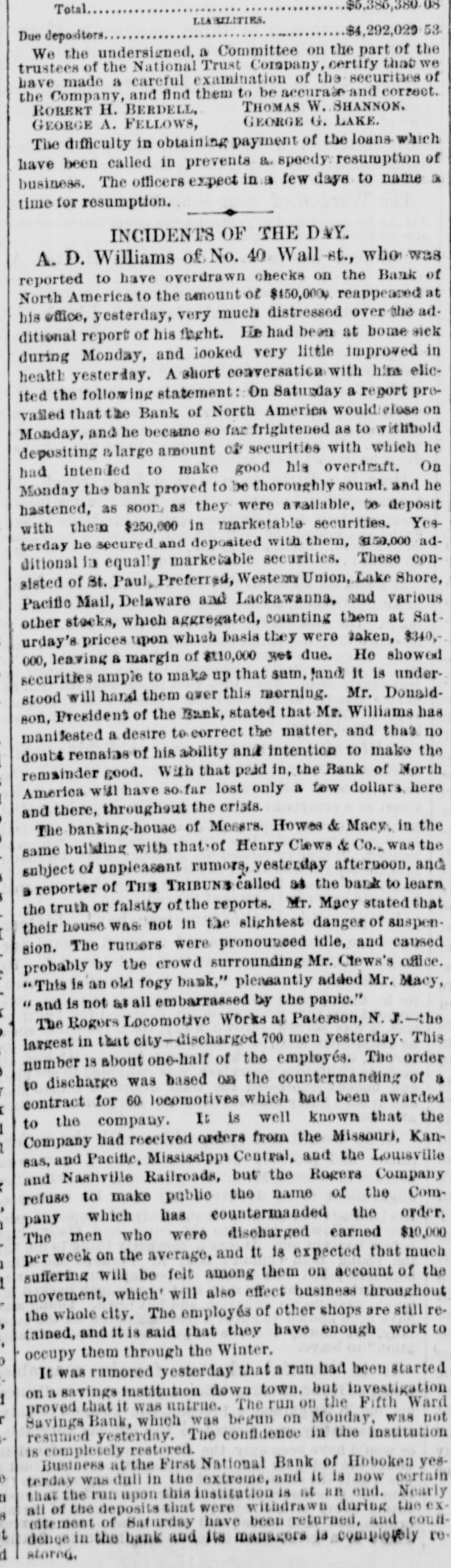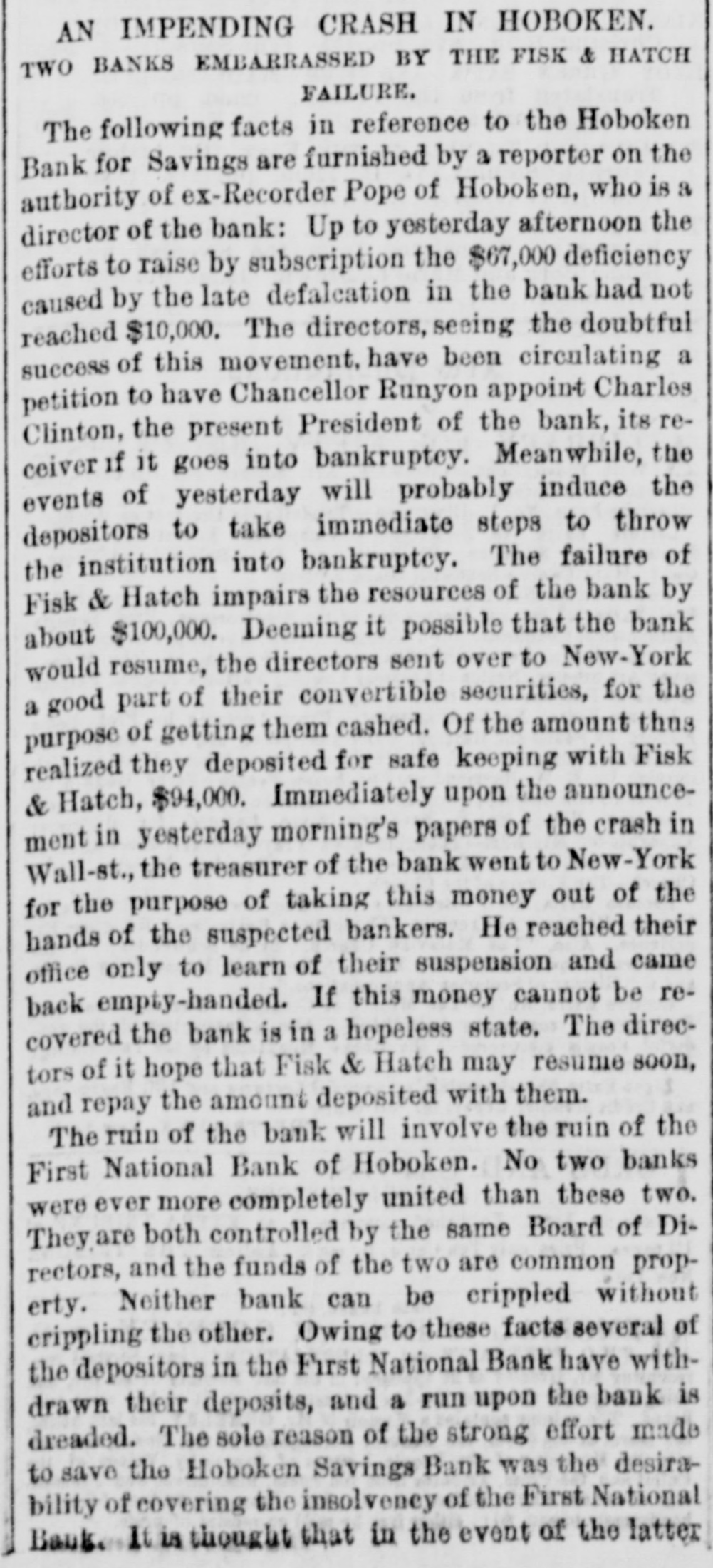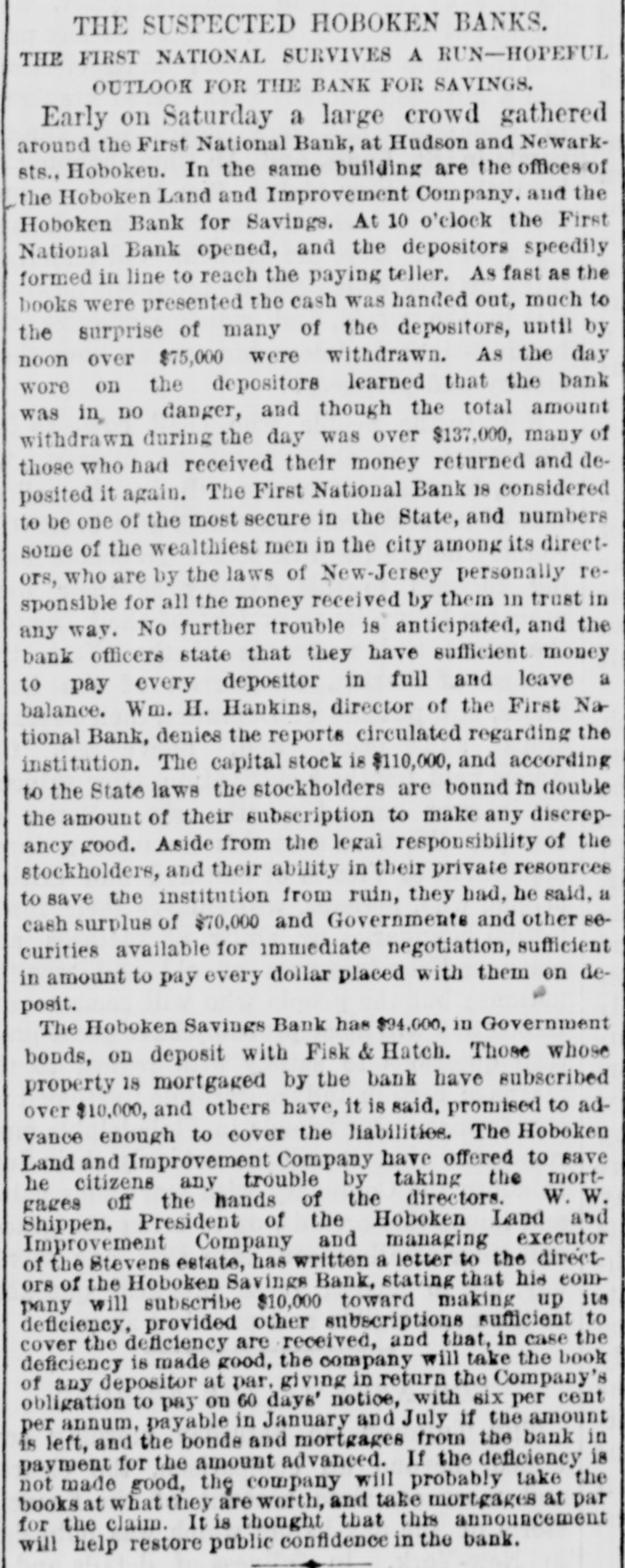 Monday was carried through with a ritsh Government had purchased $10,000,000 in bonds, but this had not relieved the street. Everybody had bonds, and everybody wanted the cash for them. A run had been made on the First National Bank of Hoboken, but up to the hour of closing it had paid all demands. One reason for therun was the fact that it had $207,0 of its funds locked up in the Bank of the Commonwealth, which had suspended. The President had reached New York and had arranged for conference with the Secretary of the Treasury and leading New York financiers on the following day. The President had expressed full determination to use the power of the Treasury to the etc. tent of $16,000,000 balance and $44,000,000 reserves. Among others the following addid tional firms had failed Ketchum & Belknap E. C. Brodhead; Saxe & Rogers; Taussig & Fisher; P. M. Meyers; Miller & Walsh Lorenz Josephs; Fearing & Dillinger; Wil liams & Bostwick. The extent of the shrinkage in stock values for the week ending the 20th had been, on some of the leading lines, as follows: Harlem, 393 per cent.; Western Union, 35; Panama, 32: Wa bash, 23; Northwestern 19: Rock Island, 191/2 total shrinkage, according to the best authorities, of over $100,000,000. Telegrams from Philadelphia, of the 20th, state that since the preceding day a better feeling had prevailed in financial circles. It was thought that the crisis had been passed. The run upon the Fidelity Deposit had continued up to the time of closing the institution on the 20th, and every claim had been met. Dur ing the day over $950,000 had been paid out over the paying teller's desk. The Union Banking Company had suspended. The failure was said to have been bad one, and that it would not be able to settle up at over 50 cents on the dollar. San Francisco dispatches of the 20th say that, so far, the Pacific coast interests had not been compromised by the embarrassments in the East. No trouble was apprehenped to general business, except the increased degree of caution Incident to such state of things. A St. Louis dispatch of the 20th announced that the banking firm of Taussig, Gemp & Co. had suspended, in consequence of the suspension of Taussig, Fisher & Co. of New York, of which house it was branch. According to a dispatch from San Francisco of the 20th, fire had broken out in the Yellow Jacket Mine, In Nevada, In the 1,300 foot level. Six lives had been lost. At last accounts the fire had been got under control. A Memphis dispateh of the 20th says the ravages of the yellow fever in that city had been stayed somewhat. The disease had ap peared in New Orleans, and the dengue or break bone fever raged also as an epidemic, In Shreveport the fever exhibited no abate ment. New cases were not so numerous, but the ratio of deaths had been fully as great as at any time since the appearance of the scourge. A telegram from Burlington, Iowa, dated September 20, says that a destructive fire had broken out in the heart of the city at one o'clock in the morning of that day, which swept over two squares before it could be checked. The estimated loss reached $200,000. The Grand Lodge of the I. O. of O.F., in session at Baltimore, Md., adjourned on the 20th, having first voted to hold the next annual Communication at Atlanta, Ga. to News from Washington on the 21st was the effect that the Comptroller of the Currency had directed the collection paper of the First National Bank of Washington to be deposited with the National Metropolitan Bank for collection. The result of the conference held in New York on the 21st, between the President and Secretary of the Treasury and leading financiers, had been the issuance of an order directing the purchase of all five-twenties offered at private sale. It was thought that this measure would release $20,000,000 to $25,000,000 greenbacks, without touching the reserves. The bank statement for New York appeared on the evening of the 20th. From that it appeared that they had sustained loss of $1,579,700 specie and $2,409,300 legal tenders, contraction of $6,114,500 in loans and $9,277, 400 in deposits, during the week ending on that date. In anticipation of a run upon their institutions, the Inter-Occan of the 22d says that the Presidents of the fourteen savings banks of Chicago had conference on the 21st, and mutually agreed to hereafter insist upon requiring thirty days' notice for the with drawal of deposits, according to their respective rules. An Augusta, Ga., dispatch of the 22d says that on the 19th a terrific storm passed over Florida in the vicinity of Tallahassee. A large number of dwellings had been blown down, and the crops in all that section ruined. Three or four lives had been lost, several persons persons injured and large number of cattle killed. The town of St. Marks had been completely washed away, only two houses being left standing, and twenty families had been made homeless. The town of Newport had also been swept out of existence. A telegram from Philadelphia, of the the 22d, says that the financial horizon had better and clearer outlook, and that by the following day matters would resume their normal condition. The Citizens', the Iron, the State and the Keystone banks had temporarily suspended, but arrangements had been made to enable them to resume immediately. A New York dispatch of the 22d says that the financial atmosphere had become much clearer. The business of the day had developed remarkable strength in the banks, only two of them finding it necessary to call for loan certificates at the Clearing House. The Stock Exchange had not been opened, though set tlements were making on generally satisfacin tory terms. It was thought that business the stock line would speedily be resumed. A Washington dispatch of the 22d says that the President and Secretary of the Treasury had reached that city. The President felt confident that the right method had been hit upon to afford help from the Treasury, and the general conclusion r
