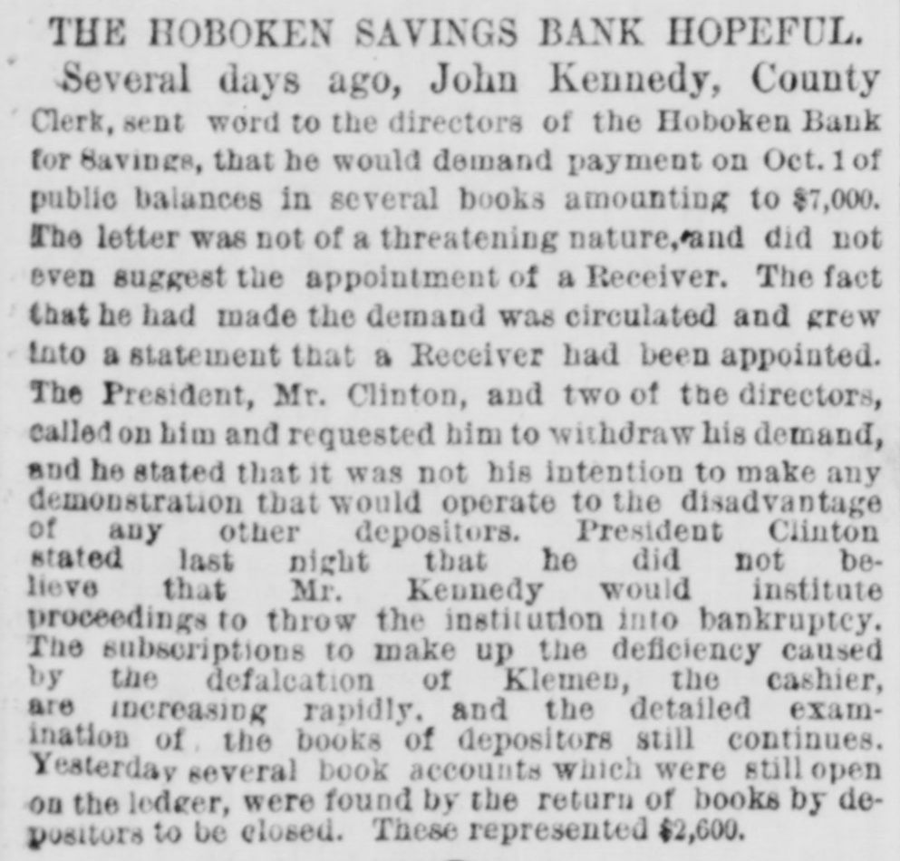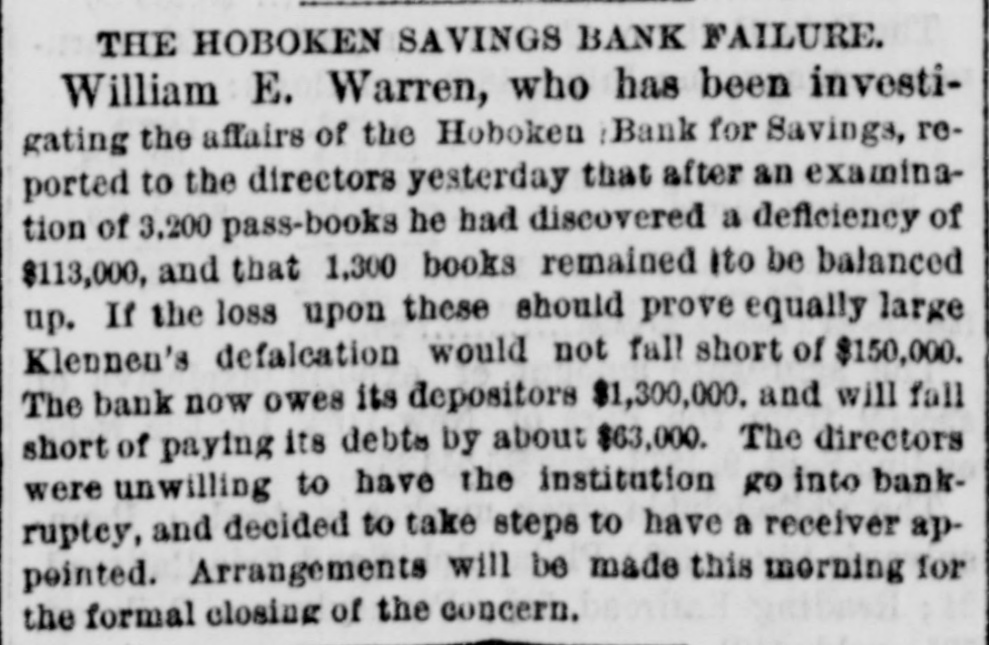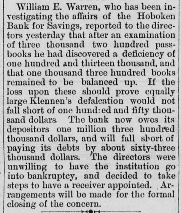 NEW-JERSEY. JERSEY CITY.-The average register of the public schools during March was 9,275, and the attendance 8,273 Bishop Odenheimer will administer the rite of confirmation at St. Mark's P. E. Church next Sunday The names of the last jury to be drawn under the old law were announced yesterday. Hereafter jurors will be selected under the newly-appointed Jury Commission The Board of Finance and Taxation authorized, yesterday. the issue of $200,000 in water bonds, not from 15 to 50 years, which are to be sold for cent of their face value. The Board was fixed at $4,000, and running less Clerk than of the 95 per salary that of of the the the Chief-Engineer at $6,000 An outgoing train on Pennsylvania Railroad struck the rear platform of a Pavonia horse-car, at the Newark-ave. crossing, Monday night, and demolished it. No one was hurt. There are 87 patients in the new County Lunatic AsySheriff Beinhardt removed to the State Prison at yesterday. Owen Casey, James Blake, George and William Howard William on the Pennsylvania Trenton, was Williams, injured Railroad, Smith, March who 11, had his arm amputated, yesterday, at the Charity HosO'Connor and Terence Scannell were in the Quarter Sessions, convicted pital Bantley yesterday, costs each of an assault on John Hanlon, and fined $25 and Neil O'Donneil of the firm of O'Donnell Bros.. coopers, at Washington and Morris-sts., was held in $5,000 bail, yesterday, for obstructing the sidewalks with barrels. He was notified February 15 to remove the obstructions, The under a penalty of $50 a day, and failed to do 80. fine now amounts to $3,000. A. P. Barnes has been reelected President and Geo. W. Firth Secretary of the Jersey City Chess Club NEWARK.-William Dougherty, who escaped from the Court-house on Monday, was arrested at his mother's house, yesterday. He has been committed to await senThe store of Glaze & Hastings was entered, on It tence night, and robbed of a quantity of clothing. the that the robbery was William Thompson, who made his escape Monday is by thought by police committed from Mon- the Court-house in company with William Dougherty, afternoon Charles Knoel of No. 4 Charlwas arrested. yesterday, an assault and battery upon cious day ton-st. John for Young atroThe Presbytery of Newark met in the Second Presbyterian Church, yesterday, and elected the Rev. DR. of Montelair, Moderator, and the clerk A man Eddy Berry of Woodside, named Rev. Charles attaché Clarence Bron- of is representing himself in New-York as an son Newark paper,and has obtained money on the strength He is an imposter, and is not to paper in this city The a of known his representations. any incorporators holding an of Industrial Exhibition propose next Fall, that will be the exhibition Newark much superior for permanent to that A building will be erected The Committee library plan have sider exhibition of last the year. free purposes reported appointed adversely. to con- to They mention the great expense such institutions are cities, and refer to the terms upon which books are other drawn from the present library as being within the reach of all. TRENTON.-The April Term of the United States Dismorning, and Judge Nixon charged the was triet sworn. Court 1 met yesterday obscene jurors the publications, Grand with special Jury reference to the abuse of sending deadve ertisements, &c., through the mails, and such matter in the post-offices. City was the center of this positing medical New-York vile He and said corrupt- that the ing stream of poisonous publications, and charged to indict all who may be found using the postor mails for such traffie in held a special session, yesterday, jurors office of Pardons New-Jersey Italian, who to The hear is under Court the application of Luigi Lusignani, an his of death in Morris County for the murder of December last. for the to for life. The sentence sentence wife in imprisonment commutation Court, counsel, after refused of hear- his the application and argument of the it. ing The condommed man will therefore be hanged on May 1. HOBOKEN.-The run on the Hoboken Bank for Savings continued yesterday, but was not as severe as on MonThe bank was opened punctually at 9 a. m. No for money was books were closed, day. depositor Seventy-four applying representing refused making payment. $24,375 total, withdrawn, $1,260 92 was deposited, a during the two days, of $70,182.14 withdrawn and $3,823.83 will deposited. The bank officials predict that the run subside at nood to-day. No news of the defaulting seeretary has yet been received. CHATHAM.-The second vote on the liquor license question, Monday, resulted in 412 against and 188 for the license, a large increase over the majority of 1871. HOBOKEN.-Adolphus Mason was held, yesterday, in $1.000 bail, for Deading his wife.