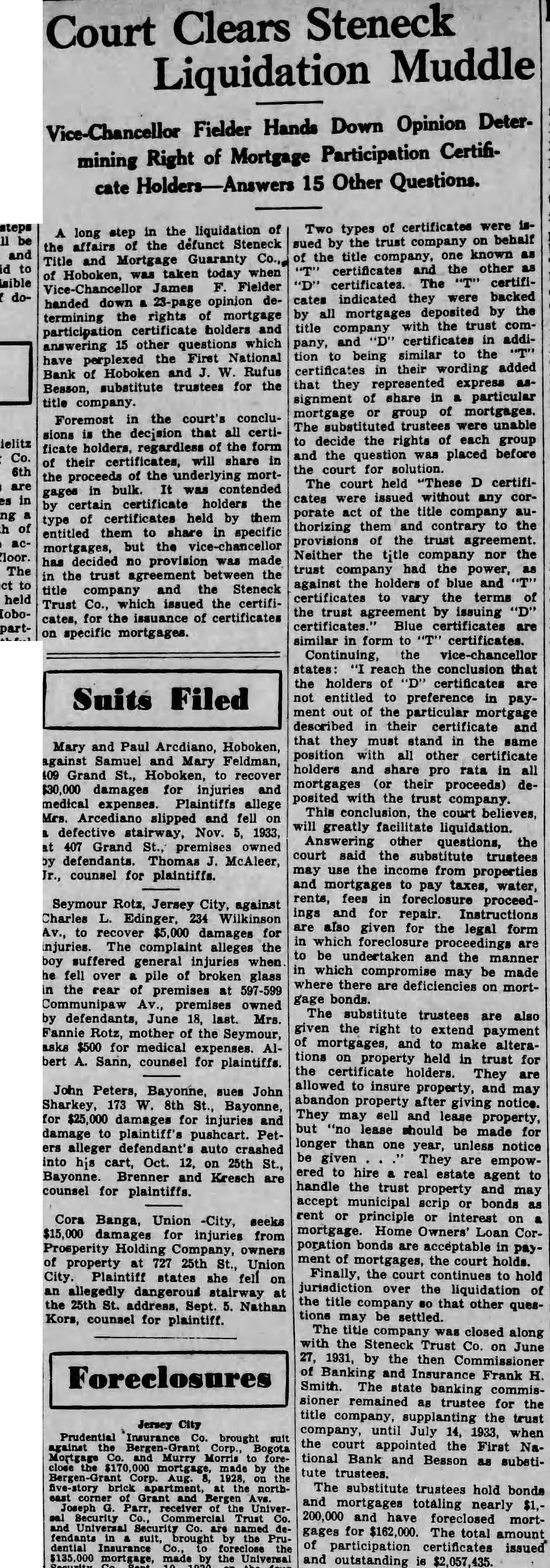 Court Clears Steneck Liquidation Muddle Fielder Hands Down Opinion Determining Right of Mortgage Participation Certificate 15 Other Questions. the of long step affairs the defunct Steneck Title and Guaranty Hoboken, taken today James Fielder handed down 23-page opinion rights mortgage participation certificate holders 15 other questions which answering First National have Bank Hoboken Rufus Beason, substitute trustees for the company. Foremost the court's concludecjsion that all certificate regardless the form their certificates, share the the underlying mortgages contended certificate holders the certificates held by type entitled them share specific mortgages, but the vice-chancellor has decided provision was the trust agreement the company Steneck Trust issued the certificates, the issuance certificates on specific mortgages. of certificates were isTwo types trust on behalf sued by company of the title company, known certificates the other The certificertificates. indicated they were backed cates all by the by mortgages with trust certificates pany, being similar the to added certificates that represented signment of share particular mortgage of mortgages. The were unable decide rights of each group and the was placed before the court The court "These D certificates issued without any corporate act the title authorizing and to the provisions the trust Neither the nor the trust the against the holders and the terms the trust by issuing certificates Blue certificates are similar form certificates. vice-chancellor conclusion that the holders certificates are not entitled to preference in payment out particular described certificate that must stand in the same position all other certificate holders and rata all mortgages their proceeds) deposited with the trust This conclusion. court will greatly facilitate liquidation. Answering questions, the court said the trustees from properties mortgages water, rents, foreclosure proceedings and for repair. Instructions also given for the legal form which are be undertaken and the manner which compromise may be made where there are deficiencies mortgage bonds. The substitute trustees are also given the right extend payment mortgages, to alterations property in trust for the holders. They are allowed to insure property. may giving notice. They and property, lease should made for longer one notice be given They empowhire estate agent to handle trust property accept municipal scrip bonds rent principle mortgage Home Loan poration bonds acceptable in mortgages, the court hold jurisdiction the liquidation the title that other quessettled. The title company closed along with the Steneck Trust Co. June 1931, by the then Banking and Frank H. banking commissioner remained trustee for title supplanting trust until when the court appointed the First National Bank Besson : substitrustees. The substitute trustees hold bonds and totaling nearly 200,000 have gages for $162,000. The amount of participation certificates issued and outstanding