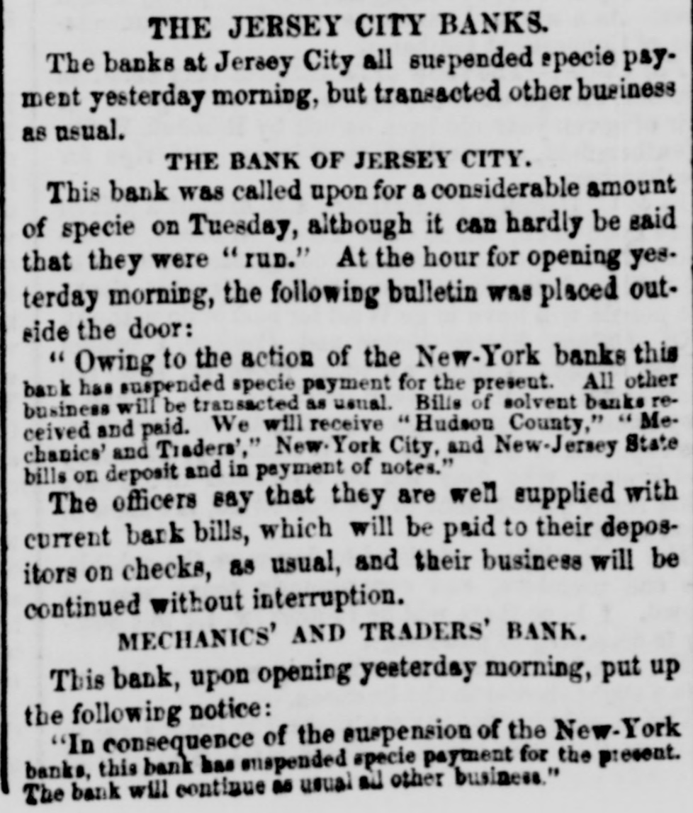 ment, but are transacting other business as usual. THE BANK OF JERSEY CITY. This bank was called upon for a considerable amount or specie on Tuesday, although It can hardly be said that they were run." At the hour for opening yesterday morning the following bulletin was placed outside the door Owing to the action of the New York banks this bank has suspended specie payment for the present. All other business will be transacted as usual. Bills of solvent banks received and paid. We will re reive Hudson County, Mechanion' and Traders', New York city and New Jersey State bills on deposit and in payment of notes. The officers say that they are well supplied with current bank bills, which will be paid to their depositors on checks as usual, and their business will be continued without interruption. MECHANICS' AND TRADERS' BANK. This bank, upon opening yesterday morning, put up the following notice In consequence of the suspension of the New York banks this bank has suspended specie payment for the present. The bank will continue, as usual, all other business. THE HUDSON COUNTY BANK. This institution, which was compelled to suspend specie payment on Tuesday, opened for business ente/day morn. ing, and posted the following bulletin outside the door :This bank, owing to a refusal of the banks in New York, on Monday and Tuesday, to receive its dealers' checks, added to a panic then existing there, forced a run OR us, which was met as fast as our receipts and availabilities could be used yesterday. This calamity in now over, and the bank will continue its business by receiving deposits, making collections, and in a rew days will resume die counting and Its usual business. The thanks of the stockholders, directors and officers are due to the de positors and billbolders for their confidence in the integrity and ability of the bank on this trying occasion.
