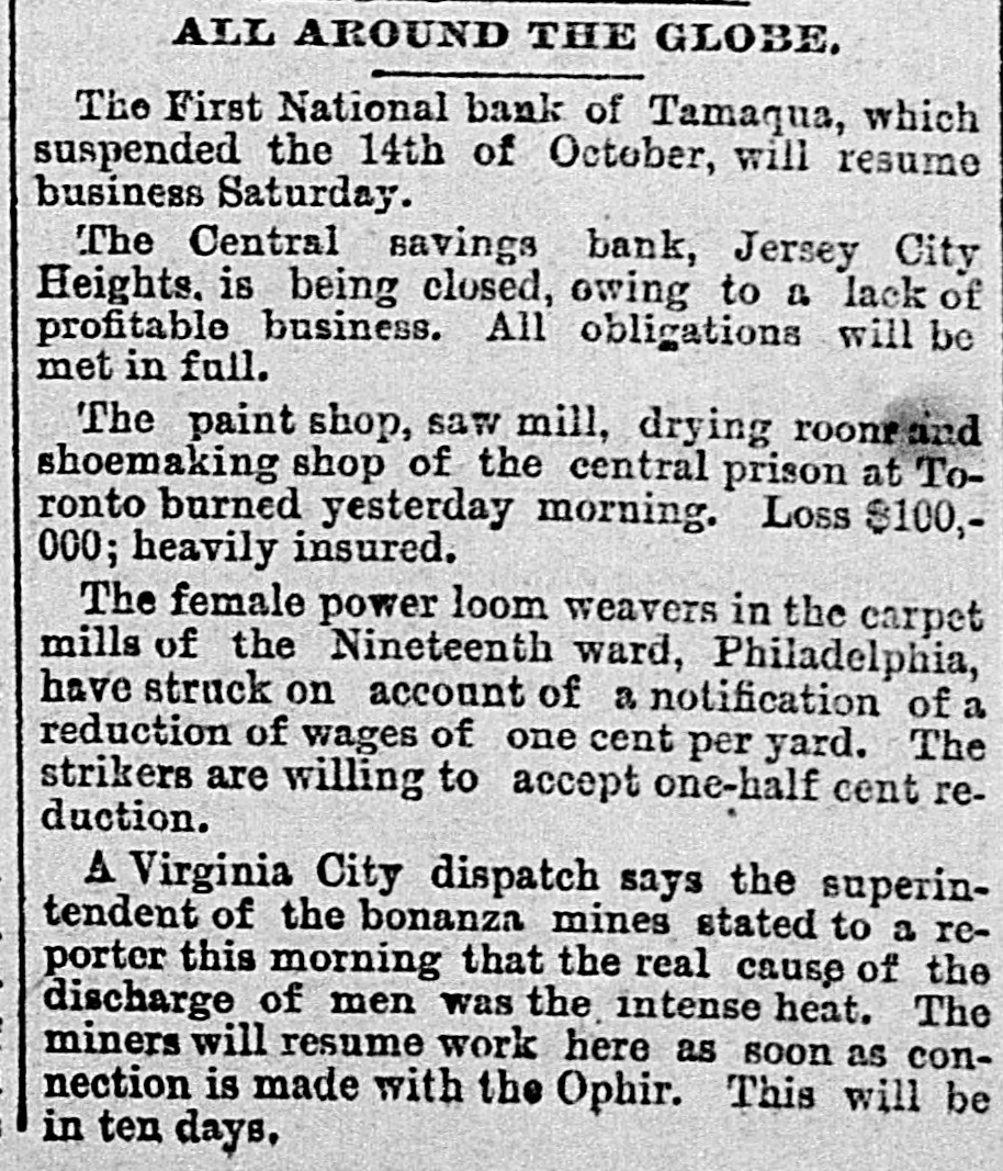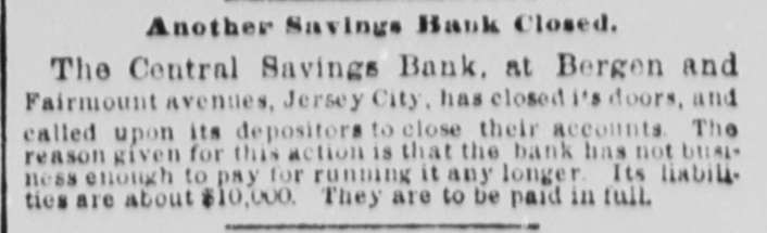 BANK TROUBLES. CLOSING UP THE CENTRAL SAVINGS BANK OF JERSEY CITY HEIGHTS--REORGANIZING THE MECHANICS AND LABOREES' BANK OF JERSEY CITY. The directors of the Central Savings Bank, corner of Bergen and Fairmount avenues, Jersey City Heights yesterday notified their depositors that they had decided to discontinue business, and that all claims presented in due form would be paid. The institution was opened in 1871, and during its seven years' continuance it was conducted on a very economical basis. The business of the bank was never very heavy. and the trustees and officers alternated in doing the clerical work, keeping the bank open every evening except Sundays. There were no salaried officers or employés and the only expenses, over the $120 per annum for rent, were for fuel. stationery and gas. After the enactment of the Six Per Cent law business ceased to be profitable and the liabilities were gradually reduced. The liabilities are at present $10,000 and the institution will be closed without loss to any one. The officers are:-Henry Dusenbury, president; Orrin Ward, vice president; Henry Fitch, secretary and treasurer. BANK REORGANIZATION. The directors of the Mechanics and Laborers' Savings Bank, corner of Grove and Second streets, Jersey City, held their regular semi-annual session on Monday night and took such action as they believed would end the troubles and dangers of suspension which for the past few weeks have beset the institution, One of the directors explained yesterday the cause of the bank's troubles by stating that about two years ago the secretary of the bank, Mr. Donelan, called the attention of the directors to the fact that the assets were rapidly disappearing. The Executive Committee took no action in the matter until a year ago, when the committee was changed. It was then learned, 80 the director stated, that John Halliard, the president of the institution, had borrowed about $60,000 of the assets and given as security a number of promissory notes which were not indorsed. Mr. Halliard's indebtedness was withheld from the directors by the Executive Committee, the latter gentlemen having implicit confidence in his ability to find security for the amount. He gave security for $35,000 of the amount, but the security offered for the residue was not thought sufficient. and at last it was determined to bring the matter to the attention of the directors. The result of this was that at the meeting on Monday night a plan of reorganization was presented and adopted. Dr. T. C. O'Callaghan was elected president, without opposition, and James J. Reid, secretary of the State Fire Insurance Company, was elected chairman of the Executive Committee. Resolutions were adopted, directing the inembers of the Executive Committee to visit Chancellor Runyon and, in order to prevent the institution from going into the hands of a receiver, to propose that each of the directors deposit $1,000 in bank for one year without interest in order to resume business. The committee will visit the Chancellor to-day, and should the proposition be accepted it was decided to pay the depositors the amount of their claim with the exception of about teu per cent, and the remainder to be paid when a sufficient surplus shall have accumulated.