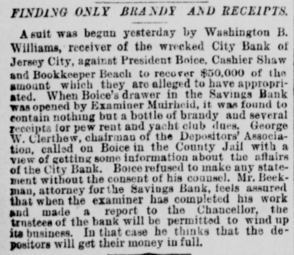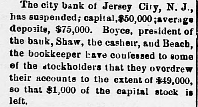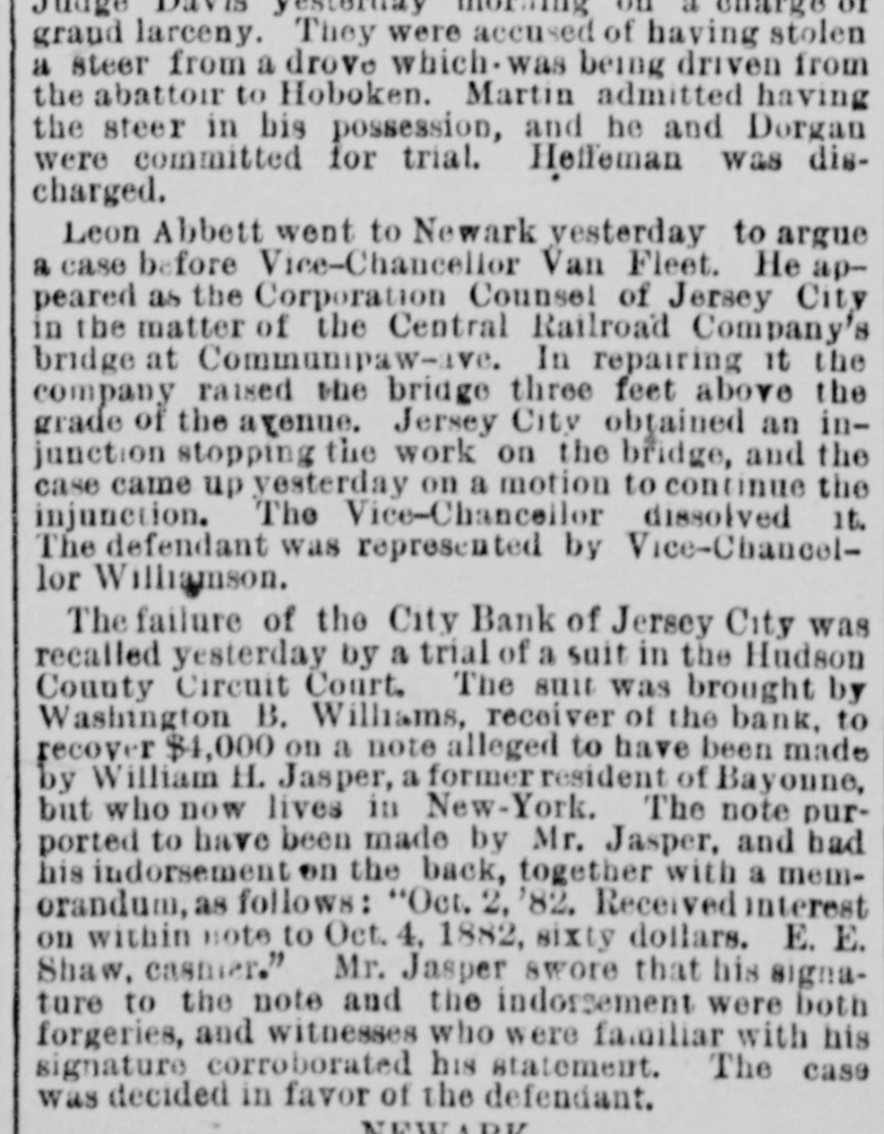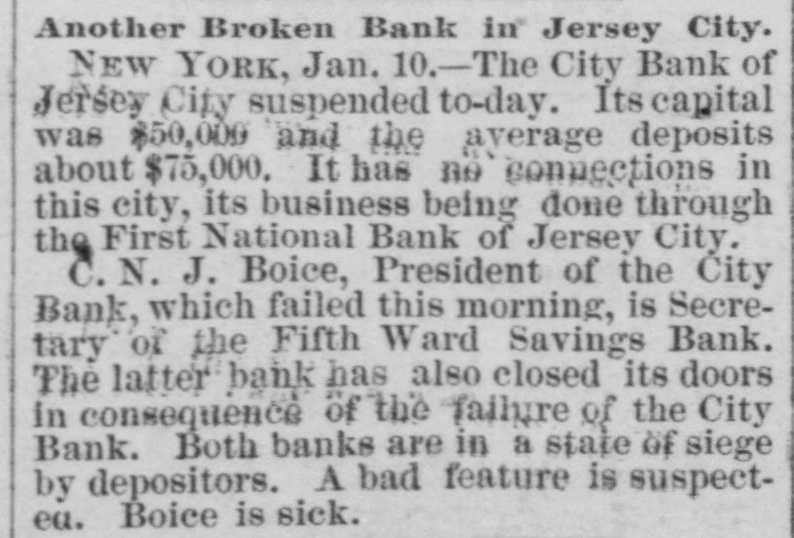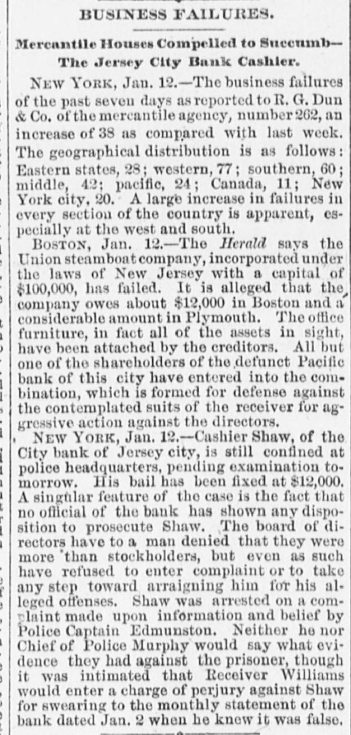 SHAW, who was Cashier of the suspended City Bank of Jersey City, N. J., being unable to secure $20,000 bail, was recently placed in jail. Other persons implicated were about to be arrested.