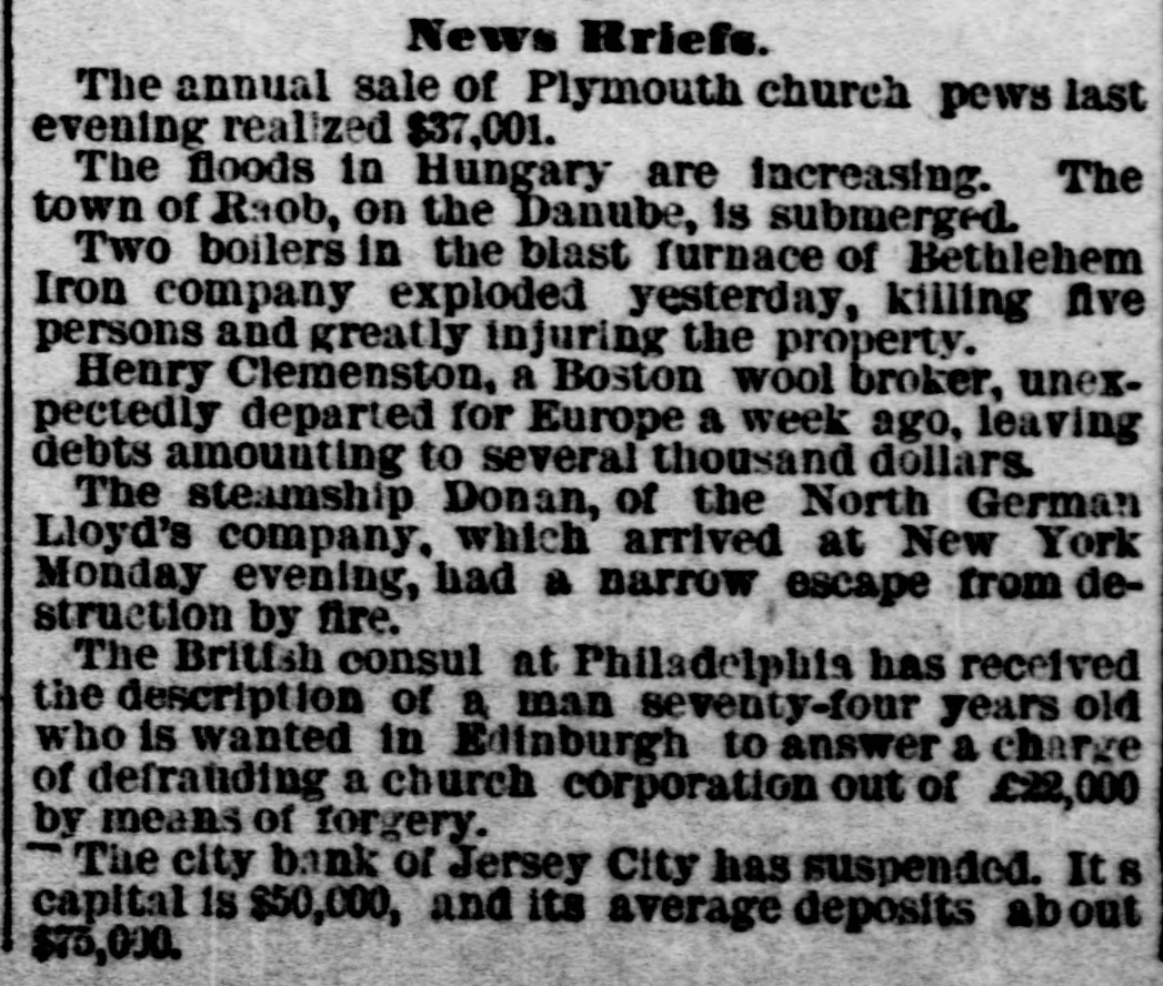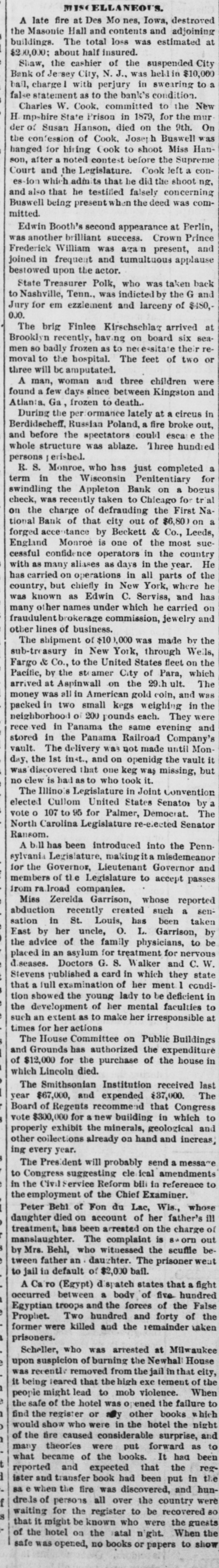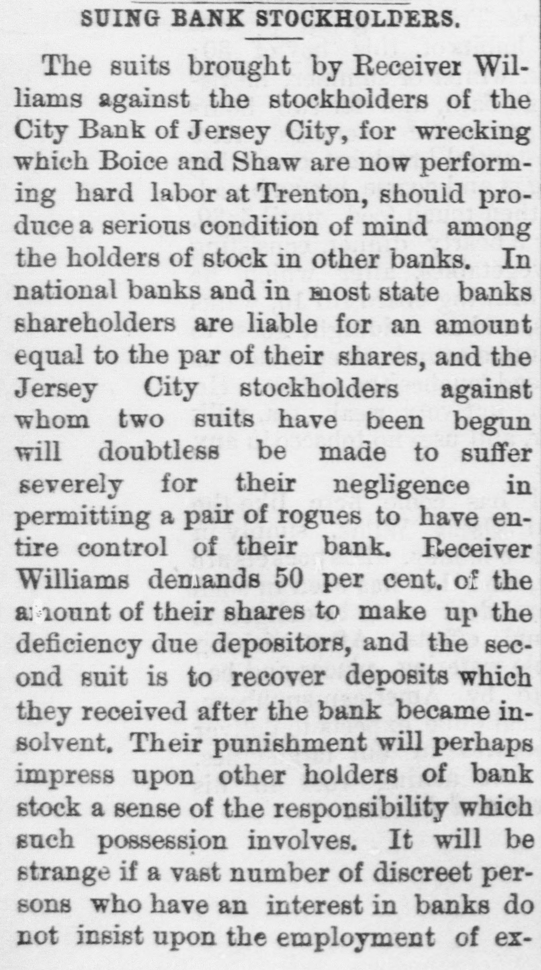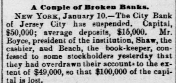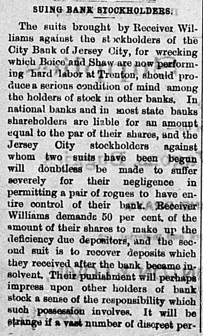 SHAW, who was Cashier of the suspended City Bank of Jersey City, N. J., being unable to secure $20,000 bail, was recently placed in jail. Other persons implicated were about to be arrested.