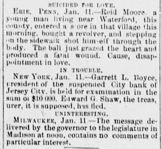 A BROKEN rail on the Midland Branch of the Chicago & Northwestern Road, twelve miles north of Clinton, Iowa, the other night threw two cars down a twenty-foot enbankment, killing a brakeman and injaring the conductor and nineteen passengers.