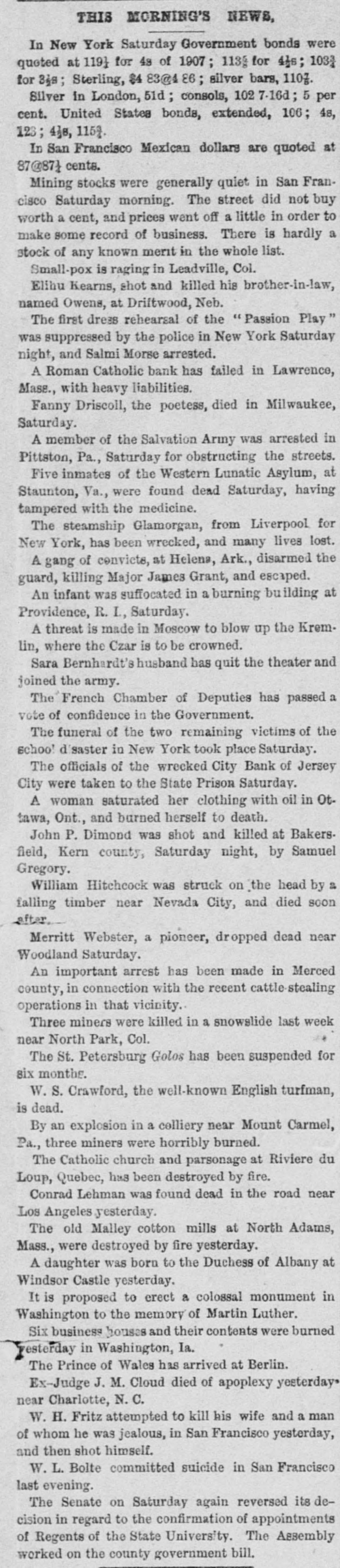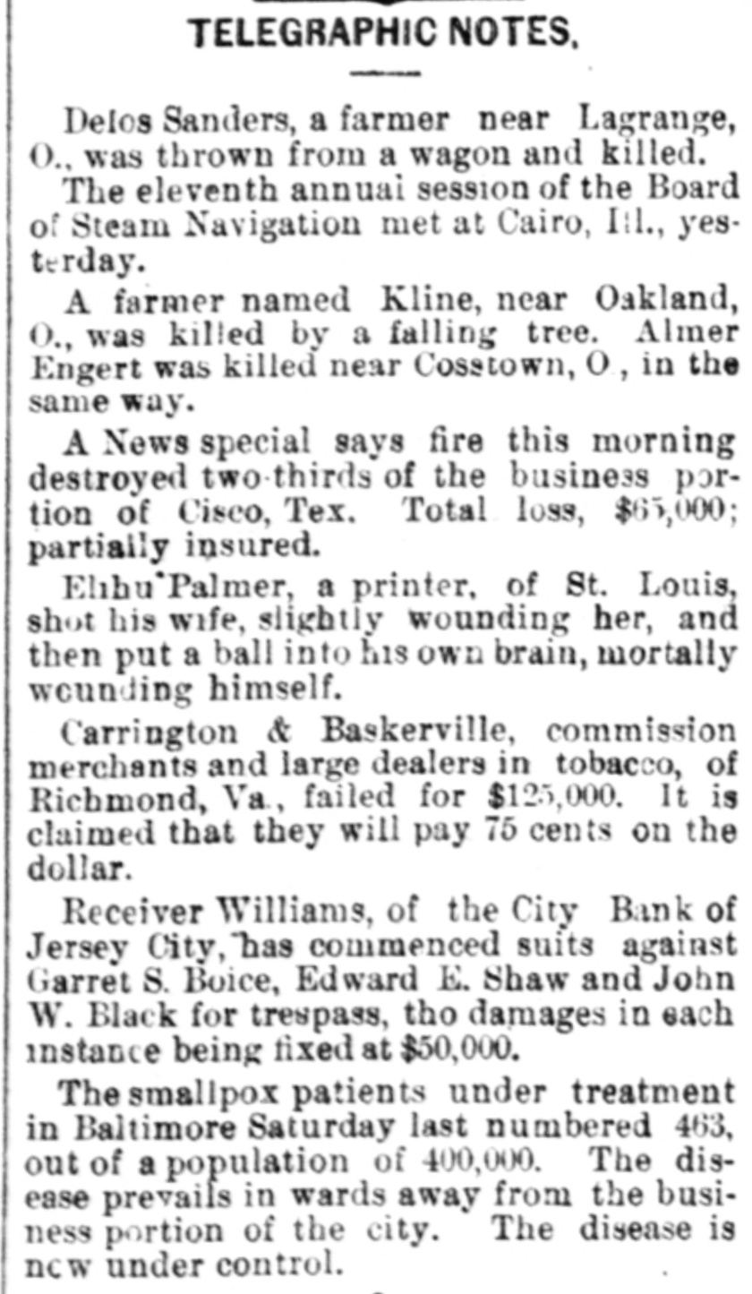 A TELEGRAM from London, Eng., on the 17th stated that the steam-hip Helvetia, New York to Queenstown, lost her fourth officer overboard. An American bark had two men washed away. The ship Undine had arrived at Colombo, Ceylon, and reported eight of her crew drowned.