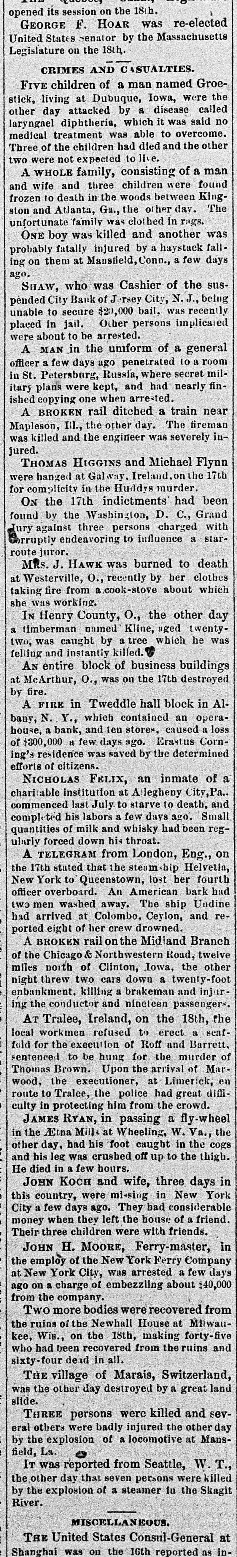 THOMAS HIGGINS and Michael Flynn were hanged at Galway, Ireland, on the 17th for complicity in the Huddys murder.