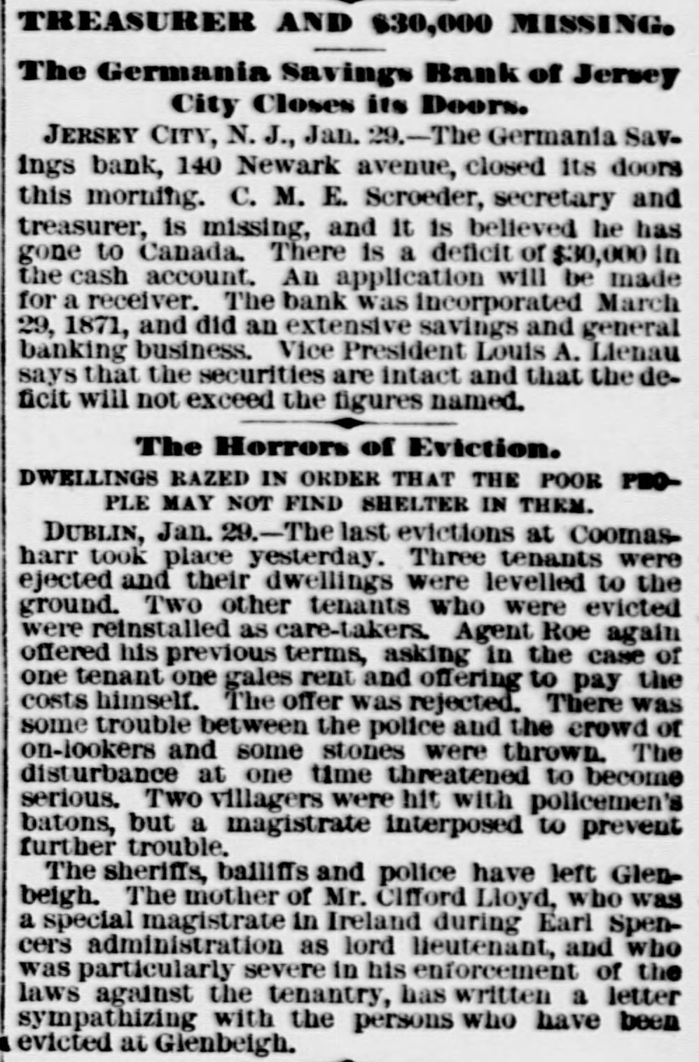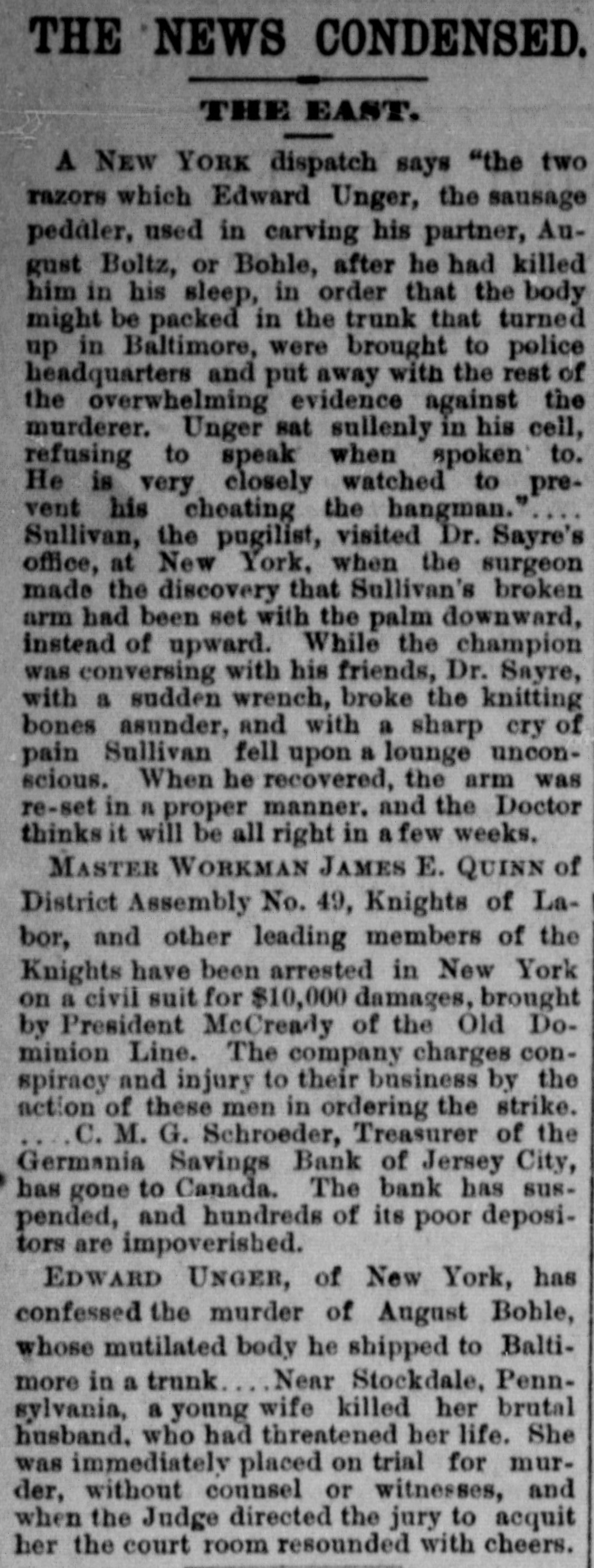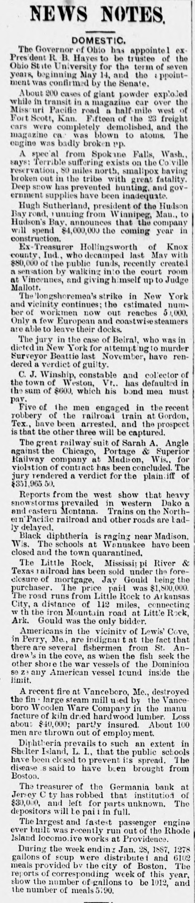 NEWS NOTES. DOMESTIC. The Governor of Ohio has appointel exPresident R. B. Hayes to be trustee of the Ohio State University for the term of seven years, beginning May 14, and the ppointment was confirmed by the Senate. About 200 cases of giant powder exploded while in transit in a magazine car over the Missouri Pacific road a half-mile west of Fort Scott, Kan. Fifteen of the 23 freight cars were completely demolished, and the magazine car was blown to atoms. The engine was badly broken up. A spec'al from Spokine Falls, Wash., says: Terrible suffering exists on the Colville reservation, 80 miles north, smallpox having broken out in the tribe with great fatality. Deep snow has prevented hunting, and government supplies have been inadequate. Hugh Sutherland, president of the Hudson Bay road, !unning from Winnipeg, Man., to Hudson's Bay, announces that the company will spend $4,000,000 the coming year in construction. Ex-Treasurer Hollingsworth of Knox county, Ind., who decamped last May with $80,000 of the public funds, recently created a sensation by walking into the court room at Vincennes, and giving himself up to Judge Mallott. The 'longshoremen's strike in New York and vicinity continues; the estimated nums ber of workmen now out reaches 50,000. Only a few European and coastwisesteamers are able to leave their docks. The jury in the case of Beiral, who was in dicted in New York for attempting to murder Surveyor Beattie last November, have rendered a verdict of guilty. C. J. Winship, constable and collector of the town of Weston, Vt.. has defaulted in the sum of $600, which his bond men must pay. Five of the men engaged in the recent robbery of the railroad train at Gordon, Tex., have been arrested. and the prospect is that the other three will be captured. The great railway suit of Sarah A. Angle against the Chicago, Portage & Superior Railway company at Madison, Wis., for violation of contract has been concluded. The jury rendered a verdict for the plain:iff of $351,965.50. Reports from the west show that heavy snowstorms prevailed in western Dako a and eastern Montana. Trains on the Northern' Pacific railroad and other roads are badly delayed. Black diphtheria is raging near Madison, Wis. The schools at Wanuakee have been closed and the town quarantined. The Little Rock, Mississi: pi River & Texas railroad has been sold under the foreclosure of mortgage, Jay Gould being the purchaser. The price paid was $1,800,000. The road runs from Little Rock to Arkansas City, a distance of 112 miles, connecting w th the iron Mountain road at Little Rock, Ark. Gould was the only bidder. Americans in the vicinity of Lewis' Cove, in Perry, Me., are indignar t at the fact that there are several fishermen from St. Andrew's in the cove, as when the fish seek the other shore the war vessels of the Dominion se ZB any American vessel tound inside the limit. A recent fire at Vanceboro, Me., destroyed the fin large steam mill used by the Vanceboro Wooden Ware Company in the manu facture of kiln dried hardwood lumber. Loss about $40,000; part!y insured. About 100 men are thrown out of employment. Diphtheria prevails to such an extent in Shelter Island, L. I., that the public schools have been closed to prevent its spread. The disease S said to have been brought from Boston. The treasurer of the Germania bank at Jersey C ty has robbed that institution of $30,000, and left for parts unknown. The depositors will be pai 1 in full. The largest and fastest passenger engine ever built was recently run out of the Rhode Island locomo ive works at Providence. During the week ending Jan. 28, 1887, 1278 gallons of soup were distribute and 6102 meals provided by the city of Boston. The reports of corresponding week of this year, show the number of gallons to be 1012, and