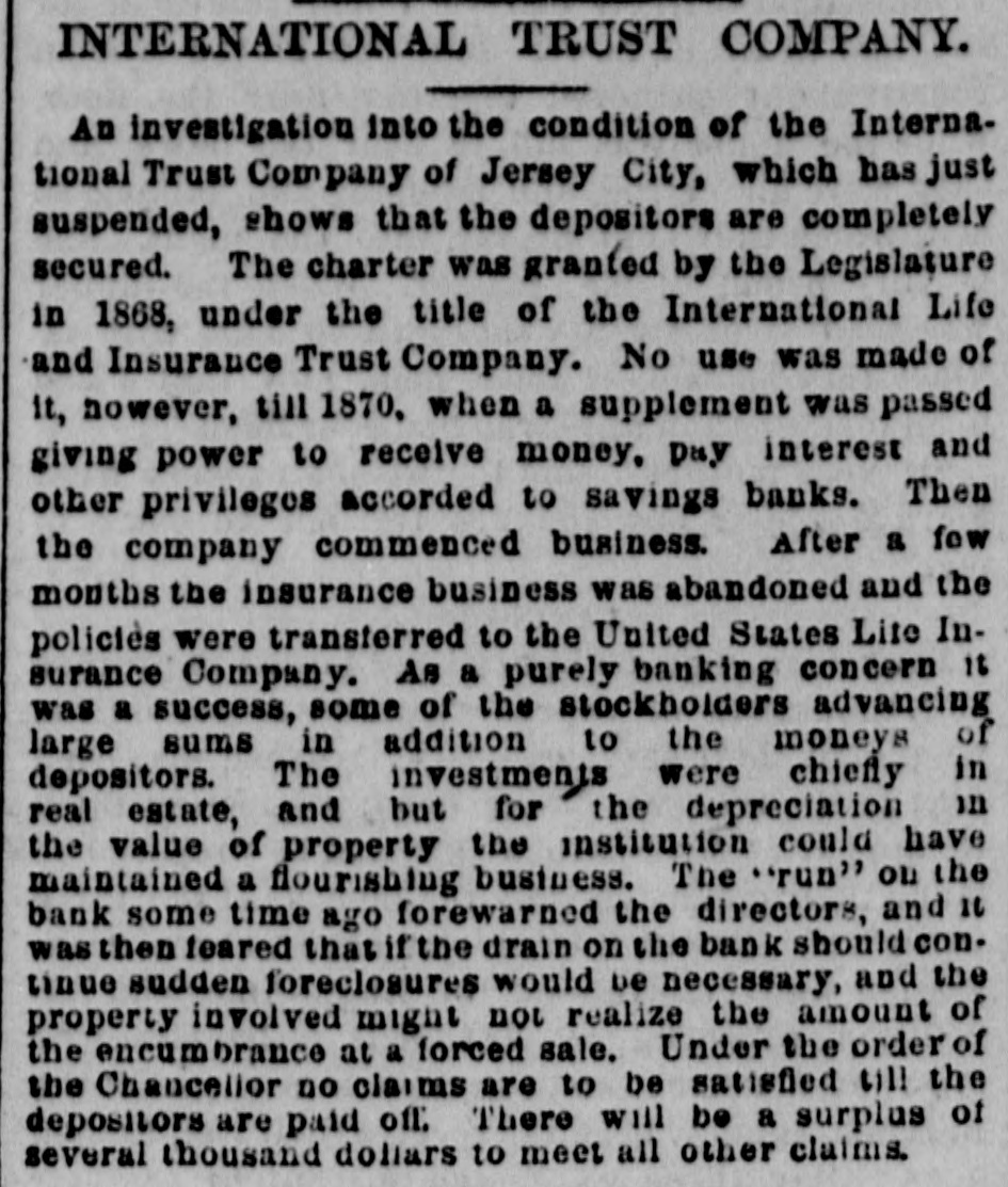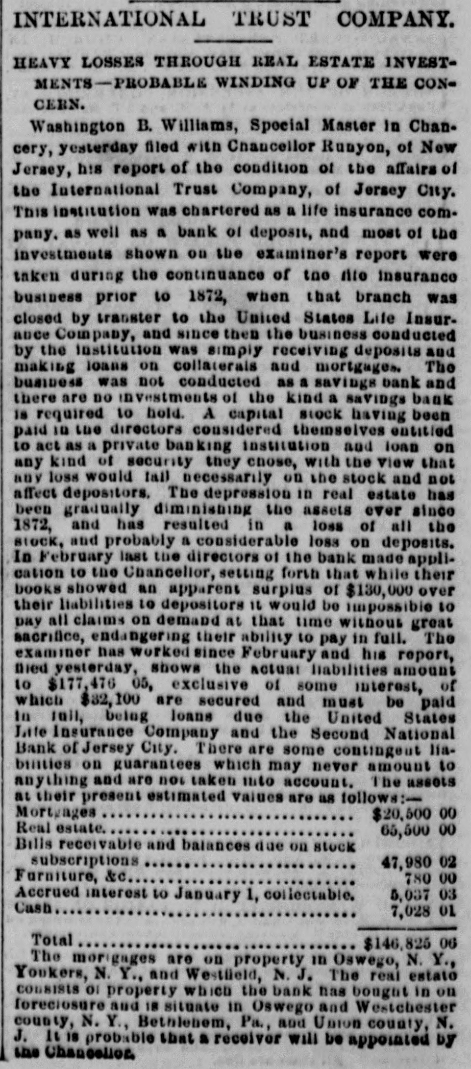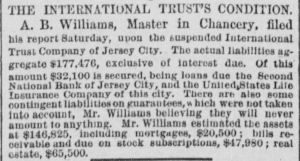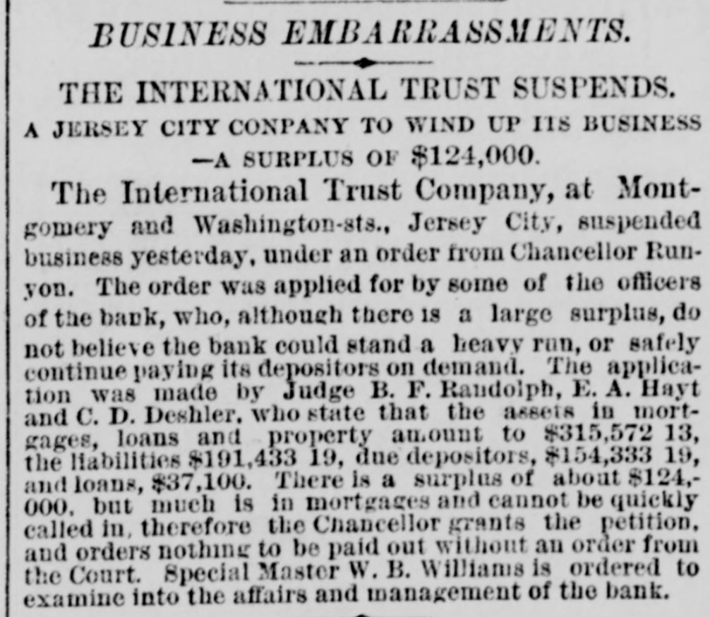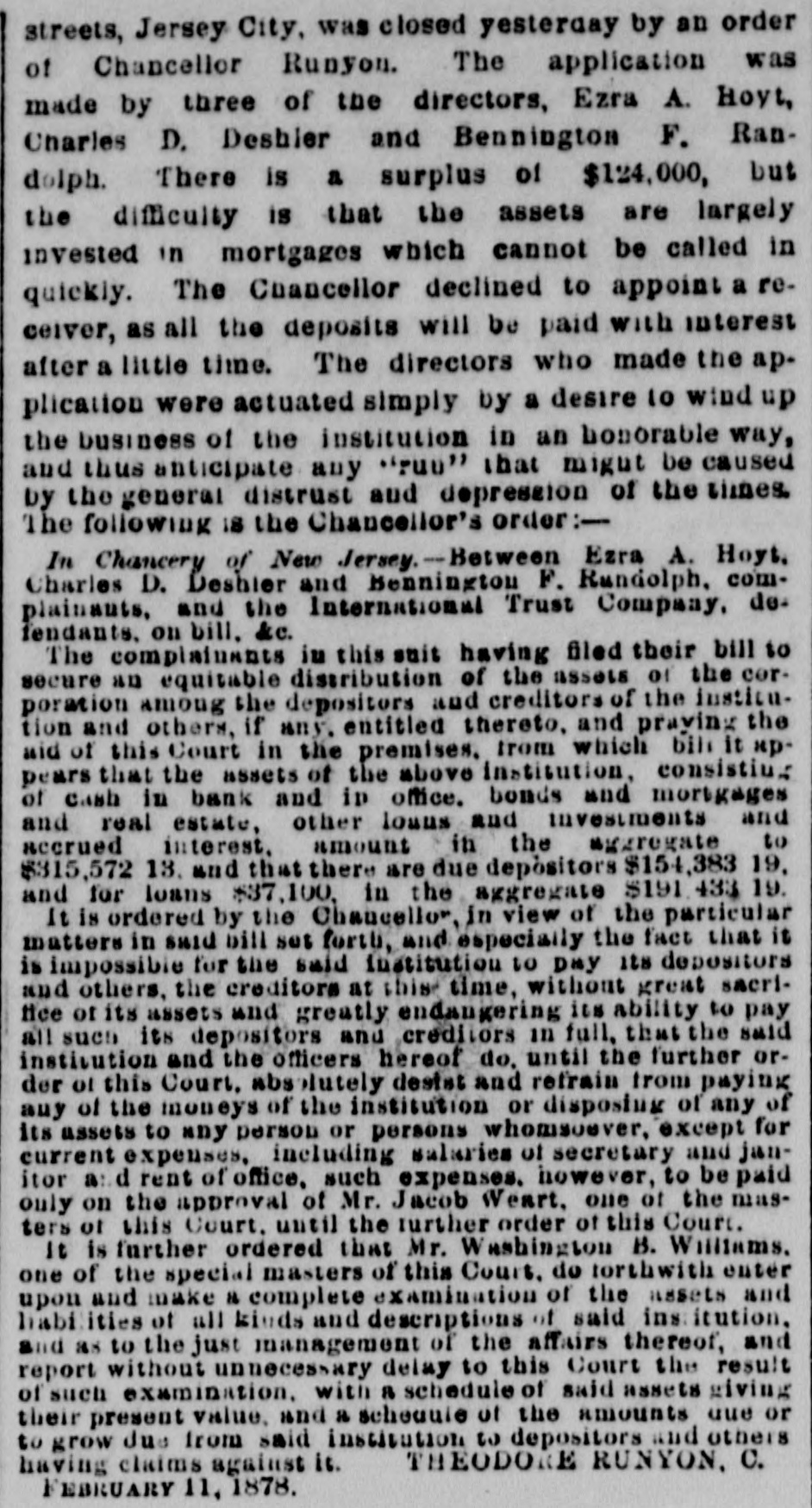 streets, Jersey City, was closed yesterday by an order of Chancellor Runyon. The application was made by three of the directors, Ezra A. Hoyt, Charles D. Deshier and Bennington F. Randolph. There is a surplus of $124,000, but the difficulty is that the assets are largely invested in mortgages which cannot be called in quickly. The Chancellor declined to appoint a receiver, as all the deposits will be paid with interest after a little time. The directors who made the application were actuated simply by a desire to wind up the business of the institution in an honorable way, and thus anticipate any "ruu" that migut be caused by the general distrust and depression of the times. The following is the Chancellor's order:In Chancery of New Jersey.-Between Ezra A. Hoyt. Charles D. Deshier and Benningtou F. Rundolph, complainants, and the International Trust Company. defendants. on bill, &c. The complainants in this suit having filed their bill to secure an equitable distribution of the assets of the corporation among the depositors and creditors of the institution and others, if any. entitled thereto, and praying the aid of this Court in the premises. from which bill it Kppears that the assets of the above institution, consisting of cash in bank and in office. bonds and mortgages and real estate, other louns and investments and accrued interest, amount in the aggregate to $315,572 13. and that there are due depositors $154,383 19, and for loans $37,100, in the aggregate $191 433 19. It is ordered by the Chancellor, in view of the particular matters in said bill set forth, and especially the fact that it is impossible for the said institution to Day its depositors and others, the creditors at this time, without great sacrifice of its assets and greatly endangering its ability to pay all such its depositors and creditors in full, that the said institution and the officers hereof do. until the further order of this Court. abs olutely desist and refrain from paying any of the moneys of the institution or disposing of any of its assets to any person or persons whomsoever, except for current expenses, including salaries of secretary and janitor and rent of office, such expenses. however, to be paid only on the approval of Mr. Jacob Weart, one of the masters of this Court. until the further order of this Court. it is further ordered that Mr. Washington B. Williams. one of the special masters of this Court. do torthwith enter upon and make a complete examination of the assets and ities of all kinds and descriptions of said institution, and as to the just management of the affairs thereof, and report without unnecessary delay to this Court the result of such examination. with a schedule of said assets giving their present value, and a schedule of the amounts que or to grow due from said institution to depositors and others having claims against it. THEODORE RUNYON, C. FEBRUARY 11, 1878.