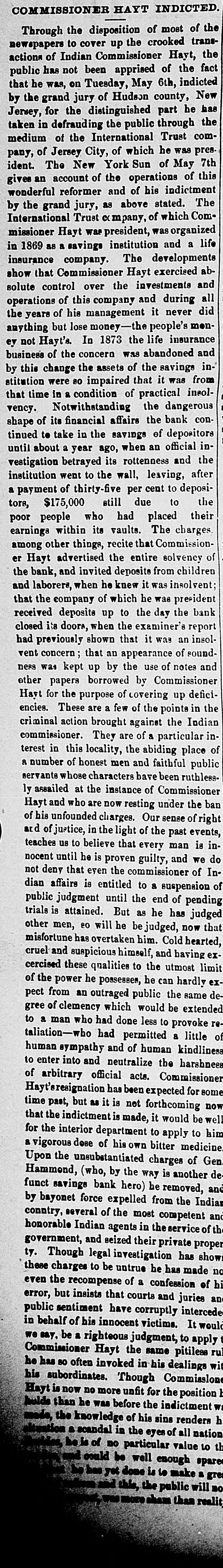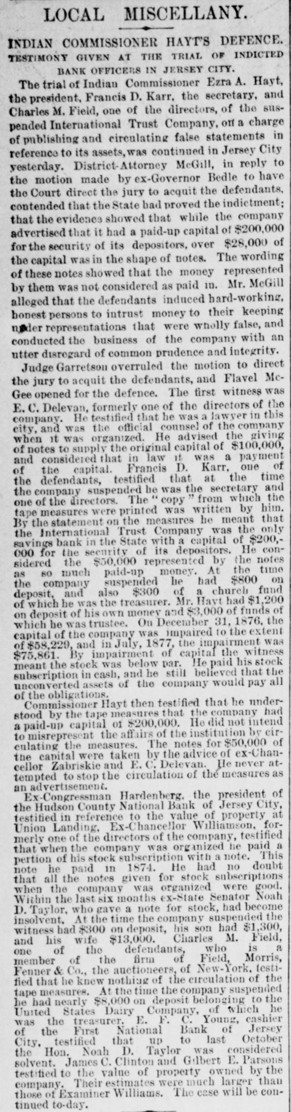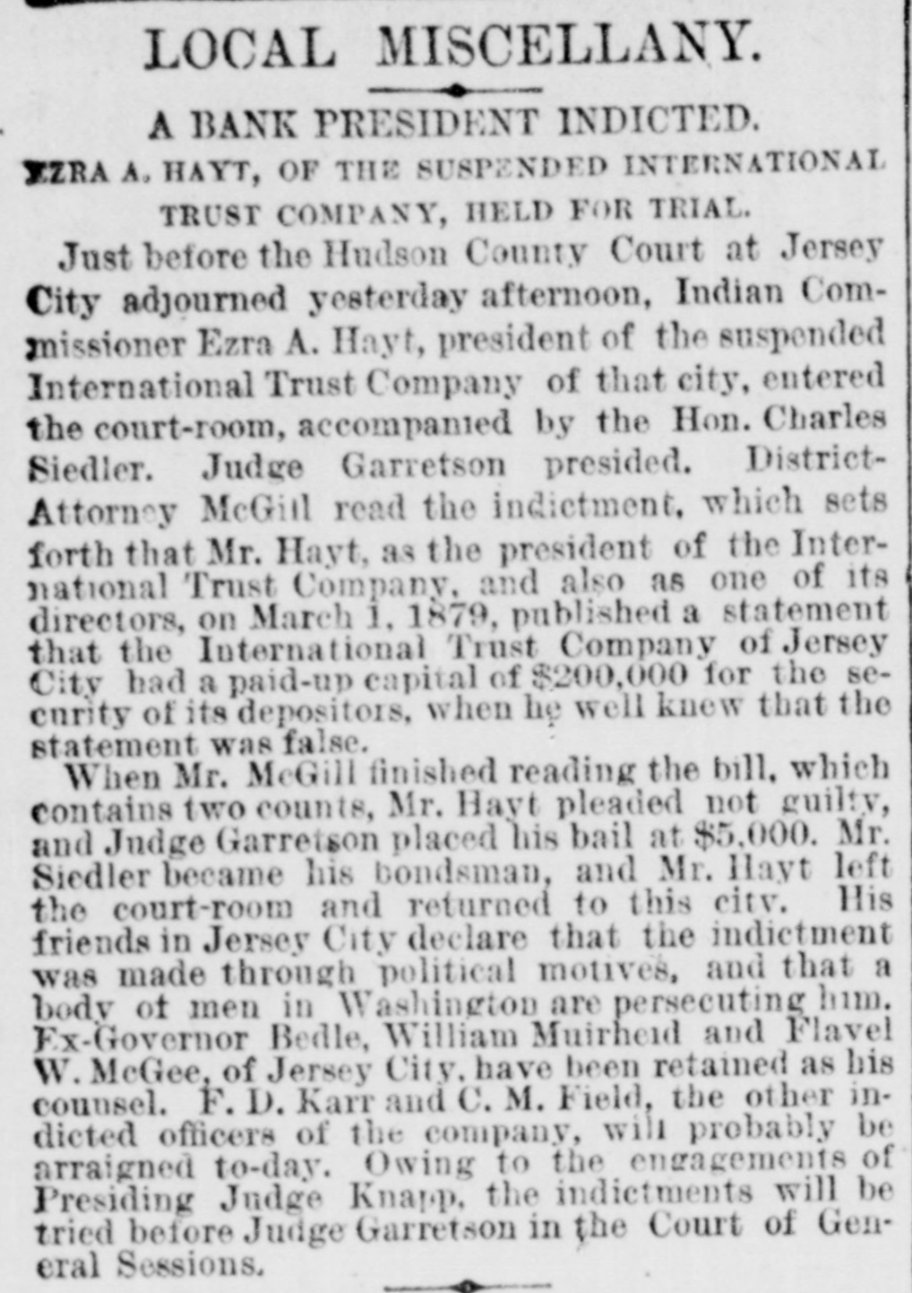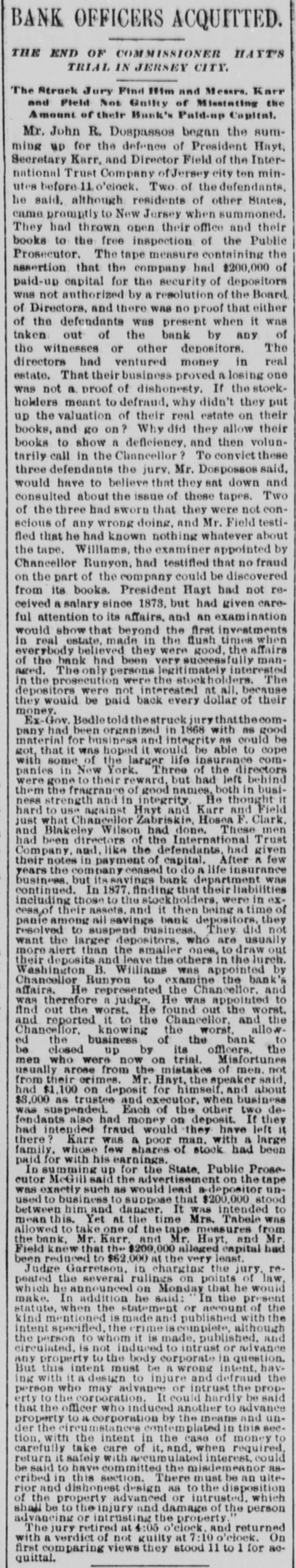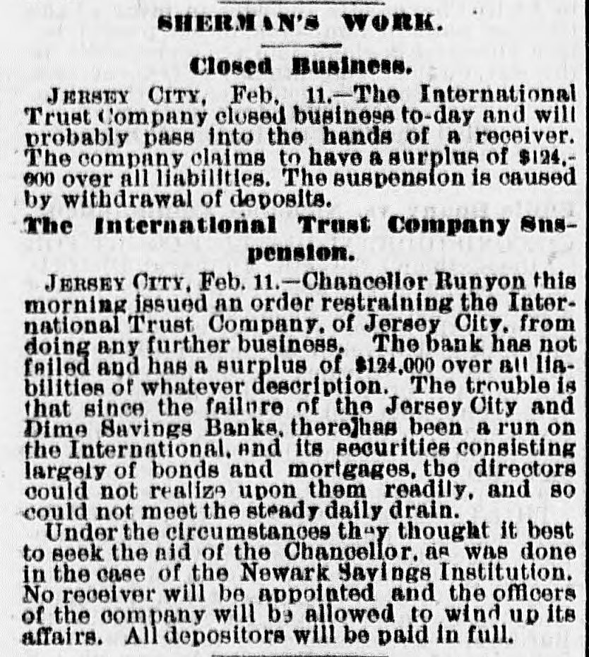 streets, Jersey City, was closed yesterday by an order of Chancellor Runyon. The application was made by three of the directors, Ezra A. Hoyt, Charles D. Deshier and Bennington F. Randolph. There is a surplus of $124,000, but the difficulty is that the assets are largely invested in mortgages which cannot be called in quickly. The Chancellor declined to appoint a receiver, as all the deposits will be paid with interest after a little time. The directors who made the application were actuated simply by a desire to wind up the business of the institution in an honorable way, and thus anticipate any "ruu" that migut be caused by the general distrust and depression of the times. The following is the Chancellor's order:In Chancery of New Jersey.-Between Ezra A. Hoyt. Charles D. Deshier and Benningtou F. Rundolph, complainants, and the International Trust Company. defendants. on bill, &c. The complainants in this suit having filed their bill to secure an equitable distribution of the assets of the corporation among the depositors and creditors of the institution and others, if any. entitled thereto, and praying the aid of this Court in the premises. from which bill it Kppears that the assets of the above institution, consisting of cash in bank and in office. bonds and mortgages and real estate, other louns and investments and accrued interest, amount in the aggregate to $315,572 13. and that there are due depositors $154,383 19, and for loans $37,100, in the aggregate $191 433 19. It is ordered by the Chancellor, in view of the particular matters in said bill set forth, and especially the fact that it is impossible for the said institution to Day its depositors and others, the creditors at this time, without great sacrifice of its assets and greatly endangering its ability to pay all such its depositors and creditors in full, that the said institution and the officers hereof do. until the further order of this Court. abs olutely desist and refrain from paying any of the moneys of the institution or disposing of any of its assets to any person or persons whomsoever, except for current expenses, including salaries of secretary and janitor and rent of office, such expenses. however, to be paid only on the approval of Mr. Jacob Weart, one of the masters of this Court. until the further order of this Court. it is further ordered that Mr. Washington B. Williams. one of the special masters of this Court. do torthwith enter upon and make a complete examination of the assets and ities of all kinds and descriptions of said institution, and as to the just management of the affairs thereof, and report without unnecessary delay to this Court the result of such examination. with a schedule of said assets giving their present value, and a schedule of the amounts que or to grow due from said institution to depositors and others having claims against it. THEODORE RUNYON, C. FEBRUARY 11, 1878.