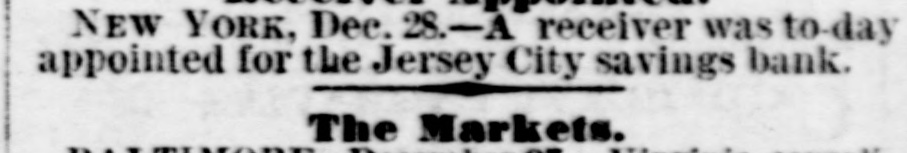 NEW YORK, Dec. 28.-A receiver was to-day appointed for the Jersey City savings bank. The Markets. A ..
