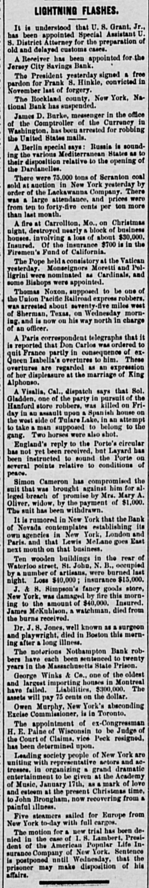 LIGHTNING FLASHES. It is understood that U. S. Grant, Jr., has been appointed Special Assistant U. S. District Atterney for the preparation of old and delayed customs cases. A Receiver has been appointed for the Jersey City Savings Bank. The President yesterday signed a free pardon for Frank S. Hinkle, convicted in November last of forgery. The Rockland county, New York, National Bank has suspended. James D. Burke, messenger in the office of the Comptroller of the Currency in Washington, has been arrested for robbing the United States mails. A Berlin special says: Russia is sounding the various Mediterranean States as to their disposition relative to the opening of the Dardanelles. There were 75,000 tons of Scranton coal sold at auction in New York yesterday by order of the Lackawanna Company. There was a large attendance, and prices were from ten to forty-five cents per ton more than last month. A fire at Carrollton, Mo., on Christmas night, destroyed nearly a block of business houses. involving a loss of about $30,000. Insured. Of the insurance $700 is in the Firemen's Fund of California. The Pope held a consistory at the Vatican yesterday. Monseignors Moretti and Pelligrini were nominated as Cardinals, and some Bishops were appointed. Thomas Noxon, supposed to be one of the Union Pacific Railroad express robbers, was arrested about seventy-five miles west of Sherman, Texas, on Wednesday morning, and is now on his way north in charge of an officer. A Paris correspondent telegraphs that it is reported that Don Carlos was ordered to quit France partly in consequence of exQueen Isabella's overtures to him. These overtures are regarded as an expression of her displeasure at the marriage of King Alphonso. A Visalia, Cal., dispatch says that Sol. Gladden, one of the party in pursuit of the Hanford store robbers, was killed on Friday in an assault upon a Spanish house on the west side of Tulare Lake, in an attempt to take a man supposed to belong to the gang. Two horses were also shot. England's reply to the Porte's circular has not yet been received, but Layard has been instructed to sound the Porte on several points relative to conditions of peace. Simon Cameron has compromised the suit that was brought against him for alleged breach of promise by Mrs. Mary A. Oliver, widow, by the payment of $1,000. The suit has been withdrawn. It is rumored in New York that the Bank of Nevada contemplates establishing its own agencies in New York, London and Paris. and that Lewis McLane goes East next month on that business. Ten wooden buildings in the rear of Waterloo street, St. John, N. B., occupied by a number of artisans, were burned last night. Loss $40,000; insurance $15,000. J. & 8. Simpson's fancy goods store, New York, was damaged by fire this morning to the amount of $40,000. Insured. James McKuhlson, a watchman, died from the burns received. Dr. J. S. Jones, well known as a surgeon and playwright, died in Boston this merning after a long illness. The noterious Nothampton Bank robbers have each been sentenced to twenty years in the Massachusetts State Prison. George Winks & Ce., one of the oldest and largest importing houses in Montreal have failed. Liabilities, $300,000. The assets will pay 75 cents on the dollar. Owen Murphy, New York's absconding Excise Commissioner, is in Toronto. The appointment of ex-Congressman H. E. Paine of Wisconsin to be Judge of the Court of Claims, vice Peck resigned, has been determined upon. Leading society people of New York are uniting with representative actors and actresses, in organizing a grand dramatic entertainment to be given at the Academy of Music, January 17th, as a mark of love and esteem at the present Christmas time, to John Brougham, now recovering from a painful illness. Five steamers sailed for Europe from New York to-day with full cargos. The motion for a now trial has been denied in the case of I. S. Lambert, President of the American Popular Life Insurance Company of New York. Sentence is postponed until Wednesday, that the prisoner may make disposition of his affairs.