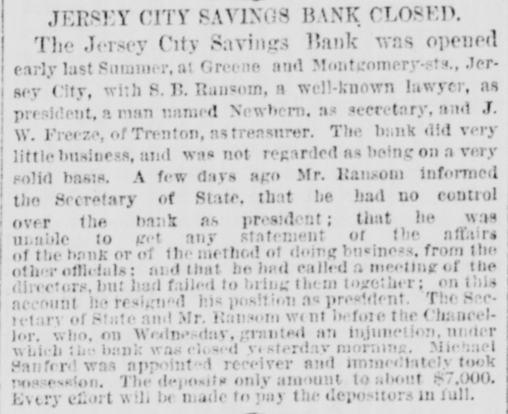 JERSEY CITY SAVINGS BANK CLOSED. The Jersey City Savings Bank was opened early last Summer, at Greene and Montgomery-sts., Jersey City, with S. B. Ransom, a well-known lawyer, as president, a man named Newbern. as secretary, and J. W. Freeze, of Trenton, astreasurer. The bank did very little business, and was not regarded as being on a very solid basis. A few days ago Mr. Ransom informed the Secretary of State, that be had no control over the bank as president; that he was unable to get any statement of the affairs of the bank or of the method of doing business, from the other officials: and that be had called a meeting of the directors, but had failed to bring them together; on this account he resigned his position as president. The Secretary of State and Mr. Ransom went before the Chancellor. who, on Wednesday, granted an injunction, under which the bank was closed yesterday morning. Michael Sanford was appointed receiver and immediately took possession. The deposits only amount to about $7,000. Every effort will be made to pay the depositors in full.