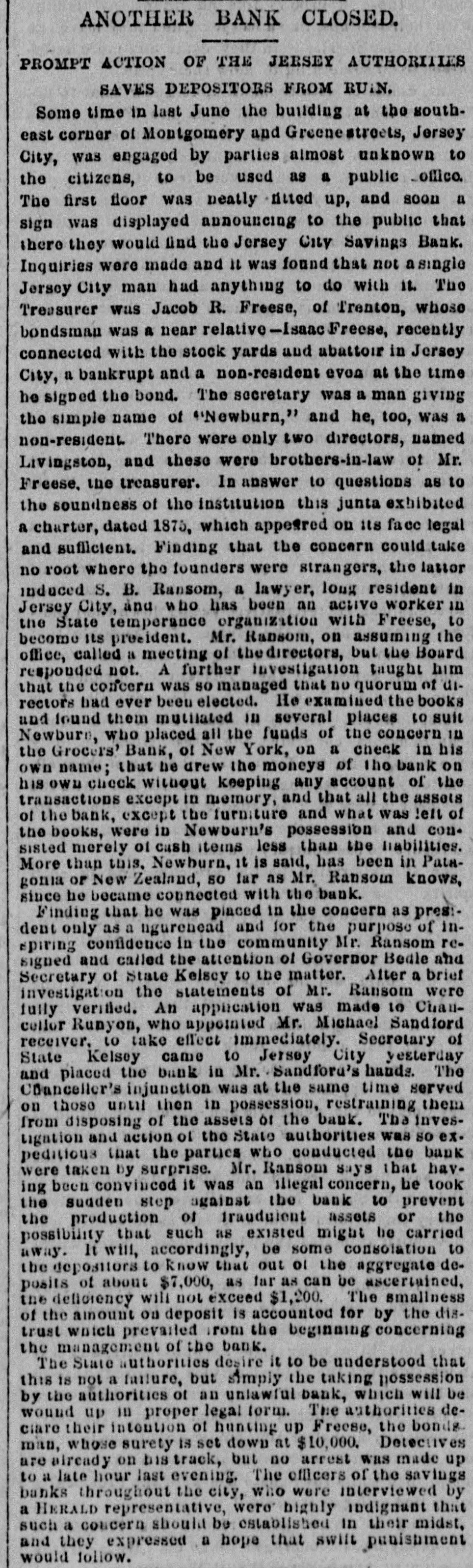 ANOTHER BANK CLOSED. PROMPT ACTION OF THE JERSEY AUTHORITIES SAVES DEPOSITORS FROM RU:N. Some time in last June the building at the southeast corner of Montgomery and Greenestreets, Jersey City, was engaged by parties almost unknown to the citizens, to be used as a public office. The first floor was neatly fitted up, and soon a sign was displayed announcing to the public that there they would find the Jersey City Savings Bank. Inquiries were made and it was found that not asingle Jersey City man had anything to do with it. The Treasurer was Jacob R. Freese, of Trenton, whose bondsman was a near relative-Isaac Freese, recently connected with the stock yards and abattoir in Jersey City, a bankrupt and a non-resident evon at the time he signed the bond. The secretary was a man giving the simple name of "Newburn," and he, too, was a non-resident There were only two directors, named Livingston, and these were brothers-in-law of Mr. Freese. the treasurer. In answer to questions as to the soundness of the institution this junta exhibited a charter, dated 1875, which appeared on its face legal and sufficient. Finding that the concern could take no root where the founders were strangers, the lattor induced S. B. Ransom, a lawyer, long resident in Jersey City, and who has been an active worker ID the State temperance organization with Freese, to become its president. Mr. Ransom, on assuming the office, called a meeting of the directors, but the Board responded not. A further investigation taught him that the concern was so managed that no quorum of airectors had ever been elected. He examined the books and found them mutilated ID several places to suit Newburn, who placed all the funds of the concern IM the Grocers' Bank, of New York, on a check in his own name; thut he drew the moneys of the bank on his own check without keeping any account of the transactions except in memory, and that all the assets of the bank, except the furniture and what was !eft of the books, were in Newburn's possession and consisted merely of cash items less than the liabilities. More than this. Newburn, it is said, has been in Patagonia or New Zealand, so lar as Mr. Ransom knows, since he became connected with the bank. Finding that he was placed in the concern as pres:dent only as a ugurenead and for the purpose of inspiring confidence in the community Mr. Ransom resigned and called the attention of Governor Bedle and Secretary of State Kelsey to the matter. After a brief investigation the statements of Mr. Ransom were fully verified. An application was made to Chancellor Runyon, who appointed Mr. Michael Sandford receiver, to take effect immediately. Secretary of State Kelsey came to Jersey City yesterday and placed the bank in Mr. Sandford's hands. The Connceller's injunction was at the same time served on those until then in possession, restraining them from disposing of the assets of the bank. The investigation and action of the State authorities was so expeditious that the parties who conducted the bank were taken by surprise. Mr. Ransom says that having been convinced it was an illegal concern, be took the sudden step against the bank to prevent the production of traudulent assets or the possibility that such as existed might be carried away. It will, accordingly, be some consolation to the depositors to know that out 01 the aggregate deposits of about $7,000, as far as can be ascertained, the deliciency will not exceed $1,200. The smallness of the amount on deposit is accounted for by the distrust which prevailed from the beginning concerning the management of the bank. The State authorities desire it to be understood that this is not a failure, but simply the taking possession by the authorities ot an unlawful bank, which will be wound up in proper legal form. The authorities declare their intention of hunting up Freese, the bondsman, whose surety is set down at $10,000. Detectives are already on bis track, but no arrest was made up to a late hour last evening. The officers of the savings banks throughout the city, who were interviewed by a HERALD representative, were highly indignant that such a concern should be established in their midst, and they expressed a hope that swift punishment would follow.