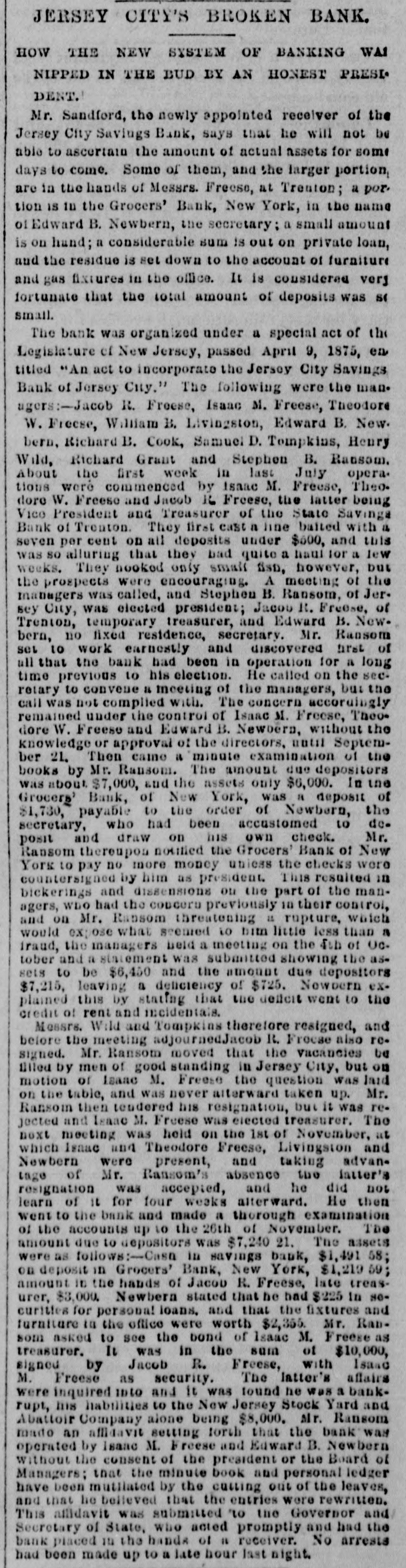 JERSEY CITY'S BROKEN BANK. HOW THE NEW SYSTEM OF BANKING WAS NIPPED IN THE BUD BY AN HONEST PRESIDENT. Mr. Sandford, the newly appointed receiver of the Jersey City Savings Bank, says that he will not be able to ascertain the amount of actual assets for some days to come. Some of them, and the larger portion are in the hands of Messrs. Freese, at Trenton; a por. tion is in the Grocers' Bank, New York, in the name of Edward B. Newbern, the secretary; a small amount is on hand; a considerable sum is out on private loan, and the residue is set down to the account of furniture and gas fixtures in the office. It is considered very fortunate that the total amount of deposits was St small. The bank was organized under a special act of the Legislature of New Jersey, passed April 9, 1875, en titled "An act to incorporate the Jersey City Savings Bank of Jersey City." The following were the managers:-Jacob R. Freese, Isaac M. Freese, Theodore W. Freese, William B. Livingston, Edward B. New. bern, Richard B. Cook, Samuel D. Tempkins, Henry Wild, Richard Grant and Stephen B. Ransom. About the Drst week in last July opera. tions were commenced by Isaac M. Freese, Theo. dore W. Freese and Jacob 16 Freese, the latter being Vico President and Treasurer of the State Savings Bank of Trenton. They first cast a line baited with a seven per cent on all deposits under $600, and this was so alluring that they bad quite a haul for a lew weeks. They nooked only small fish, however, but the prospects were encouraging. A meeting of the managers was called, and Stephen B. Ransom, of Jersey City, was elected president; Jacob R. Freese, of Trenton, temporary treasurer, and Edward B. New. bern, no fixed residence, secretary. Mr. Ransom set to work earnestly and discovered first of all that the bank had been in operation for a long time previous to his election. He called on the secretary to convene a meeting of the managers, but the call was not complied with. The concern accordingly remained under the control of Isaac M. Freese, Theodore W. Freese and Edward B. Newbern, without the knowledge or approval of the directors, until September 21. Then caine a minute examination of the books by Mr. Ransom. The amount due depositors was about $7,000, and the assets only $6,000. In the Grocers' Bank, of New York, was a deposit of $1,730, payable to the order of Newbern, the secretary, who had been accustomed to deposit and draw on his own check. Mr. Ransom thereupon notified the Grocers' Bank of New York to pay no more money unless the checks were countersigned by him as president. This resulted in bickerings and dissensions on the part of the managers, WDO had the concern previously in their control, and on Mr. Ransom threatening a rupture, which would expose what seened to him little less than a iraud, the managers held a meeting on the 4th of Oc. tober and a statement was submitted showing the assets to be $6,450 and the amount due depositors $7,215, leaving a deliciency of $725. Nowbern explained this by stating that the deficit went to the credit of rent and incidentals. Messrs. Wild and Tompkins therefore resigned, and before the meeting adjournedJacob R. Frocse also resigned. Mr. Ransom moved that the vacancies be filled by men of good standing in Jersey City, but on motion of Isaac M. Freese the question was laid on the table, and was never alterward taken up. Mr. Ransom then tendered his resignation, but it was rejected and Isaac M. Freese Was elected treasurer. The noxt meeting was held on the 1st of November, at which Isnac and Theodore Freese, Livingston and Newbern were present, and taking advantage of Mr. Ransom's absence the intter's resignation was accepted, and he did not learn of it for four weeks alterward. He then went to the bank and made a thorough examination of the accounts up to the 26th of November. The amount due to depositors was $7,240 21. The assets were as follows:-Casa in savings bank, $1,491 58; on deposit in Grocers' Bank, New York, $1,219 59; amount in the hands of Jacob R. Freese, late treasurer, $3,000. Newbern stated that he had $225 in NOcurities for personal loans, and that the fixtures and furniture to the office were worth $2,355. Mr. Ransom asked to see the bond of Isaac M. Freese as treasurer. It was in the sum of $10,000, signed by Jacob R. Freese, with Isanc M. Freese as security. The latter's affairs were inquired into and it was found he was a bankrupt, his habilities to the New Jersey Stock Yard and Abattoir Company alone being $8,000. Mr. Ransom made an affidavit setting forth that the bank was operated by Leane M. Freese and Edward R Newbern