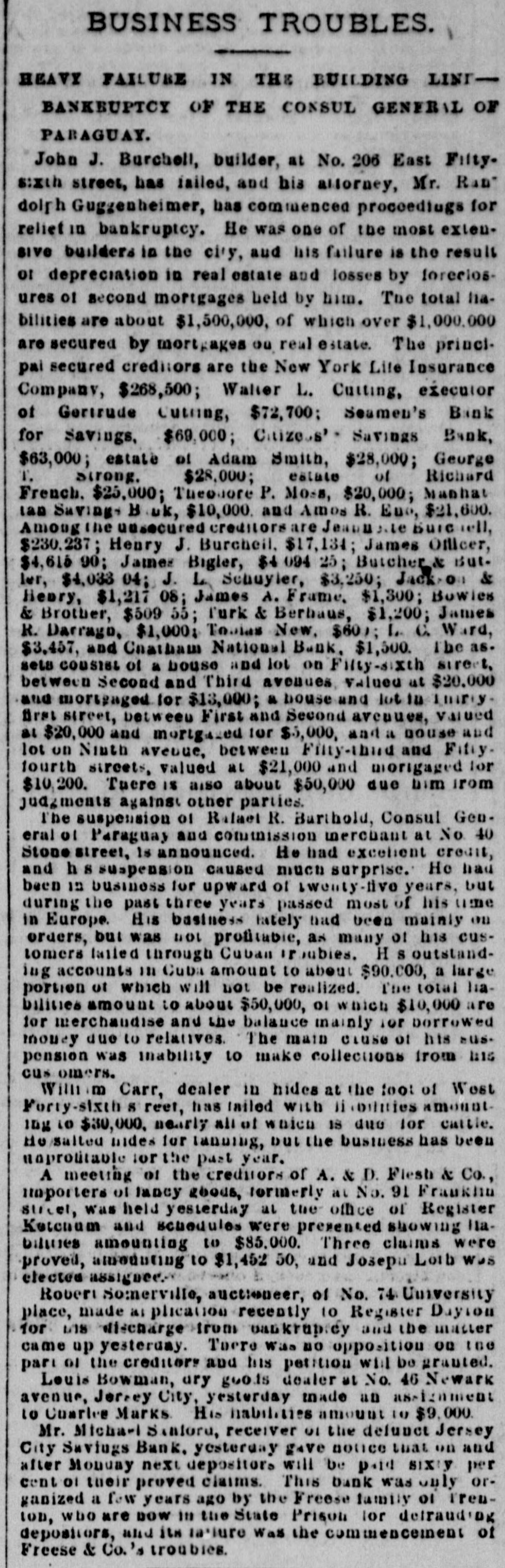 BUSINESS TROUBLES. HEAVY FAILURE IN THE BUILDING LINIBANKBUPTCY OF THE CONSUL GENERAL OF PARAGUAY. John J. Burchell, builder, at No. 206 East Filty. sixth street, has failed, and his allorney, Mr. Ran dolgh Guggenheimer, has commenced proceediugs for reliet in bankruptcy. He was one of the most extensive builders in the city, and his failure is the result of depreciation in real estate and losses by forecios. ures of second mortgages held by him. The total habilities are about $1,500,000, of which over $1,000,000 are secured by mortgages ou real estate. The principai secured creditors are the New York Life Insurance Company, $268,500; Walter L. Cutting, executor of Gertrude Cutting, $72,700: Seamen's Bank for Savings, $69,000; Citizens' Savings Bank, $63,000; estate of Adam Smith, $28,000; George 1. strong. $28,000; estate of Richard French. $25,000; Theomore P. Mosa, $20,000; Manhat lan Saving, B uk, $10,000. and Amos R. Euo, $21,600. Among the unsecured creditors are Jessubile Bure tell, $230.237; Henry J. Burcheil, $17,134; James Officer, $4,616.90 James Bigler, $409425; Butcher & But. her, $4,033 04; J. L Schuyler, $3,250; Jack - & Henry, $1,217 08; James A. Frame, $1,300; Bowles & Brother, $509 55; Turk & Berhaus, $1,200; James R. Darrago, $1,000; Tobias New, $601; 1. a Ward, $3,457. and Cnatham National Bank, $1,500. The as. sets COUSISL of a house and lot on Filty-sixth STREEL between Second and Third avenues, valued at $20,000 and mortgaged for $13,000; a house and lot in Immy. first street, between First and Second avenues, valued al $20,000 and morigated for $5,000, and it house and lot on Niuth avenue, between Filty-third and Fifty. fourth streets, valued at $21,000 and morigaged for $10,200. Tuere IS also about $50,000 due bim from judgments against other parties. The suspension of Relael R. Barthold, Consul Gen. eral 01 Paraguay and commission merchant at No 40 Stone street, Is announced. He had excellent credit, and h 8 suspension caused much surprise. He had been 12 business for upward of twenty-tive years, but during the pass three years passed most of his ume in Europe. His basiness lately had been mainly ou orders, but was not protitable, as many of his customers failed through Cuban ir publies. H S outstanding accounts 111 Cuba amount to about $90.000, a large portion of which will not be realized. The total liabilities amount to about $50,000, 01 which $10,000 are for merchandise and the balance mainly for borrowed money due to relatives. The main CLUSE of his sus. pension was inability to make collections from his cus omers. Willi m Carr, dealer in hides at the too: of West Forty-sixth S reet, has tailed with 11 dillities amount 10K to $30,000, nearly all of which is due lor cattle. to salted mides for tanning, but the business has been unprotitable for the past year. A meeting of the creditors of A. & D. Flesh & Co., umporters of lancy goods, tormerly at No. 91 Fraukhu Sticel, was held yesterday at the office of Register Ketchum and schedules were presented showing llabillines amounting to $85.000. Three claims were proved, amounting to $1,452 50, and Josepu Loth was elected assignee. Robert Somerville, auctioneer, of No. 74 University place, made at plication recently to Register Dayton for L18 discharge from backrup.cy and the matter came up yesterday. Tuere was no opposition on the part 01 the creditors and his petition will be granted. Louis Bowman, ary goods doaler wi No. 46 Newark avenue, Jerrey City, yesterday made an assignment to Cuarlee Marks His habilities amount to $9,000. Mr. Micha-i Sinfore, receiver 01 the defunct Jersey City Savings Bank. yesterday gave notice that on and after Monuay next depositors will be p.id sixty per cent 01 their proved claims. This bank was only organized a few years ago by the Freese family 01 Trenton, who are DOW in the State Prison lor defraudida depositors, and its ta'lure Was the cominencemnen of Freese & Co.'s troubies.