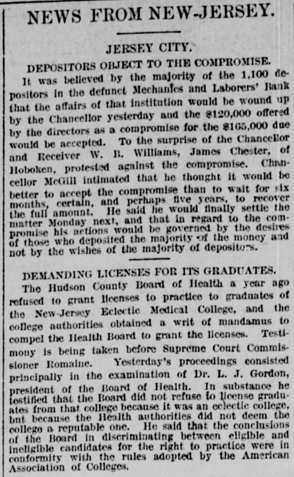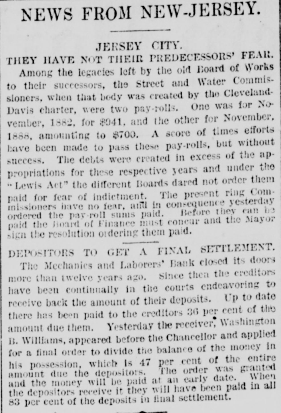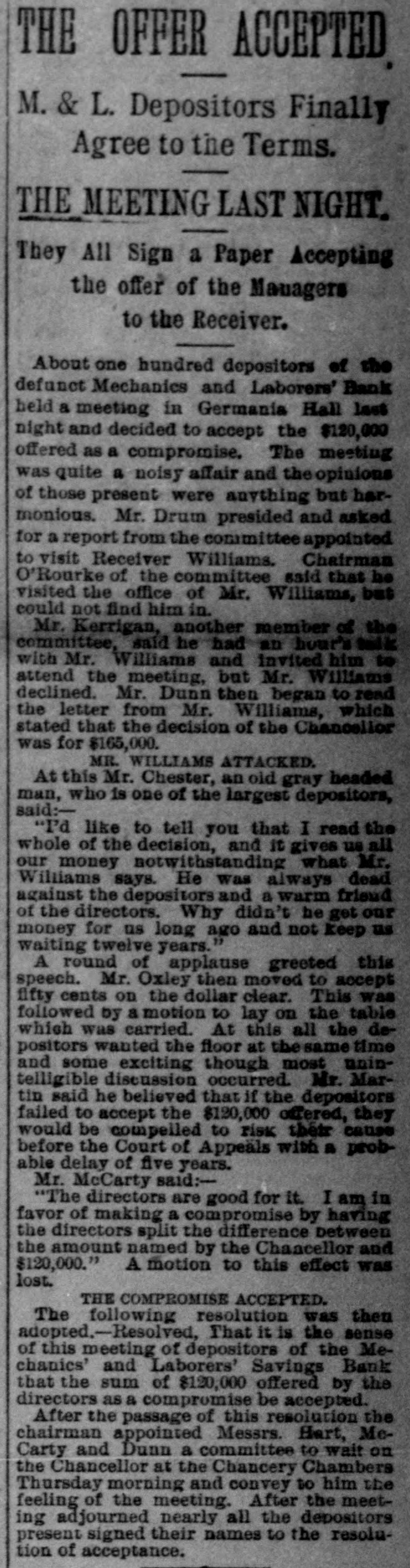 THE OFFER ACCEPTED M. & L. Depositors Finally Agree to the Terms. THE MEETING LAST NIGHT. They All Sign a Paper Accepting the offer of the Mauagers to the Receiver. About one hundred depositors of the defunct Mechanics and Laborers' Bank held a meeting in Germania Hall last night and decided to accept the $120,000 offered as a compromise. The meeting was quite a noisy affair and the opinions of those present were anything but harmonious. Mr. Drum presided and asked for a report from the committee appointed to visit Receiver Williams. Chairman O'Rourke of the committee said that he visited the office of Mr. Williams, but could not find him in. Mr. Kerrigan, another member of the committee, said he had an hour's selk with Mr. Williams and invited him to attend the meeting, but Mr. Williams declined. Mr. Dunn then began to read the letter from Mr. Williams, which stated that the decision of the Chancellor was for $165,000. MR. WILLIAMS ATTACKED. At this Mr. Chester, an old gray headed man, who is one of the largest depositors, said:"P'd like to tell you that I read the whole of the decision, and it gives us all our money notwithstanding what Mr. Williams says. He was always dead against the depositors and a warm friend of the directors. Why didn't be get our money for as long ago and not keep us waiting twelve years. A round of applause greeted this speech. Mr. Oxley then moved to accept fifty cents on the dollar clear. This was followed by a motion to lay on the table which was carried. At this all the depositors wanted the floor at the same time and some exciting though most unintelligible discussion occurred. Mr. Martin said he believed that if the depositors failed to accept the $120,000 offered, they would be compelled to risk their cause before the Court of Appeals with a probable delay of five years. Mr. McCarty said:"The directors are good for it. I am in favor of making a compromise by having the directors split the difference between the amount named by the Chaacellor and $120,000." A motion to this effect was lost. THE COMPROMISE ACCEPTED. The following resolution was then adopted.-Resolved, That it is the sense of this meeting of depositors of the Mechanics' and Laborers' Bank sum offered the directors that the of $120,000 Savings by as a compromise be accepted. After the passage of this resolution the chairman appointed Messrs. Hert, MeCarty and Dunn a committee to wait on the Chancellor at the Chancery Chambers Thursday morning and convey to him the feeling of the meeting. After the meeting adjourned nearly all the depositors present signed their names to the resolution of acceptance.