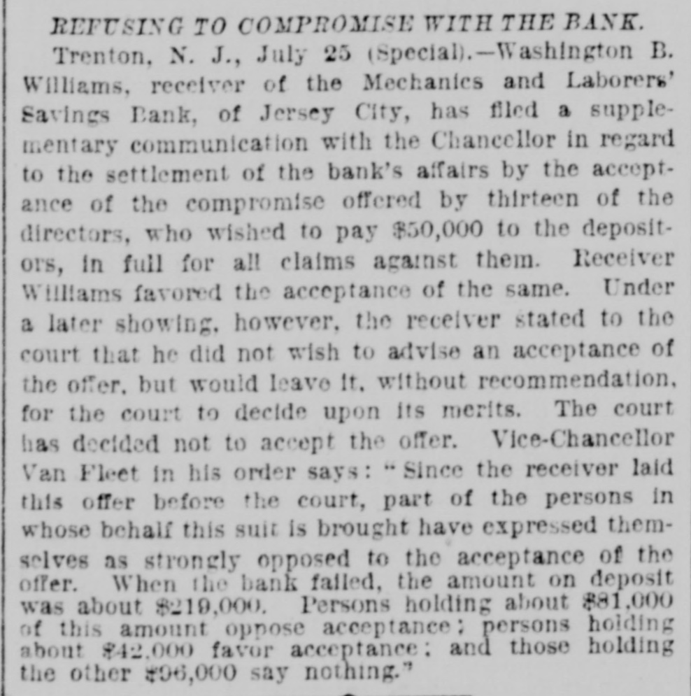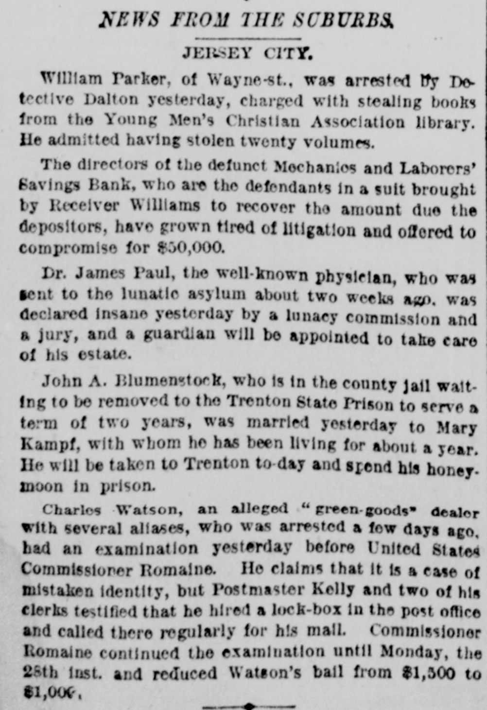 NEWS FROM THE SUBURBS JERSEY CITY. William Parker, of Wayne-st. was arrested by Do tective Dalton yesterday, charged with stealing books from the Young Men's Christian Association library. He admitted having stolen twenty volumes. The directors of the defunct Mechanics and Laborers' Savings Bank, who are the defendants in a suit brought by Receiver Williams to recover the amount due the depositors, have grown tired of litigation and offered to compromise for $50,000. Dr. James Paul, the well-known physician, who was sent to the lunatic asylum about two weeks ago. was declared insane yesterday by a lunacy commission and & jury, and a guardian will be appointed to take care of his estate. John A. Blumenstock, who is in the county jail waiting to be removed to the Trenton State Prison to serve a term of two years, was married yesterday to Mary Kampf, with whom he has been living for about a year. He will be taken to Trenton to-day and spend his honey. moon in prison. Charles Watson, an alleged " green-goods* dealer with several aliases, who was arrested a few days ago, had an examination yesterday before United States Commissioner Romaine. He claims that It is a case of mistaken identity, but Postmaster Kelly and two of his clerks testified that he hired a lock-box in the post office and called there regularly for his mall. Commissioner Romaine continued the examination until Monday, the 28th inst. and reduced Watson's bail from $1,500 to $1,000,