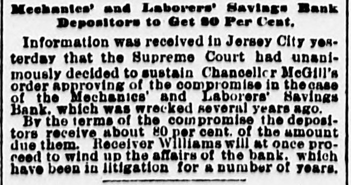 # Mechanics' and Laborers' Savings Bank # Depositors to Get 50 Per Cent. Information was received in Jersey City yesterday that the Supreme Court had unanimously decided to sustain Chancellor McGill's order approving of the compromise in the case of the Mechanics' and Laborers' Savings Bank, which was wrecked several years ago. By the terms of the compromise the depositors receive about 80 per cent. of the amount due them. Receiver Williams will at once proceed to wind up the affairs of the bank, which have been in litigation for a number of years.