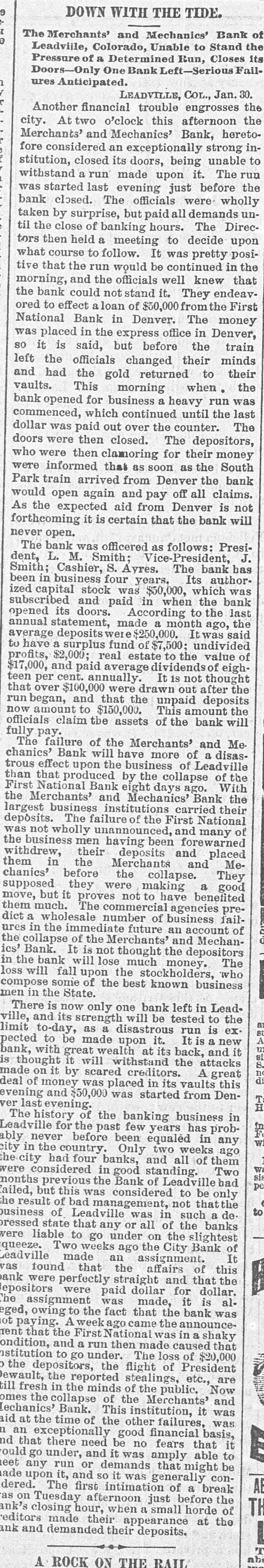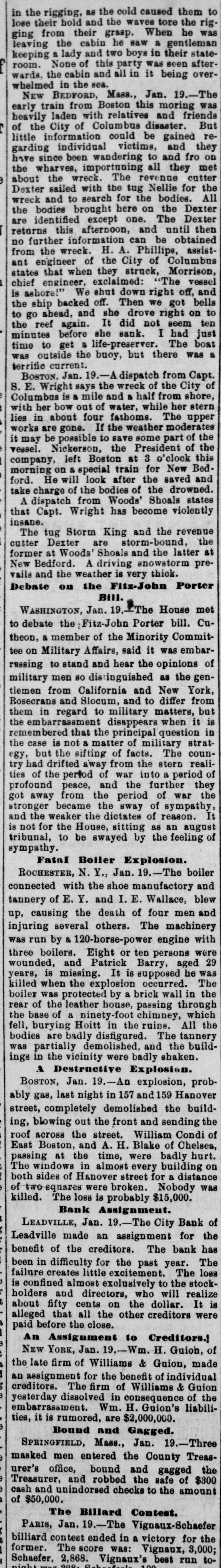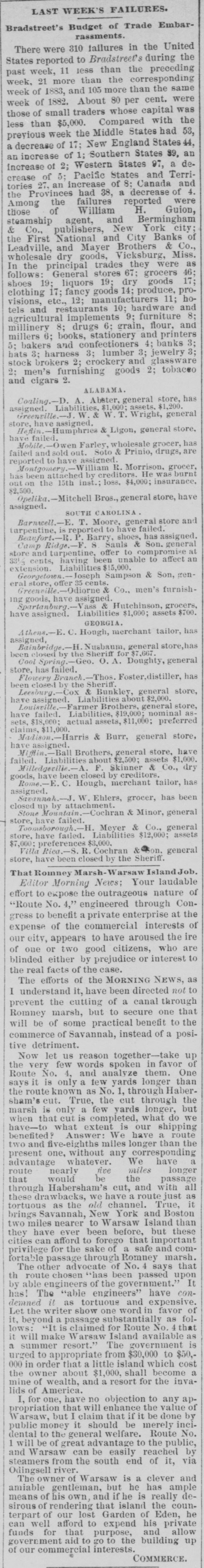 LAST WEEK'S FAILURES. Bradstreet's Budget of Trade Embarrassments. There were 310 failures in the United States reported to Bradstreeťs during the past week, 11 less than the preceding week, 21 more than the corresponding week of 1883, and 105 more than the same week of 1882. About 80 per cent. were those of small traders whose capital was less than $5,000. Compared with the previous week the Middle States had 53, a decrease of 17; New England States 44, an increase of 1; Southern States $9, an increase of 2; Western States 97, a decrease of 5; Pacific States and Territories 27, an increase of 8: Canada and the Provinces had 38, a decrease of 4. Among the failures reported were those of William H. Guion, steamship agent, and Bermingham & Co., publishers, New York city; the First National and City Banks of Leadville, and Mayer Brothers & Co., wholesale dry goods, Vicksburg, Miss. In the principal trades they were as follows: General stores 67; grocers 46; shoes 19; liquors 19; dry goods 17; clothing 17; fancy goods 14; produce, provisions, etc., 12; manufacturers 11; hotels and restaurants 10: hardware and agricultural implements 9; furniture 8; millinery 8; drugs 6; grain, flour. and millers 6; books, stationery and printers 5; bakers and confectioners 4; banks 3; hats 3; harness 3; lumber 3; jewelry 3; stock brokers 2; crockery and glassware 2; men's furnishing goods 2; tobacco and cigars 2. ALABAMA. Coaling.-D A. Abster, general store, has assigned. Liabilities, $1,000; assets. $1,200. Greenville.-J. W. & W.T. Wright, general store, have assigned. Heflin -Humphries & Ligon, general store, have failed. Mobile.-Owen Farley, wholesale grocer, has failed and sold out. Soto & Prinio, drugs, are reported to have assigned. Montgomery.- Villiam R. Morrison. grocer, has been attached by creditors. He was burnt out on the 15th inst.; loss, $4,000; insurance. $2,500. Opelika.-Mitchell Bros., general store, have assigned. SOUTH CAROLINA Barnacell.-E T. Moore, general store and turpentine, is reported to have failed. Beaufort.-R P. Barry, shoes, has assigned. Camp Ridge.-F. 8 Sauls & Son. general store and turpentine, offer to compromise at 3354 cents, having been unable to affect an extension. Liabilities $15,000. Georgetown. Joseph Sampson & Son, gen35 cents. offer eral store, Greenville -Odiorne & Co., men's furnishing goods, have assigned. Spartanburg.- & Hutchinson, grocers, have assigned. Liabilities $1,000; assets $700. GEORGIA. Athens.-E. C. Hough, merchant tailor, has assigned, Bainbridge. Nusbaum, general store,has been closed by the Sheriff for $7,667. Cool Spring.-Geo. O. A. Doughty, general store. has failed. Flowery Branch -Thos. Foster.distiller, has been closed by the Sheriff Leesburg.-Cox & Bunkley general store, have assigned. Liabilities about $2,000. Louisville. Farmer Brothers, general store, have failed. Liabilities, $19,000; nominal as sets, $18,000; actual assets, $11,000; preferred claims, $11,000. Madison.-Harris & Burr, general store, have assigned. Mifflin. Ball Brothers, general store, have failed. Liabilities about $2,500; assets $1,000. Milledgevilie.-! F. Skinner & Co., dry goods, have been closed by creditors. Rome.-E. C. Hough, merchant tailor, has assigned. Savannah.- W. Ehlers, grocer, has been closed up by attachment Stone intain.-Cochran & Minor, general store, have failed. Toomsborough.- H. Mever & Co., general store, have failed. Liabilities $12,000; assets $7,000: preferences $3,000. Villa Rica.-S. R. Cochran & general store, have been closed by the Sheriff. That Romney Marsh-Warsaw IslandJob. Editor Morning News; Your laudable effort to expose the outrageous nature of "Route No. 4," engineered through Congress to benefit a private enterprise at the expense of the commercial interests of our city, appears to have aroused the ire of one or two good citizens, who are blinded either by prejudice or interest to the real facts of the case. The efforts of the MORNING NEWS, as I understand it, have been directed not to prevent the cutting of a canal through Romney marsh, but to secure one that will be of some practical benefit to the commerce of Savannah, instead of a positive detriment. Now let us reason together-take up the very few words spoken in favor of Route No. 4. and analyze them. One says it is only a few yards longer than the route known as No. 1, through Habersham's cut. True, the cut through the marsh is only a few yards longer, but when that cut is completed, what do we have-to what extent is our shipping benefited? Answer: We have a route two and five-eighths miles longer than the present one, without any corresponding advantage whatever. We have a route nearly five miles longer that would be the passage through Habersham's cut, and with all these drawbacks, we have a route just as tortuous as the old channel. True, it brings Savannah, New York and Boston two miles nearer to Warsaw Island than they have ever been before, but these cities can afford to forego that important privilege for the sake of a safe and comfortable passage through Romney marsh. The other advocate of No. 4 says that th route chosen "has been passed upon by able engineers of the government. It has! The "able engineers" have condemned it as tortuous and expensive. Let the writer show one word in favor of it. beyond a passage substantially as follows: "It is claimed for Route No. that it will make W arsaw Island available as a summer resort The government is urged to appropriate from $30,000 to $50,000 in order that a little island which cost the owner about $1,000 shall become a mine of wealth, and a resort for the invalids of America. I, for one, have no objection to any appropriation that will enhance the value of Warsaw, but I claim that if it be done by public money it should be merely incidental to the general welfare. Route No. 1 will be of great advantage to the public, and Warsaw can be easily reached by steamers from the south end of it, via Odingsell river The owner of 