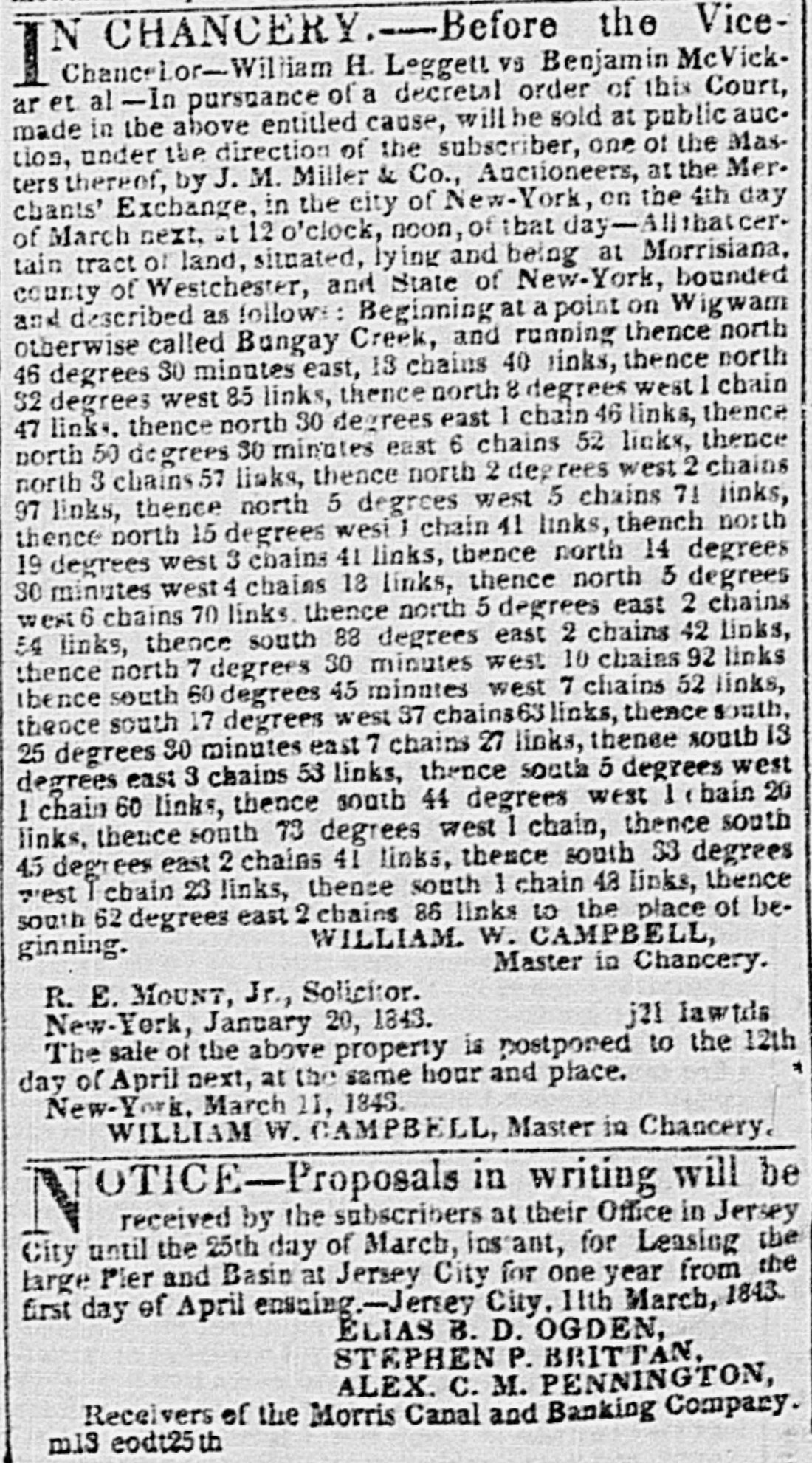 N CHANCERY - -Before the ViceChanceiLor-Wiliiam H. Loggett VS Benjamin McVickI ar et al -In pursuance of a decretal order of this Court, made in the above entitled cause, will he sold at public auction, under the direction of the subscriber, one of the Masters thereof, by J. M. Miller & Co., Auctioneers, at the Mer. chants' Exchange, in the city of New-York, on the 4th day of March next. at 12 o'clock, noon, of that day- Allihat tain tract of land, situated, lying and being at Morrisiana. county of Westchester, and State of New-York, bounded and described as follow: Beginning at a point on Wig warn otherwise called Bungay Creek, and running thence north 46 degrees 30 minutes east, 13 chains 40 links, thence north 32 degrees west 85 links, thence north 8 degrees west 1 chain 47 links. thence north 30 degrees east 1 chain 46 links, thence north 50 degrees so minutes east 6 chains 52 links, thence north 3 chains 57 lisks, thence north 2 degrees west 2 chains 97 links, thence north 5 degrees west 5 chains 71 links, thence north 15 degrees wesi ) chain 41 links, thench north 19 degrees west 3 chains 41 links, thence north 14 degrees 30 minutes west 4 chains 18 links, thence north 3 degrees west 6 chains 70 links. thence north 5 degrees east 2 chains 54 links, thence south 88 degrees least 2 chains 42 links, thence north 7 degrees 30 minutes west 10 chains 92 links libence south 60 degrees 45 minutes west 7 chains 52 links, thence south 17 degrees west 37 chains63links, thence south, 25 degrees 30 minutes east 7 chains 27 links, thence south 13 degrees east 3 chains 53 links, thence south 5 degrees west 1 chain 60 links, thence south 44 degrees west 1 chain 20 links, thence south 73 degrees west 1 chain, thence south 45 degrees least 2 chains 41 links, thence south 33 degrees west I chain 23 links, thence south 1 chain 48 links, thence south 62 degrees east 2 chains 86 links to the place of beWILLIAM. W. CAMPBELL, ginning. Master in Chancery. R. E. MOUNT, Jr., Solicitor. j21 lawtds New-York, January 20, 1843. The sale of the above property is postponed to the 12th day of April next, at the same hour and place. New-York. March 11, 1843. WILLIAM W. CAMPBELL, Master in Chancery, by the subscribers at their Office in Jersey NOTICE-Proposals in writing will be City until the 25th day of March, ins ant, for Leasing the large Pier and Basin at Jersey City for one year from the first day of April ensuing.-Jersey City. 11th March, 1843. ELIAS B. D. OGDEN, STEPHEN P. BRITTAN, ALEX. C. M. PENNINGTON, Receivers of the Morris Canal and Banking Company. ml3 eodt25th