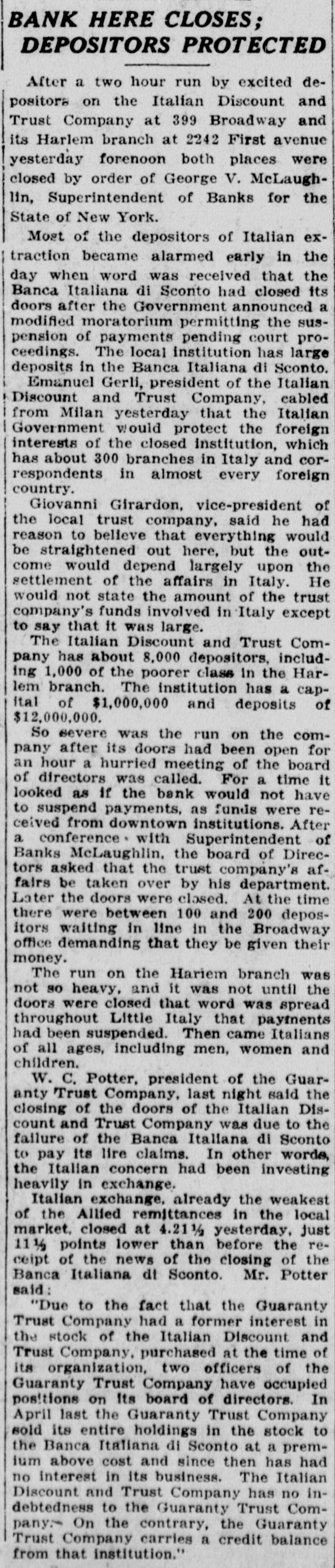 BANK HERE CLOSES; DEPOSITORS PROTECTED After a two hour run by excited depositora on the Italian Discount and Trust Company at 399 Broadway and its Harlem branch at 2242 First avenue yesterday forenoon both places were closed by order of George V. McLaughlin, Superintendent of Banks for the State of New York. Most of the depositors of Italian extraction became alarmed early in the day when word was received that the Banca Italiana di Sconto had closed its doors after the Government announced a modified moratorium permitting the suspension of payments pending court proceedings. The local institution has large deposits in the Banca Italiana di Sconto. Emanuel Gerli, president of the Italian Discount and Trust Company, cabled from Milan yesterday that the Italian Government would protect the foreign interests of the closed institution, which has about 300 branches in Italy and correspondents in almost every foreign country. Giovanni Girardon, vice-president of the local trust company, said he had reason to believe that everything would be straightened out here, but the outcome would depend largely upon the settlement of the affairs in Italy. He would not state the amount of the trust company's funds involved in Italy except to say that it was large. The Italian Discount and Trust Company has about 8,000 depositors, including 1,000 of the poorer class in the Harlem branch. The institution has a capital of $1,000,000 and deposits of $12,000,000. So severe was the run on the company after its doors had been open for an hour a hurried meeting of the board of directors was called. For a time it looked as if the bank would not have to suspend payments, as funds were recelved from downtown institutions. After a conference with Superintendent of Banks McLaughlin, the board of Directors asked that the trust company's affairs be taken over by his department. Later the doors were closed. At the time there were between 100 and 200 depositors waiting in line in the Broadway office demanding that they be given their money. The run on the Hariem branch was not so heavy. and it was not until the doors were closed that word was spread throughout Little Italy that payments had been suspended. Then came Italians of all ages, including men, women and children. W. C. Potter, president of the Guaranty Trust Company, last night said the closing of the doors of the Italian Discount and Trust Company was due to the failure of the Banca Italiana di Sconto to pay its lire claims. In other worde, the Italian concern had been investing heavily in exchange. Italian exchange, already the weakest of the Allied remittances in the local market. closed at 4.21 1/2 yesterday, just 11 1/2 points lower than before the receipt of the news of the closing of the Banca Italiana dt Sconto. Mr. Potter said: "Due to the fact that the Guaranty Trust Company had a former interest in the stock of the Italian Discount and Trust Company. purchased at the time of its organization, two officers of the Guaranty Trust Company have occupied positions on its board of directors. In April last the Guaranty Trust Company sold its entire holdings in the stock to the Banca Italiana di Sconto at a premium above cost and since then has had no interest in its business. The Italian Discount and Trust Company has no indebtedness to the Guaranty Trust Company.- On the contrary. the Guaranty Trust Company carries a credit balance from that institution."