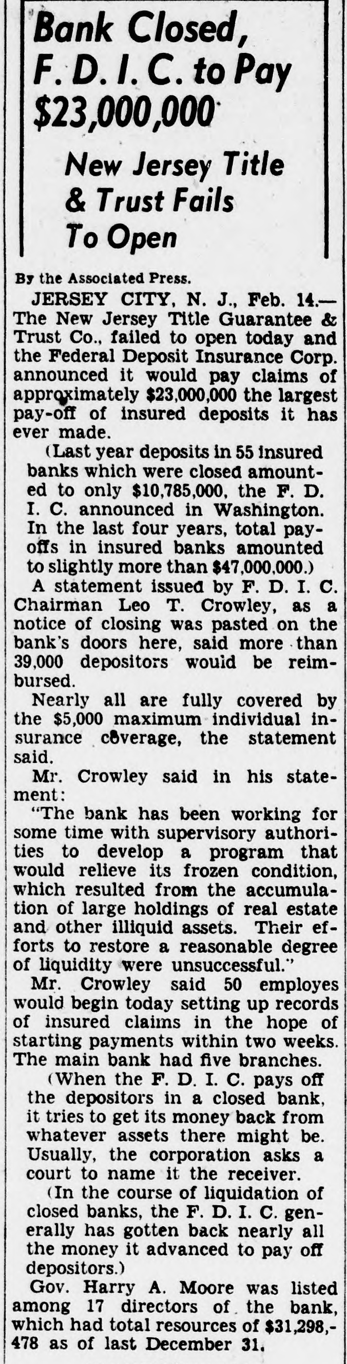 Bank Closed, F. D. .I.C. to Pay $23,000,000 New Jersey Title & Trust Fails To Open By the Associated Press. JERSEY CITY, N. J., Feb. 14.The New Jersey Title Guarantee & Trust Co., failed to open today and the Federal Deposit Insurance Corp. announced it would pay claims of approximately $23,000,000 the largest pay-off of insured deposits it has ever made. (Last year deposits in 55 insured banks which were closed amounted to only $10,785,000, the F. D. I. C. announced in Washington. In the last four years, total payoffs in insured banks amounted to slightly more than $47,000,000.) A statement issued by F. D. I. C. Chairman Leo T. Crowley, as a notice of closing was pasted on the bank's doors here, said more than 39,000 depositors would be reimbursed. Nearly all are fully covered by the $5,000 maximum individual insurance coverage, the statement said. Mr. Crowley said in his statement: "The bank has been working for some time with supervisory authorities to develop a program that would relieve its frozen condition, which resulted from the accumulation of large holdings of real estate and other illiquid assets. Their efforts to restore a reasonable degree of liquidity were unsuccessful." Mr. Crowley said 50 employes would begin today setting up records of insured claims in the hope of starting payments within two weeks. The main bank had five branches. (When the F. D. I. C. pays off the depositors in a closed bank, it tries to get its money back from whatever assets there might be. Usually, the corporation asks a court to name it the receiver. (In the course of liquidation of closed banks, the F. D. I. C. generally has gotten back nearly all the money it advanced to pay off depositors.) Gov. Harry A. Moore was listed among 17 directors of the bank, which had total resources of $31,298,478 as of last December 31.