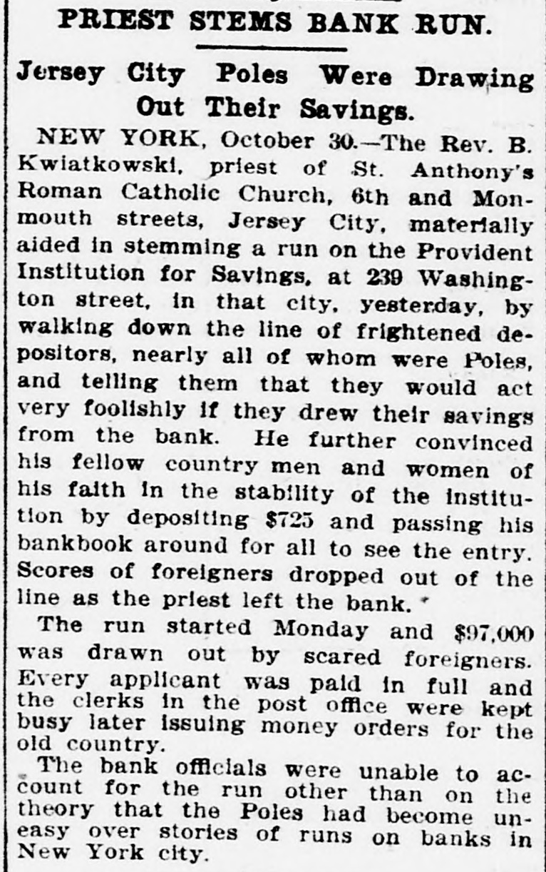 PRIEST STEMS BANK RUN. Jersey City Poles Were Drawing Out Their Savings. NEW YORK, October 30.-The Rev. B. Kwiatkowski, priest of St. Anthony's Roman Catholic Church, 6th and Monmouth streets, Jersey City, materially aided in stemming a run on the Provident Institution for Savings, at 239 Washington street, in that city, yesterday, by walking down the line of frightened depositors, nearly all of whom were Poles, and telling them that they would act very foolishly if they drew their savings from the bank. He further convinced his fellow country men and women of his faith in the stability of the institution by depositing $725 and passing his bankbook around for all to see the entry. Scores of foreigners dropped out of the line as the priest left the bank. The run started Monday and $97,000 was drawn out by scared foreigners. Every applicant was paid in full and the clerks in the post office were kept busy later issuing money orders for the old country. The bank officials were unable to account for the run other than on the theory that the Poles had become uneasy over stories of runs on banks in New York city.