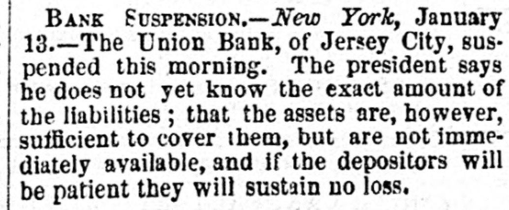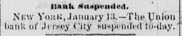 BANK SUSPENSION.-New York, January 13.-The Union Bank, of Jersey City, suspended this morning. The president says be does not yet know the exact amount of the liabilities; that the assets are, however, sufficient to cover them, but are not immediately available, and If the depositors will be patient they will sustain no loss.