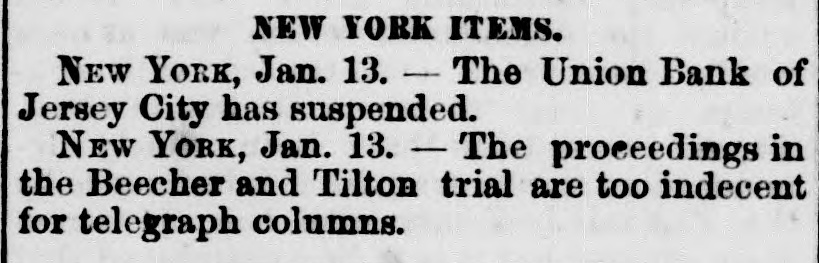 NEW YORK ITEMS. NEW York, Jan. 13. - The Union Bank of Jersey City has suspended. NEW YORK, Jan. 13. - The proceedings in the Beecher and Tilton trial are too indecent for telegraph columns.