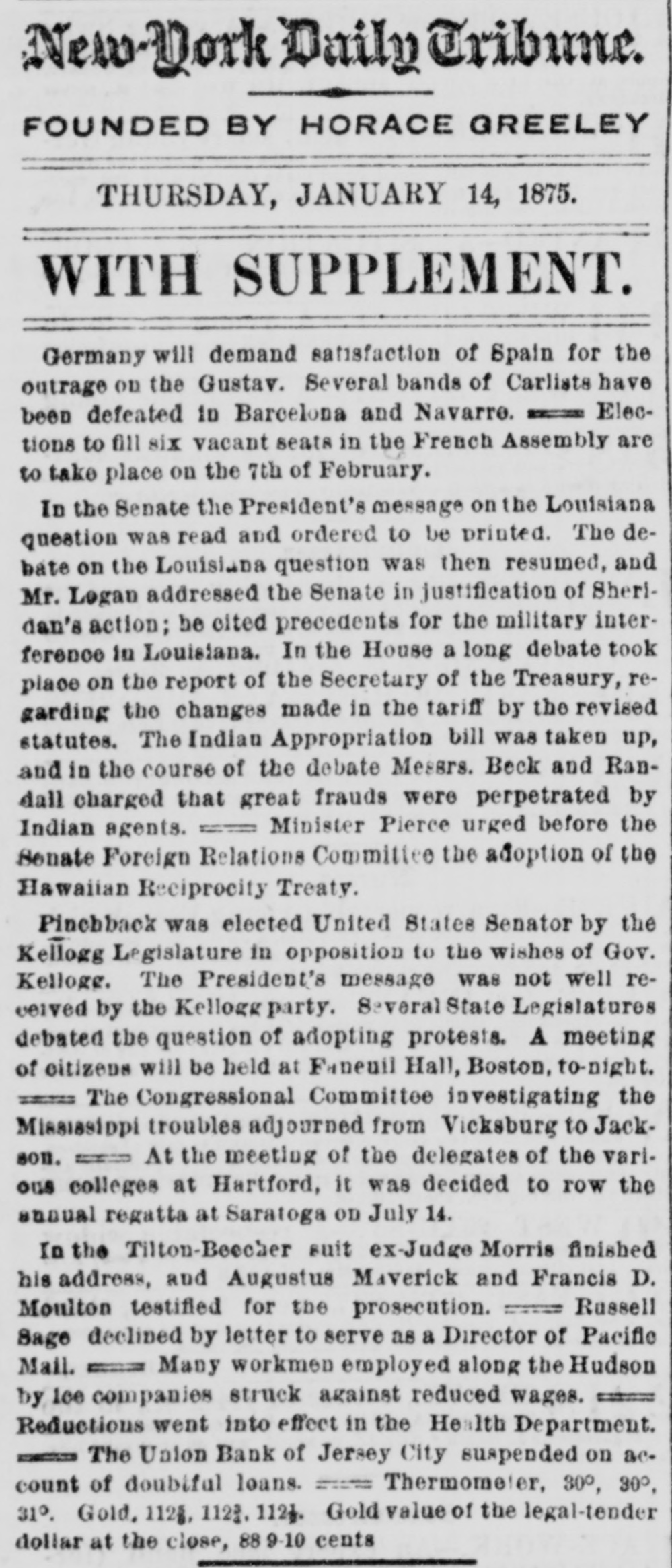 New-York Daily Tribune. FOUNDED BY HORACE GREELEY THURSDAY, JANUARY 14, 1875. WITH SUPPLEMENT. Germany will demand satisfaction of Spain for the outrage on the Gustav. Several bands of Carlists have been defeated in Barcelona and Navarro. - Elections to fill six vacant seats in the French Assembly are to take place on the 7th of February. In the Senate the President's message on the Louisiana question was read and ordered to be printed. The debate on the Louisiana question was then resumed, and Mr. Legan addressed the Senate in justification of Sheridan's action; be cited precedents for the military interference in Louisiana. In the House a long debate took place on the report of the Secretary of the Treasury, regarding the changes made in the tariff by the revised statutes. The Indian Appropriation bill was taken up, and in the course of the debate Messrs. Beck and Randall charged that great frauds were perpetrated by Indian agents. Minister Pierce urged before the Sonate Foreign Relations Committee the adoption of the Hawaiian Reciprocity Treaty. Pinchback was elected United States Senator by the Kellogg Legislature in opposition to the wishes of Gov. Kellogg. The President's message was not well revelved by the Kellogg party. SeveralState Legislatures debated the question of adopting protests. A meeting of citizens will be held at Faneuil Hall, Boston, to-night. ====== The Congressional Committee investigating the Mississippi troubles adjourned from Vicksburg to Jackson. - At the meeting of the delegates of the various colleges at Hartford, it was decided to row the annual regatta at Saratoga on July 14. In the Tilton-Beecher suit ex-Judge Morris finished his address, and Augustus Maverick and Francis D. Moulton testified for the prosecution. Russell Sage declined by letter to serve as a Director of Pacific Mail. Many workmen employed along the Hudson by Ice companies struck against reduced wages. Reductions went into effect in the Health Department. - The Ualon Bank of Jersey City suspended on ac. count of doubtful loans. === Thermometer, 30°, 30°, 31°. Gold, 1125, 112g. 112). Gold value of the legal-tender dollar at the close, 88 9-10 cents