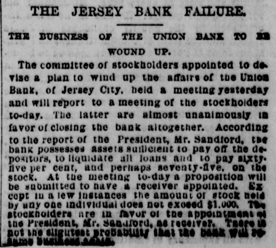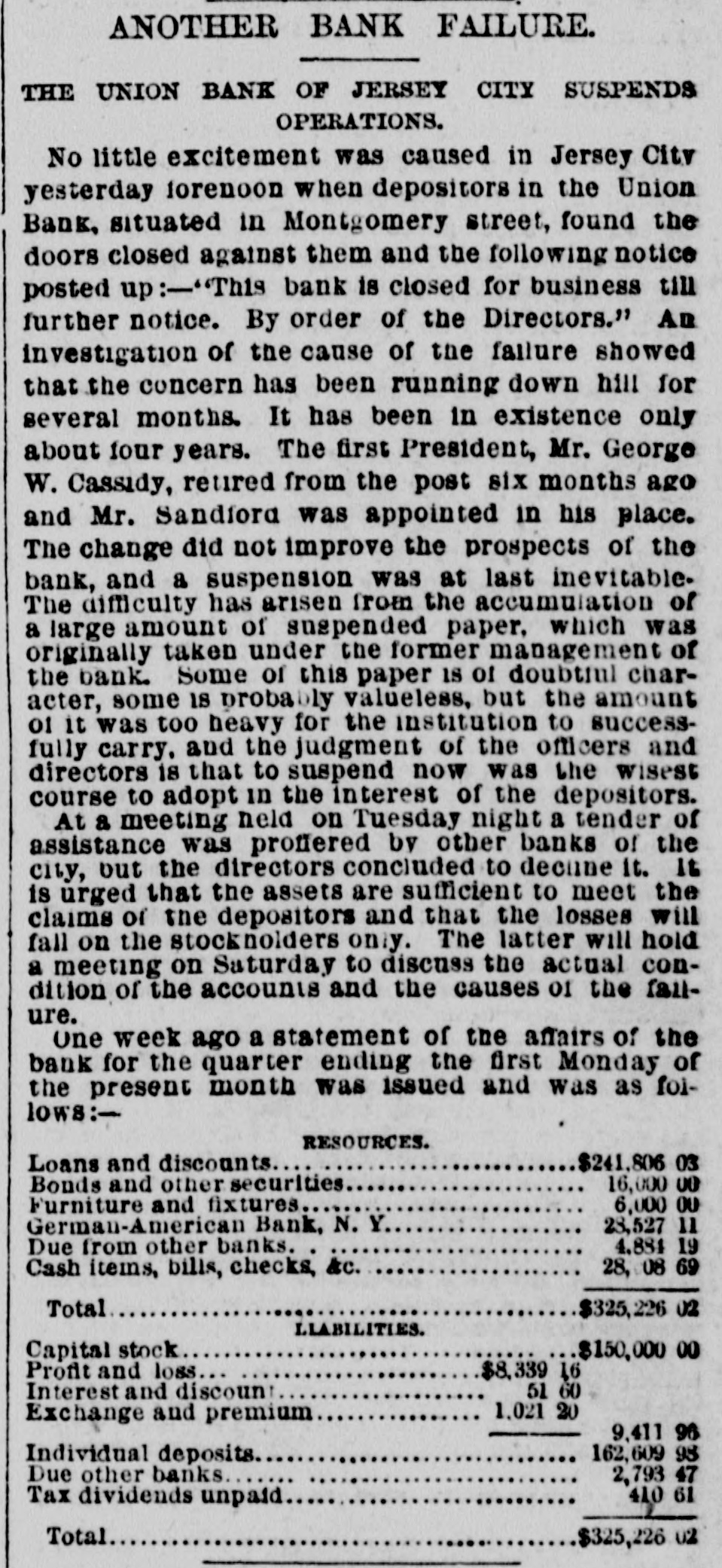ANOTHER BANK FAILURE. THE UNION BANK OF JERSEY CITY SUSPENDS OPERATIONS. No little excitement was caused in Jersey City yesterday forenoon when depositors in the Union Bank, situated in Montgomery street, found the doors closed against them and the following notice posted up:-"This bank is closed for business till further notice. By order of the Directors." An investigation of the cause of the failure showed that the concern has been running down hill for several months. It has been in existence only about four years. The first President, Mr. George W. Cassidy, retired from the post six months ago and Mr. Sandford was appointed in his place. The change did not improve the prospects of the bank, and a suspension was at last inevitableThe difficulty has arisen from the accumulation of a large amount of suspended paper, which was originally taken under the former management of the bank. Some of this paper IS of doubtful character, some is probably valueless, but the amount 01 it was too heavy for the institution to successfully carry. and the judgment of the officers and directors is that to suspend now was the wisest course to adopt in the interest of the depositors. At a meeting neld on Tuesday night a tender of assistance was proffered by other banks of the city, but the directors concluded to decune it. It is urged that the assets are sufficient to meet the claims of the depositors and that the losses will fall on the stocknolders only. The latter will hold a meeting on Saturday to discuss the actual condition of the accounts and the causes of the fallure. One week ago a statement of the affairs of the bank for the quarter ending the first Monday of the present month was issued and was as foilows:RESOURCES. Loans and discounts $241,806 03 Bonds and other securities 16,000 00 Furniture and fixtures 6,000 00 German-American Bank, N. Y 23,527 11 4.881 19 Due from other banks 28,08 69 Cash items, bills, checks, Ac. Total $325,226 02 LIABILITIES. $150,000 00 Capital stock Profit and loss $8,339 16 51 60 Interest and discount 1,021 20 Exchange and premium 9,411 96 162,609 98 Individual deposits Due other banks 2,793 47 410 61 Tax dividends unpaid Total $325,226 02