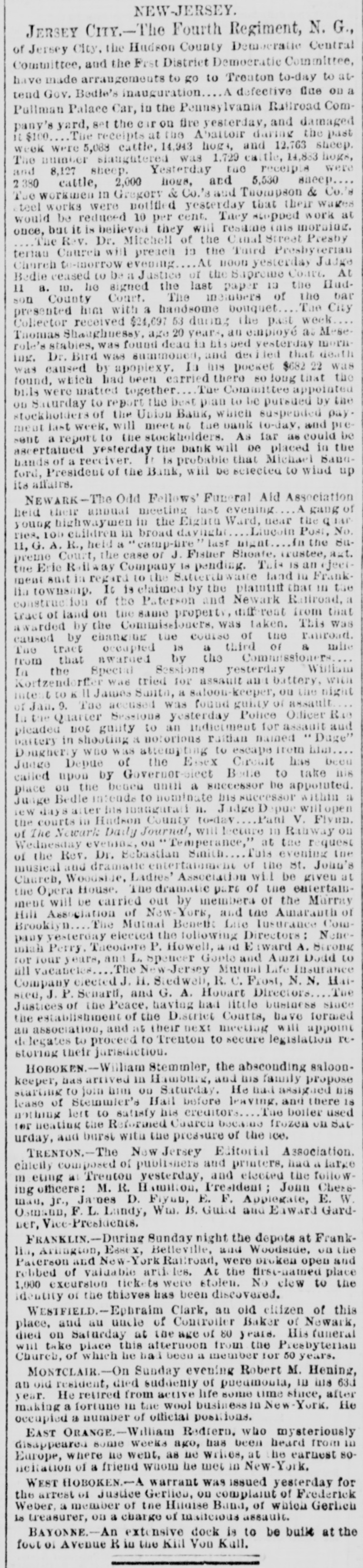 NEW-JERSEY. JERSEY CITY.-The Fourth Regiment, N. G., of Jersey City, the Hudson County Democratic Central Committee, and the Frst District Democratic Committee, have made arrangements to go to Trenton to-day to at- tend Gov. Bedle's inauguration....A defective flue on a Pullman Palace Car, in the Pennsylvania Railroad Com- pany's yard, set the car on fire yesterday, and damaged it $100.... The receipts at the Abattoir daring the past week were 5,088 cattle, 14,943 hogs, and 12.763 sheep. The number slaughtered was 1.729 cattle, 14,883 hoge, and 8,127 sheep. Yesterday tue receipts were 2380 cattle, 2,000 hogs, and 5,530 ваеер.... The workmen in Gregory & Co.'s and Thompson & Co.'s teel works were notified yesterday that their wares would be reduced 10 per cent. Tacy stopped work at once, but it is believed they will resume tais morning. ....The Rev. Dr. Mitchell of the Canal Street Presby terian Church will preach in the Taird Presbyterian Church to-morrow evening.... At noon yesterday Judge Bedie ceased to be a Justice of the Bapreme Court. At 11 a. m. he signed the last paper in the Hud- son County Court. The members of the bar presented him with a handsome bouquet.... The City Collector received $24,697 53 duong the past week.... Thomas Shaughnessy, age 20 years, an employé as Mese- role's stabies, was found dead in his bed yesterday morn ing. Dr. Bird was summoned, and decided that death was caused by apoplexy. In his pocket $682 22 was found, which had been carried there so long that the bils were matted together.... The Committee appointed on Saturday to report the best plan to be pursued by the stockholders of the Union Bank, which suspended pay- ment last week, will meet at the bank to-day, and pre- sent a report to the stockholders. As far as could be ascertained yesterday the bank will be placed in the hands of a recciver. It is probable that Michael Sana- ford, President of the Bank, wiil be selected to wind up its alfairs. NEWARK-The Odd Fellows' Funeral Aid Association heid their annual meeting last evening.... A gang of young highwaymen in the Eightu Ward, near the qаг- ries, 100 children in broad daynghi.... Liucoin Post, No. 11, G. A. R., held a "camp-fire" last night.... In the su- preme Court, the case of J. Fisher Shoate, trustee, azt. the Eric Railway Company is pending. This is an ejeer- ment suit in regard to the Satterthwate land in Frank- lia townsamp. It is claimed by the plaintiff that in the construction of the Paterson and Newark Ratiroad, a tract of land on the same property, different from that awarded by the Commissioners, was taken. This was caused by changing the course of the railroad. Tue tract occupted 18 a third of & mite from that awarded by the Commissioners.... In the Special Sessions yesterday William Kortzendorffer was tried for assault and battery, with Intent to all James Santa, a saloon-keeper, on the night of Jan. 9. The accused was found guilty of assault.... In the Quarter Sessions yesterday Police Odicer Rae pleaded not guity to an indictment for assault aud battery in shooting a notorions raitian nained "Duge" Dougherty who was attempting to escape from bla.... Judge Depue of the the Essex Circuit has been called upon by Governor-siect Bodle to take nis place ou the benen until a successor be appointed. Junge Bedle intends to nominate his successor within a tew days after his inaugurali n. Jadge Depue will open the courts in Hudson County to-dav... Pani V. Flivan. of The Newark Daily Journal, will lecture in Rahway on Wednesday evenias, on "Temperance," at the request of the Rev. Dr. Bebastian Sinith.... Fuis evening the musical and dramatte entertainment of the St. Joun's Church, Woodside, Ladies' Association will be given at the Opera House. The dramatic pars of the entertain- ment will be carried out by members of the Murray Hill Association of New-York, and the Amaranth of Brooklyn.... The Mutual Benetit Lite lusurance Com- pany yesterday elected the following Directors: None- miah Perry. Theodore P. Howell, and Erward A. Strong for four years, and L. spencer Gople and Amzi Dodd to üll vacancies.... The New Jersey Mutual Life Insurance Company elected J. H. Stedwali, R. C. Frost, N. N. Hai- sted, J. P. Senarti, and G. A. Hooart Directors....The Justices of the Peace, having had little business since the establishment of the District Courts, have formed an association, and at their next meetlag will appoint delegates to proceed to Trenton to secure legislation re- storing their jurisdiction. HOBOKEN. William Stemmler, the absconding saloon- keeper, has arrived in Hamburg, and is family propose starting to join him on Saturday. He had assigned nis lease of Stemmier's Hail before leaving, and there is nothing left to satisfy his creditors.... The boiler used tor neating the Reformed Caarcu bocans frozen on Sat urday, and burst with the pressure of the iw0. TRENTON. The New Jersey Editorial Association. chteily composed of publishers and printers, had a large meting at Trenton yesterday, and elected the follow- ing officers: M. R. Hamilton, I'resident; Jonn Chers- mau, jr., James D. Fiyun, E. F. Applegate, E. W. Ostmann, F. L. Landy, Wm. B. Guild and Eaward Gard- ner, Vice-Presidents. FRANKLIN. During Sunday night the depots at Frank- lia, Arlington, Essex, Belleville, and Woodside, on the Paterson and New-York Railroad, were proken open and robbed of valuable artiles. At the first-named place 1,000 excursion tickets were stolen. No clew to the identity of the thieves has been discovered. WESTFIELD.-Ephraim Clark, an old citizen of this place, and an uncle of Controller Baker of Newark, died on Saturday at the age of 80 years. His funeral will take place this afternoon from the Presbyterian Church, of which he had been a member for 50 years. MONTCLAIR.-On Sunday evening Robert M. Hening, an oid resident, died suddenly of pueamonta, in ins 631 year. He retired from active life some time since, after making a fortune in the wool bus