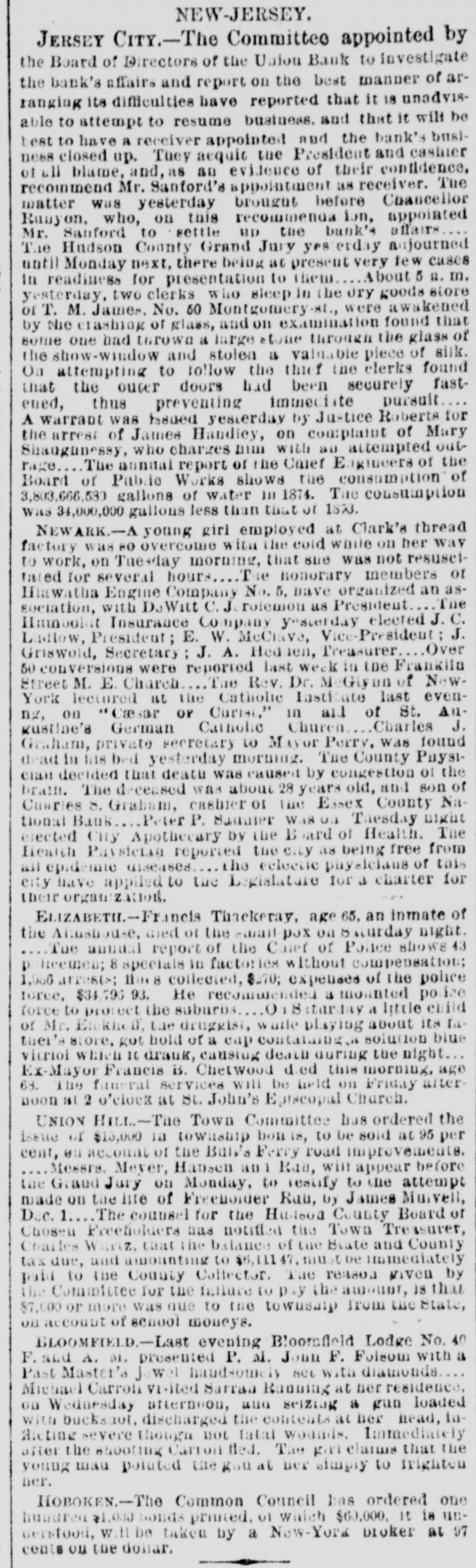 NEW-JERSEY. JERSEY CITY.-The Committee appointed by the Board of Directors of the Union Bank to investigate the bank's affairs and report on the best manner of arranging its difficulties have reported that it is unadvisable to attempt to resume business. and that it will be best to have a receiver appointed and the bank's business closed up. They aequit the President and cashier of all blame, and, as an evidence of their confidence, recommend Mr. Sanford's appointment as receiver. The matter was yesterday brought before Chancellor Runyon, who, on this recommenda ion, appointed Mr. Sanford to settle up the bank's affairs The Hudson County Grand Jury yes erday adjourned until Monday next, there being at present very few cases in readiness for presentation to them About 5 a. m. yesterday, two clerks who sleep in the ory goods store or T. M. James, No. 50 Montgomery-s were awakened by Nie crashing of glass, and on examination found that some one had thrown a large stone through the glass of the show-window and stolen a valuable piece of silk. On attempting to follow the thief the clerks found that the outer doors had been securely fastened, thus preventing immediate pursuit A warrant was issued yesterday by Justice Roberts for the arrest of James Handley, on complaint of Mary Shaugungssy, who charges ДПП with ao attempted outrage The annual report of The Chief Engineers of the Board of Public Works shows tue consumption of 3,803,666,530 gallons of water III 1874. The consumption was 34,000,000 gallons less than that or 1823. NEWARK.-A young girl employed at Clark's thread factory was 80 overcome with the cold while on her way to work, on Tuesday morning, that sue was not resuscitated for several hours Tue honorary members of Hiawatha Engine Company No. 5, Dave organized an asThe sociation, with DeWitt C.J. rolemon as President Hunnbolit Insurance Company yesterday elected J. C. Ludiow, President; E. W, McChave, Vice-President J. Griswold, Secretary J. A. Hedden, Treasurer Over 50 conversions were reported last week in the Franklin Street M. E. Charch The Rev. Dr. McGlyon of NewYork lectured at the Catholic Institute last evenng, on "Cæsar OF Curist," in aid of St. Allgustine's German Carholic Church Charles J. Graham, private secretary to Mayor Perry, was found dead in his bed yesterday morning. The County Physiclan decided that death was caused by congestion of the brain. The deceased was about 28 years old, and son of Cuarles S. Graham, cashier or the Essex County National Bank Peter P. Saunier Was 01 Tuesday night elected City Apothecary by the Board of Health. The Health Paysician reported the city as being free from all epidemic diseases the eclectic physicians of this city have applied to the Legislature for a charter for their organization. ELIZABETH.-Francis Thackeray, age 65, an inmate of the Almshouse, died of the small pox on saturday night. Tue anoual report of the Caler of Police shows 43 P licemen; 8 specials in factories without compensation; 1,056 arrests: 110.8 collected, $270; expenses of the police force, $34,796 He recommended a mounted ice force to project the suburbs ONS starday a little child or Mr. Eickhoff, the druggist, while playing about its father's store, got hold of a cap containing solution blue vitriol which 10 drank, causing death during the night Ex-Mayor Francis B. Chetwood died this morning, age 68. The funeral services will be held on Friday afternoon at 2 o'clock at St. John's Episcopal Church. UNION HILL.-The Town Committee has ordered the issue of $15,000 in township bonds, to be sold at 95 per cent, 00 account of the Bull's Ferry road improvements. Messrs. Meyer, Hansen and Rab, will appear before the Grand Jury on Monday, to Testify to the attempt made on the life of Freeholder Run, by James Mulvell, Dec. 1. The counsel for the Hunson County Board of Chosen Freeholders has notified the Town Treasurer, Coarles Wurtz, that the balance of tue State and County tax due, and amounting to $6,111.47, must be immediately paid to the County Collector. The reason given by the Committee for the failure to pay the amount, is that $7,000 or more was que to the township from the State, via account of school moneys. BLOOMFIELD.-Last evening Bloomfield Lodge No. 40 F. and A. D1. presented P. M. Jonn F. Folsom with a Past Master's J wel handsomely set with diamonds Michael Carron visited Sarran Running at ner residence, on Wednesday afternoon, and seizing a gun loaded with buckshot, discharged the contents at her head, inAleting severe though not fatal wounds. Immediately after the shooting Carron fled. The girl claims that the young man pointed the gun at ner simply to frighten ner. HOBOKEN.-The Common Council has ordered one hundred $1,000 bonds printed, 01 which $60,000, it is uncerstood, will be taken by a New-York broker at 97 cents on the dollar.
