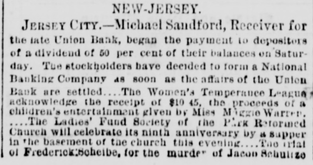 NEW-JERSEY JERSEY CITY.-Michael Sandford, Receiver for the late Union Bank, began the payment to depositors of a dividend of 50 per cent of their balances on Saturday. Tue stockholders bave decided to form a National Banking Company as soon as the affairs of the Union Bank are settled The Women's Temperance League acknowledge the receipt of $10 45, the proceeds of a children's entertainment given by Miss Miggle Warren. The Ladies' Fund Society of the Pick Reformed Church will celebrate its ninth anniversary by a supper in the basement of the church this evening The Trial of Frederick16cheibe, for the murder of Jacon Schulizo