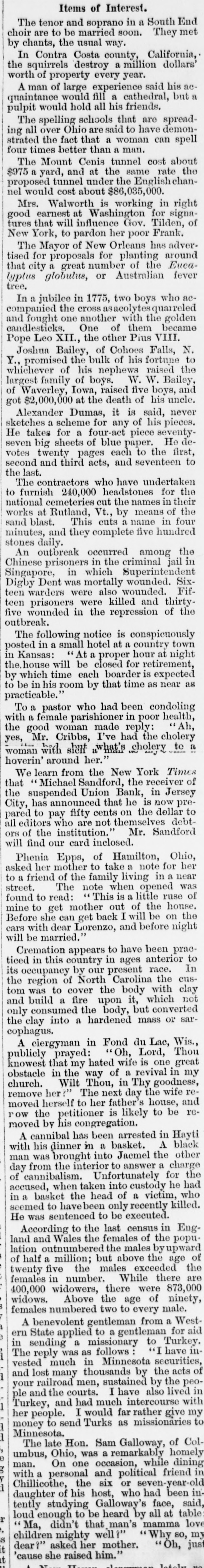 Items of Interest. The tenor and soprano in a South choir are to be married soon. They by chants, the usual way. In Contra Costa county, California the squirrels destroy a million dollars worth of property every year. A man of large experience said his quaintance would fill a cathedral, but pulpit would hold all his friends. The spelling schools that are spread ing all over Ohio are said to have demon strated the fact that a woman can four times better than a man. The Mount Cenis tunnel cost abou $975 a yard, and at the same rate proposed tunnel under the English nel would cost about $86,035,000. Mrs. Walworth is working in good earnest at Washington for signa tures that will influence Gov. Tilden, New York, to pardon her poor Frank. The Mayor of New Orleans has adver tised for proposals for planting that city a great number of the Euca Anstruction JO 'snmqoib smith tree. In a jubilee in 1775, two boys who companied the cross asacolytes quarrele and fought one another with the golder candlesticks. One of them became Pope Leo XII., the other Pius VIII. Joshua Bailey, of Cohoes Falls, Y., promised the bulk of his fortune whichever of his nephews raised largest family of boys. W. W. Bailey of Waverley, Iowa, raised five boys, got $2,000,000 at the death of his uncle Alexander Dumas, it is said, ketches a scheme for any of his pieces He takes for a four-act piece seventy even big sheets of blue paper. He votes twenty pages each to the first, second and third acts, and seventeen the last. The contractors who have undertaker o furnish 240,000 headstones for the national cemeteries cut the names in their works at Rutland, Vt., by means of and blast. This cuts a name in four minutes, and they complete five hundred tones daily. An outbreak occurred among the Chinese prisoners in the criminal jail Singapore, in which Superintendent Digby Dent was mortally wounded. een warders were also wounded. een prisoners were killed and thirty ive wounded in the repression of the utbreak. The following notice is conspicuously osted in a small hotel at a country town n Kansas: " At a proper hour at night he house will be closed for retirement, y which time each boarder is expected o be in his room by that time as near practicable.' To a pastor who had been condoling with a female parishioner in poor health, he good woman made reply: res, Mr. Cribbs, I've had the cholery voman with shult what's cholery to overin' around her." We learn from the New York Time hat Michael Sandford, the receiver he suspended Union Bank, in Jersey City, has announced that he is now ared to pay fifty cents on the dollar 11 editors who are not themselves debt rs of the institution." Mr. Sandford vill find our card inclosed. Phenia Epps, of Hamilton, Ohio sked her mother to take a note for o a friend of the family living in a street. The note when opened found to read: This is a little ruse nine to get mother out of the house Before she can get back I will be on ears with dear Lorenzo, and before night will be married." Cremation appears to have been siced in this country in ages anterior ts occupancy by our present race. the region of North Carolina the tom was to cover the body with and build a fire upon it, which only consumed the body, but converte the clay into a hardened mass or cophagus. A clergyman in Fond du Lac, Wis. publicly prayed: Oh, Lord, Tho knowest that my hated wife is one obstacle in the way of a revival in church. Wilt Thou, in Thy goodness remove her ?" The next day the wife moved herself to her father's house, r OW the petitioner is likely to be moved by his congregation. A cannibal has been arrested in Hay with his dinner in a basket. A blac man was brought into Jacmel the day from the interior to answer a charg of cannibalism. Unfortunately for accused, when taken into custody he in a basket the head of a victim, recently Aluo havebeen to seemed