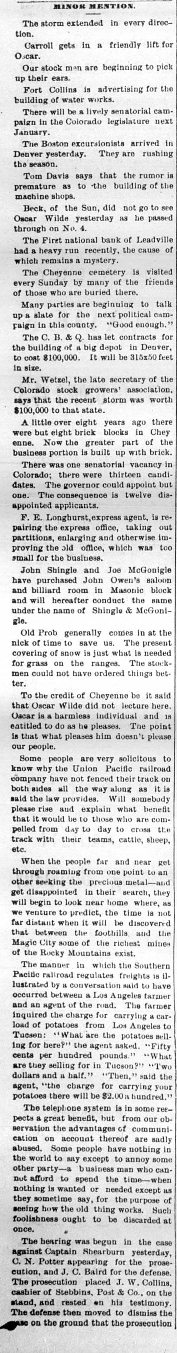MINOR MENTION. The storm extended in every direction. Carroll gets in a friendly lift for Oscar. Our stock men are beginning to pick up their ears. Fort Collins is advertising for the building of water works. There will be a lively senatorial campaign in the Colorado legislature next January. The Boston excursionists arrived in Denver yesterday. They are rushing the season. Tom Davis says that the rumor is premature as to the building of the machine shops. Beck, of the Sun, did not go to see Oscar Wilde yesterday as he passed through on No. 4. The First national bank of Leadville had a heavy run recently, the cause of which remains a mystery. The Cheyenne cemetery is visited every Sunday by many of the friends of those who are buried there. Many parties are beginuing to talk up a slate for the next political campaign in this county. "Good enough." The C. B. & Q. has let contracts for the building of a big depot in Denver, to cost $100,000. It will be 315x50 feet in size. Mr. Wetzel, the late secretary of the Colorado stock growers' association. says that the recent storm was worth $100,000 to that state. A little over eight years ago there were but eight brick blocks in Chey enne. Now the greater part of the with brick. was one in business There portion is senatorial built up vacancy Colorado; there were thirteen candicould but one. is disdates. The The consequence governor twelve appoint appointed applicants. Longhurst, express agent, is repairing the express office, taking out and otherwise imwhich was too partitions, proving the enlarging old office, small for the business. John Shingle and Joe McGonigle have purchased John Owen's saloon and billiard room in Masonic block and will hereafter conduct the same under the name of Shingle & McGonigle. Old Prob generally comes in at the to save us. The snow is what is needed nick covering of time of just present for grass on the ranges. The stockmen could not have ordered things bet. ter. To the credit of Cheyenne be it said that Oscar Wilde did not lecture here. Oacar is a harmless individual and to as he The him doesn't entitled is that what do pleases pleases. please point 18 our people. Some people are very solicitous to know why the Union Pacific railroad not fenced their the company said the law both sides have all way along track as it is provides. Will and what please rise that it would be explain somebody benefit to those who are compelled from day to day to cross the track with their teams, cattle, sheep, etc. When the people far and near get through roaming from one point to an other seeking the precious metal-and in their near home get disappointed will begin to look search, where, they the time when it will be far we that venture distant to predict, discovered is not between the foothills and the Magic City some of the richest mines of the Rocky Mountains exist. The manner in which the Southern regulates a conversation said lustrated Pacitic railroad by freights to have is ila Los an the road. The charge for occurred between inquired and agent the of Angeles farmer farmer from Los are the sellload Tueson: of potatoes 'What carrying a car- potatoes Angeles to the agent asked. in ing for here?" cents per hundred are they selling for pounds.' Tucson?" "Fifty 'What "Two charge for dollars and a half." agent, potatoes "the there will "Then," carrying said your the be $2.00 a hundred." system is in The telephone benefit, some our respects a great but from obadvantages of on account thereof are people have abused. servation cation Some the nothing communi- sadly in to say except to some party-a business man other the world annoy who cannot afford to spend the time-when wanted or needed say, for the they nothing sometime is purpose except of as the old works. ought to be once. seeing foolishness how thing discarded Such at was begun in Shearburn against Captain The hearing yesterday, the case appearing for the C. Baird for the placed J. W. cution, and J. The C. N. Potter prosecution defense. Collins, prosePost & the rested on his The stand, cashier defense and of Stebbins, Co., testimony. on then moved to dismiss the ase on the ground that the prosecution