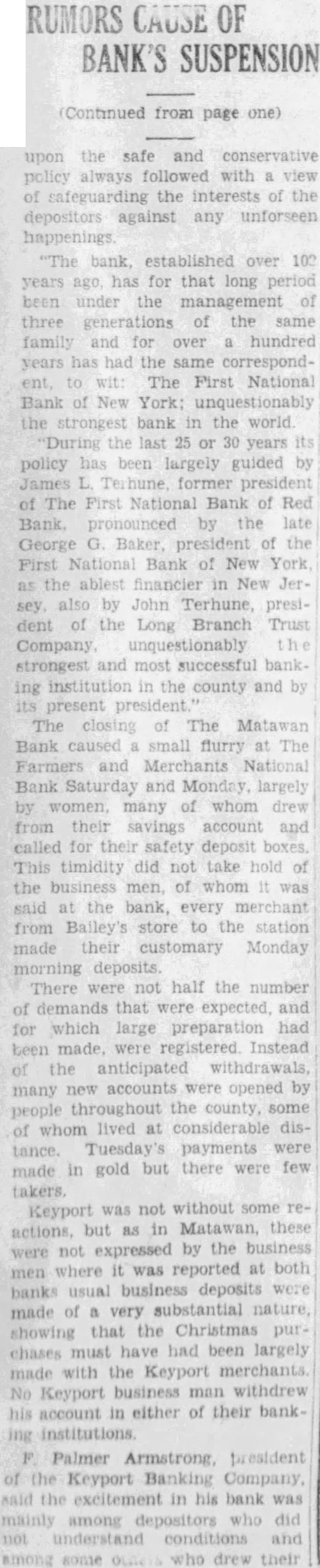 RUMORS CAUSE OF BANK'S SUSPENSION (Continued from page one) upon the safe and conservative policy always followed with a view of safeguarding the interests of the depositors against any unforseen happenings "The bank, established over 102 years ago has for that long period been under the management of three generations of the same family and for over a hundred years has had the same correspondent, to wit: The First National Bank of New York: unquestionably the strongest bank in the world During the last 25 or 30 years its policy has been largely guided by James L. Terhune, former president of The First National Bank of Red Bank. pronounced by the late George G Baker president of the First National Bank of New York as the ablest financier in New Jer. sey. also by John Terhune, president of the Long Branch Trust Company unquestionably the strongest and most successful bank. ing institution in the county and by its present president The closing of The Matawan Bank caused small flurry at The Farmers and Merchants National Bank Saturday and Monday, largely by women, many of whom drew from their savings account and called for their safety deposit boxes This timidity did not take hold of the business men, of whom It was said at the bank, every merchant from Balley's store to the station made their customary Monday morning deposits There were not half the number of demands that were expected, and for which large preparation had been made, were registered Instead of the anticipated withdrawals, many new accounts were opened by people throughout the county, some of whom lived at considerable distance. Tuesday's payments were made in gold but there were few Keyport was not without some reactions. but as in Matawan, these were not expressed by the business men where it was reported at both banks usual business deposits were made of a very substantial nature, showing that the Christmas purchases must have had been largely made with the Keyport merchants No Keyport business man withdrew his account in either of their bankF. Palmer Armstrong president of the Keyport Banking Company, said the excitement in his bank was mainly among depositors who did not understand conditions and among some OLIVE who drew their