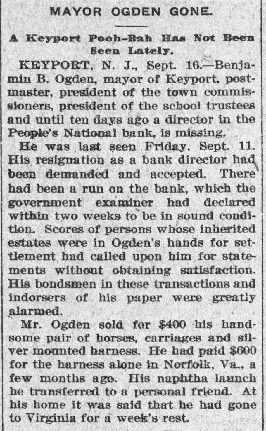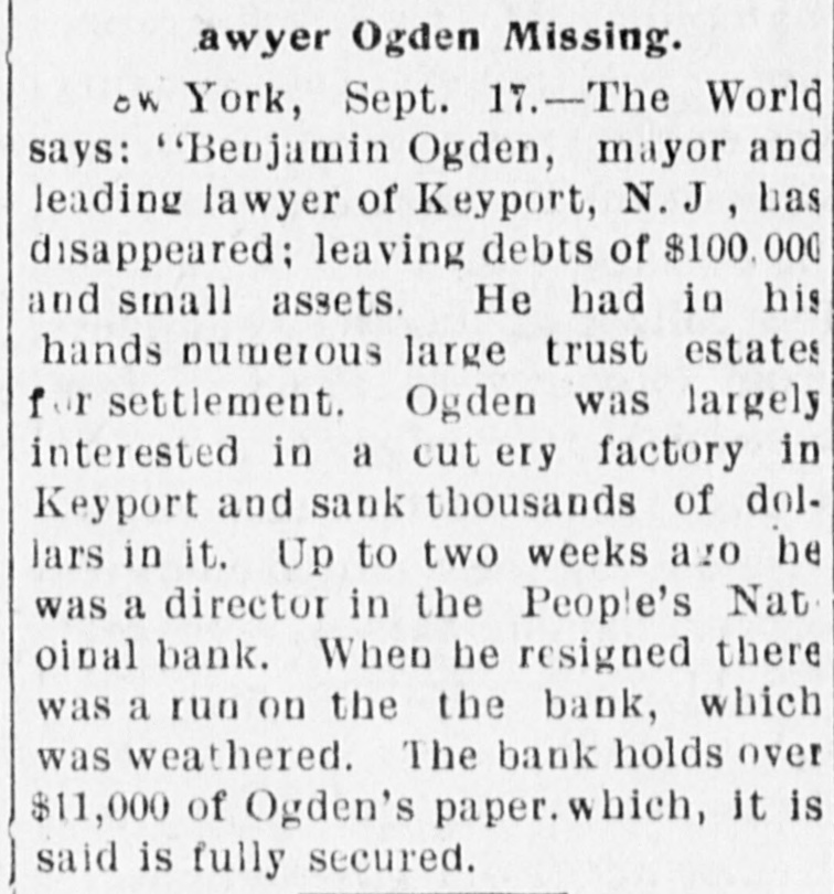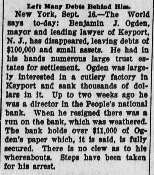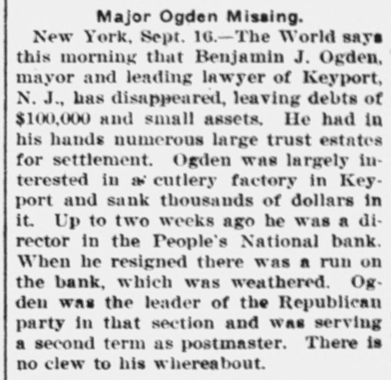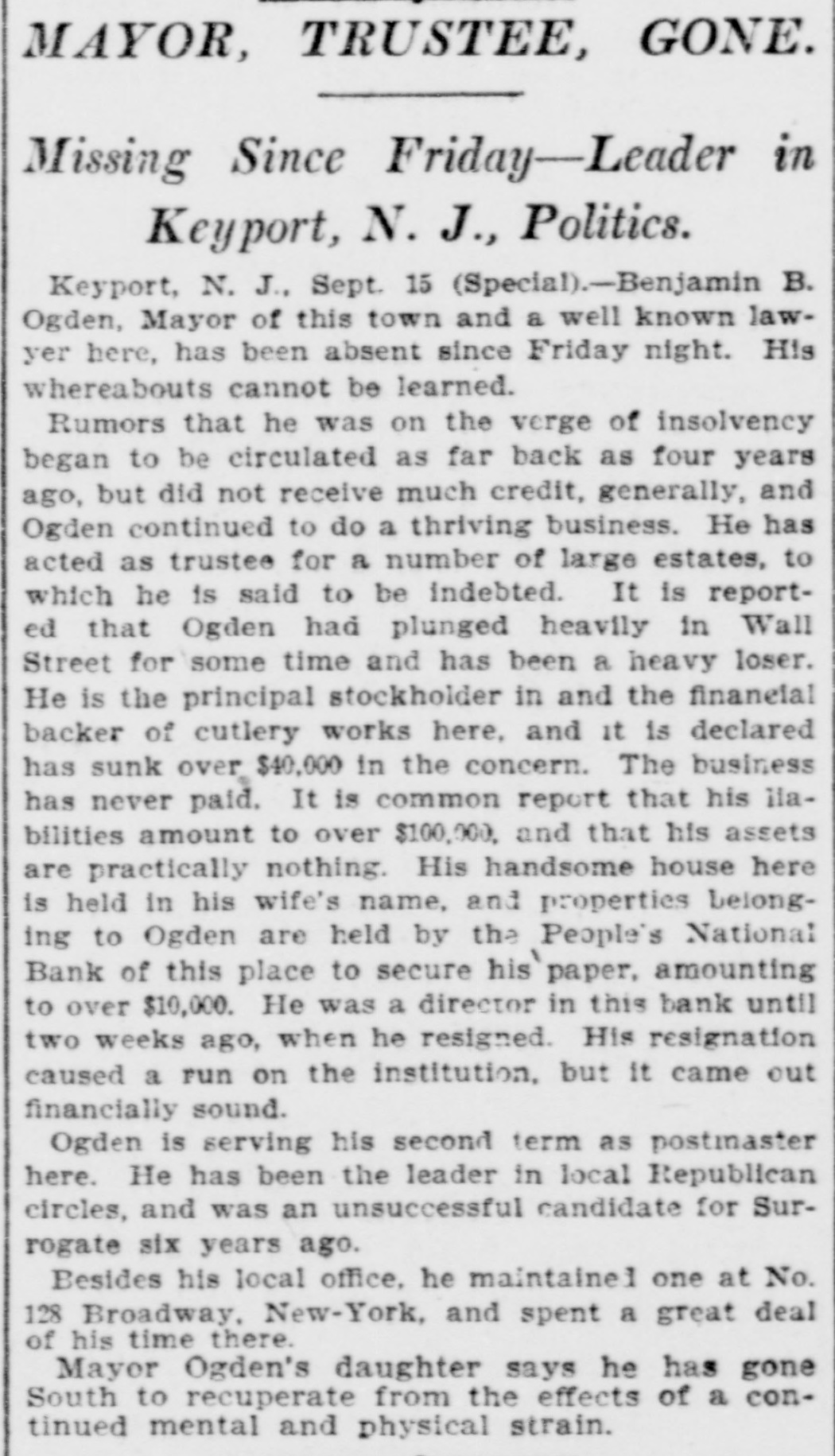 MAYOR, TRUSTEE, GONE. Missing Since Friday-Leader in Keyport, N. J., Politics. Keyport, N. J., Sept. 15 (Special).-Benjamin B. Ogden, Mayor of this town and a well known lawyer here, has been absent since Friday night. His whereabouts cannot be learned. Rumors that he was on the verge of insolvency began to be circulated as far back as four years ago, but did not receive much credit, generally, and Ogden continued to do a thriving business. He has acted as trustee for a number of large estates, to which he is said to be indebted. It is reported that Ogden had plunged heavily in Wall Street for some time and has been a heavy loser. He is the principal stockholder in and the financial backer of cutlery works here, and it is declared has sunk over $40,000 in the concern. The business has never paid. It is common report that his llabilities amount to over $100,000, and that his assets are practically nothing. His handsome house here is held in his wife's name, and properties belonging to Ogden are held by the People's National Bank of this place to secure his paper, amounting to over $10,000. He was a director in this bank until two weeks ago, when he resigned. His resignation caused a run on the institution, but it came out financially sound. Ogden is serving his second term as postinaster here. He has been the leader in local Republican circles, and was an unsuccessful candidate for Surrogate six years ago. Besides his local office, he maintained one at No. 128 Broadway, New-York, and spent a great deal of his time there. Mayor Ogden's daughter says he has gone South to recuperate from the effects of a continued mental and physical strain.