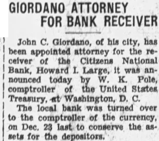 GIORDANO ATTORNEY FOR BANK RECEIVER John Giordano, of his city, has attorney for the receiver the Citizens Bank, Howard Large, announced today Pole, United States Treasury, at The bank turned over the comptroller of the 23 conserve the for the depositors.