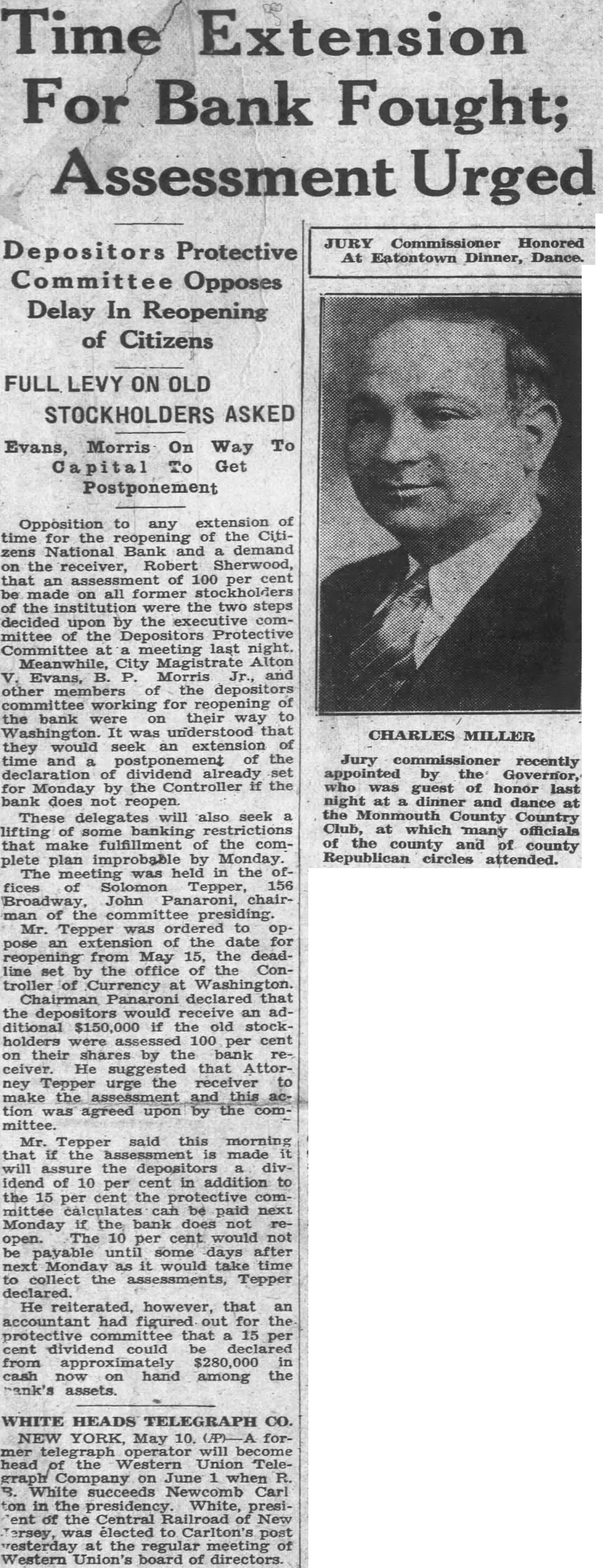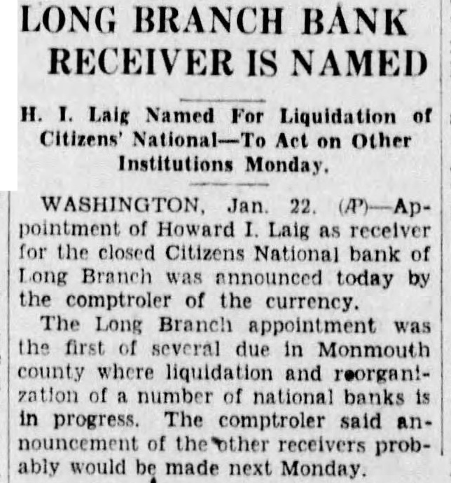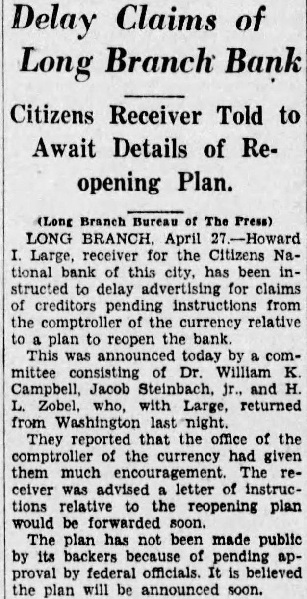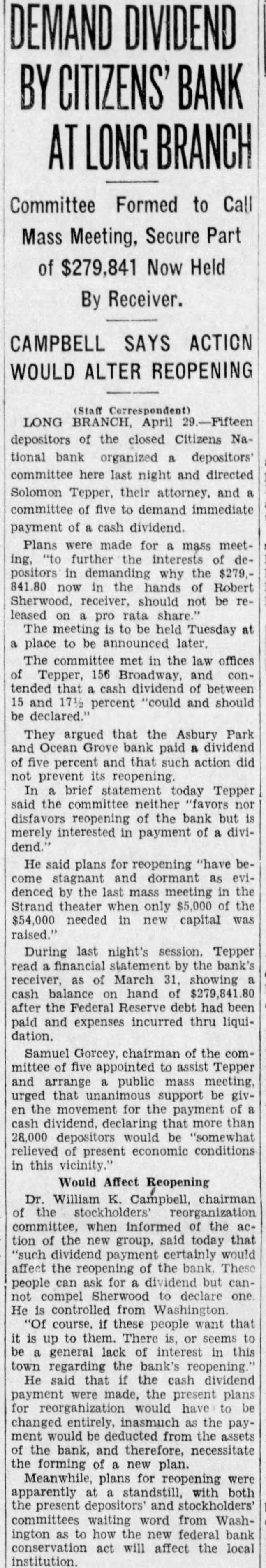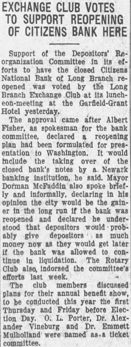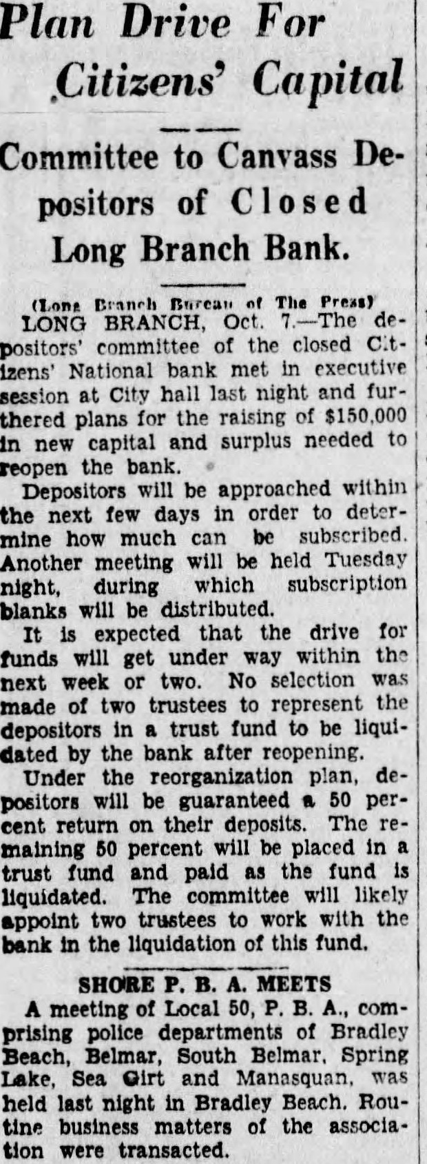 DUFFY GANGSTERS NATIONAL BANK RECEIVERS Grossman and Skale, Murder Witnesses, Men Arrested. FIND ONE WAS SLAIN WITH OTHER'S PISTOL Dec. (AP) Whether Sammy Grossman and Albert paid the gangland penalty for the Mickey their died fighting between themquestion for which police today sought an answer. today that the five bullets killed Albert last night came from pistol of Samuel Grosskilled almost instantly. He shot lice arrived the shooting his weapon. One cartridge was still ploded. fusillade of shots which rang out yesterday gambling den left slumped swivel chair his five his head. and Skale blood front window seriously wounded he died short gangsters been free in material witnesses in the Duffy which occurred in Atlantic City hotel summer. Six police are known have participated the garded some land execution. Five them are custody known authorHerman was being sought. Two those held, Harry Blum Raymond Boyne, hospital broken suffered leaping from the building in which the shooting occurred. The other three are Max Rice. keeper the gaming Whitey and Harry Silberberg, picked up Dying Involves Prisoner Both and the latter brother rival (Continued on Page Two) Considering Action For Three Institutions Closed Along Jersey Shore. EXAMINERS TO SUBMIT REPORT ON THE The work of rehabilitating suspended banks in the shore section going quietly today, With Comptroller John Pole considering the appointment of receivers for the national institutions and examiners of the state department banking and insurance ing thru the records of those under jurisdiction. The national banks are the Citizens National Long Branch: National Bradley and the Ocean Grove National The thoro examination of all books exhaustive task, pointed out especially the case the Asbury Park Ocean Grove and unlikely that the state examiners submit report Commissioner Frank Smith several board its conferences with view definite plan which may presented with the ports the examiners for the considerthe Deposits shore including funds which had been from various mount high and many banks were busy with new accounts. Pole Considers Appointments pointment receivers for three nationbanks in county by the comptroller the currency is expected within few At the office Comptroller Pole It (Continued on Page Two)