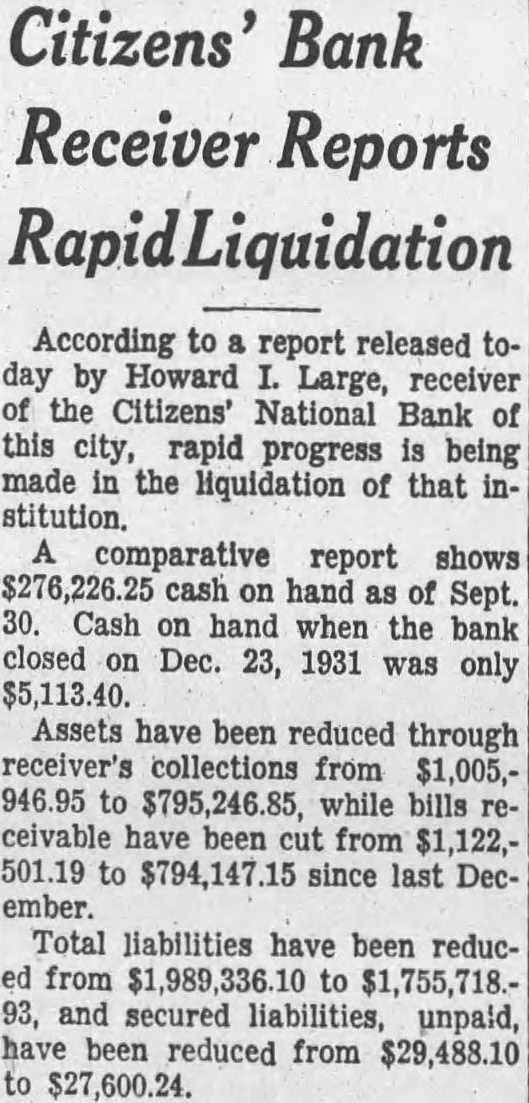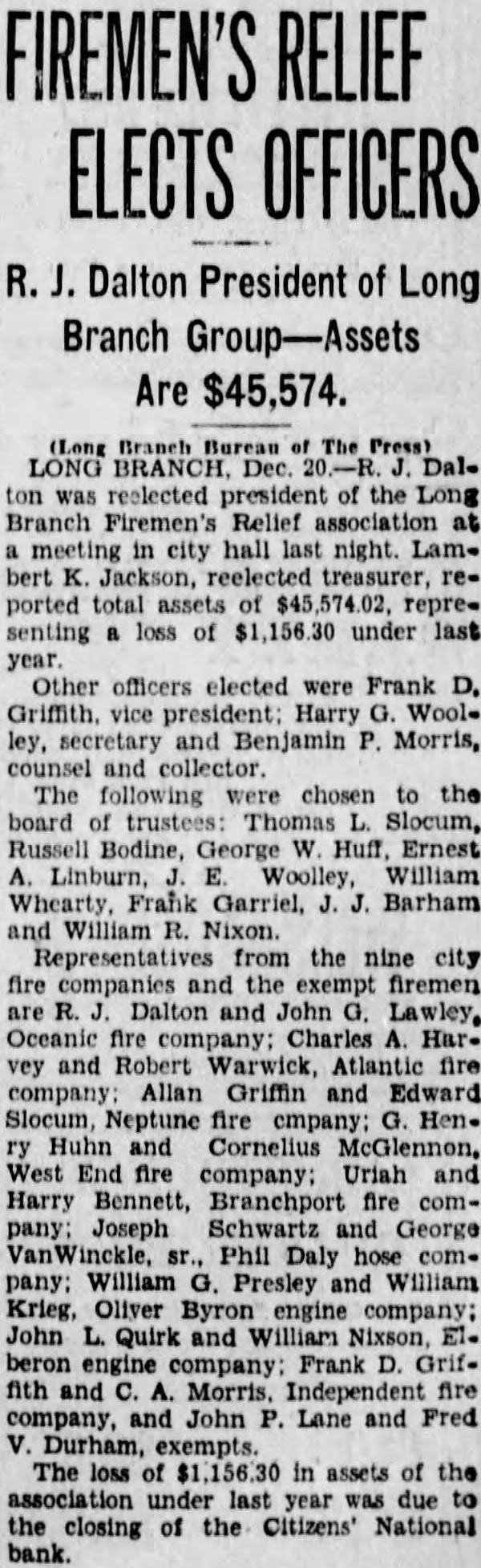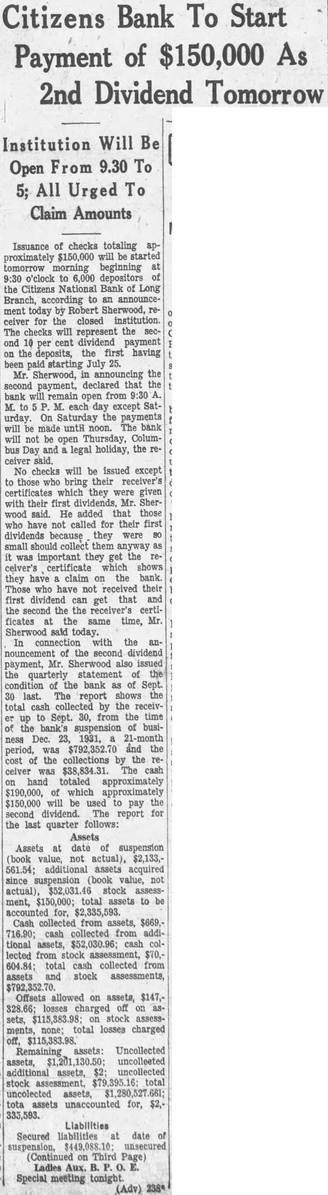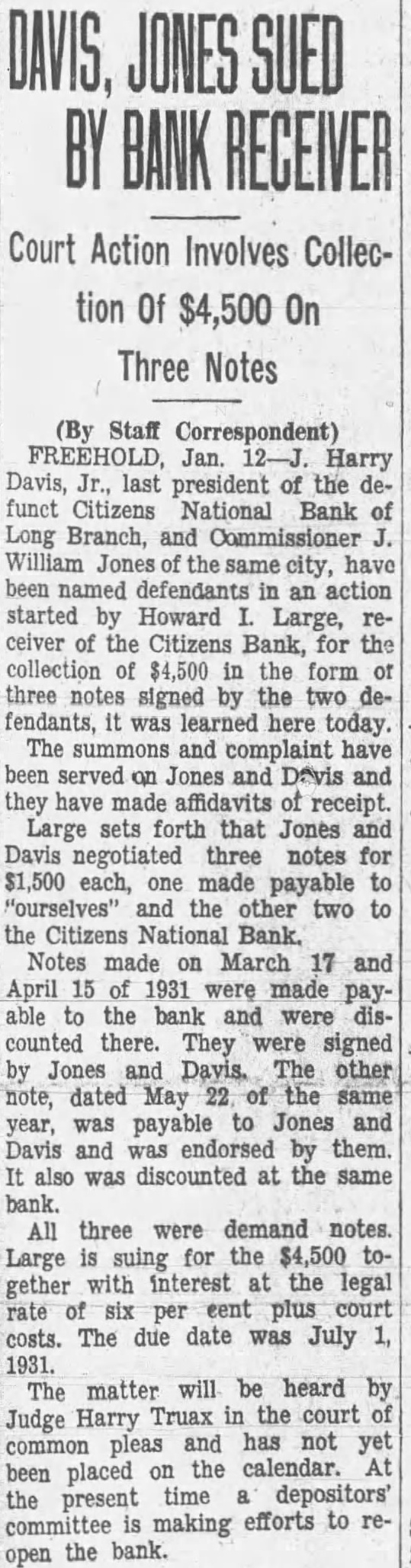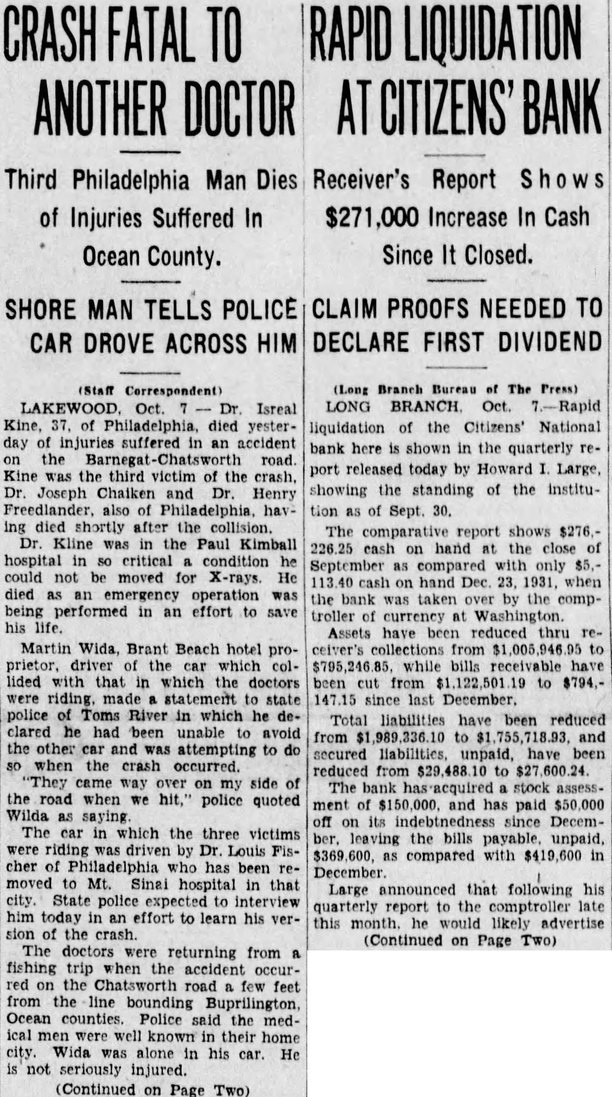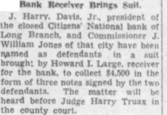 DUFFY GANGSTERS NATIONAL BANK RECEIVERS Grossman and Skale, Murder Witnesses, Men Arrested. FIND ONE WAS SLAIN WITH OTHER'S PISTOL Dec. (AP) Whether Sammy Grossman and Albert paid the gangland penalty for the Mickey their died fighting between themquestion for which police today sought an answer. today that the five bullets killed Albert last night came from pistol of Samuel Grosskilled almost instantly. He shot lice arrived the shooting his weapon. One cartridge was still ploded. fusillade of shots which rang out yesterday gambling den left slumped swivel chair his five his head. and Skale blood front window seriously wounded he died short gangsters been free in material witnesses in the Duffy which occurred in Atlantic City hotel summer. Six police are known have participated the garded some land execution. Five them are custody known authorHerman was being sought. Two those held, Harry Blum Raymond Boyne, hospital broken suffered leaping from the building in which the shooting occurred. The other three are Max Rice. keeper the gaming Whitey and Harry Silberberg, picked up Dying Involves Prisoner Both and the latter brother rival (Continued on Page Two) Considering Action For Three Institutions Closed Along Jersey Shore. EXAMINERS TO SUBMIT REPORT ON THE The work of rehabilitating suspended banks in the shore section going quietly today, With Comptroller John Pole considering the appointment of receivers for the national institutions and examiners of the state department banking and insurance ing thru the records of those under jurisdiction. The national banks are the Citizens National Long Branch: National Bradley and the Ocean Grove National The thoro examination of all books exhaustive task, pointed out especially the case the Asbury Park Ocean Grove and unlikely that the state examiners submit report Commissioner Frank Smith several board its conferences with view definite plan which may presented with the ports the examiners for the considerthe Deposits shore including funds which had been from various mount high and many banks were busy with new accounts. Pole Considers Appointments pointment receivers for three nationbanks in county by the comptroller the currency is expected within few At the office Comptroller Pole It (Continued on Page Two)